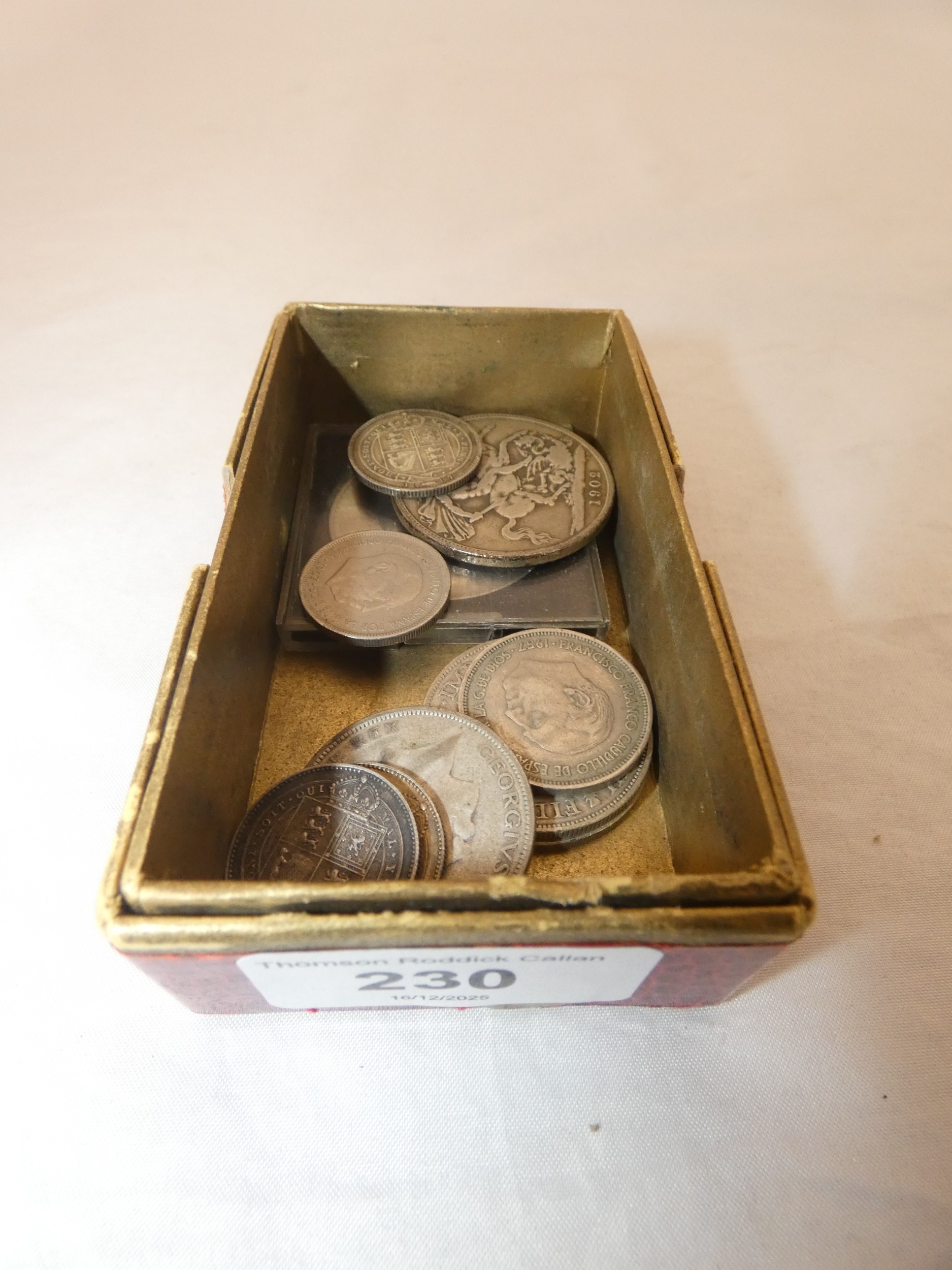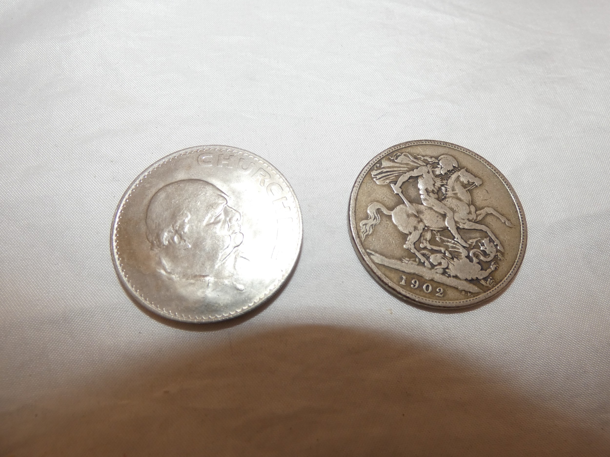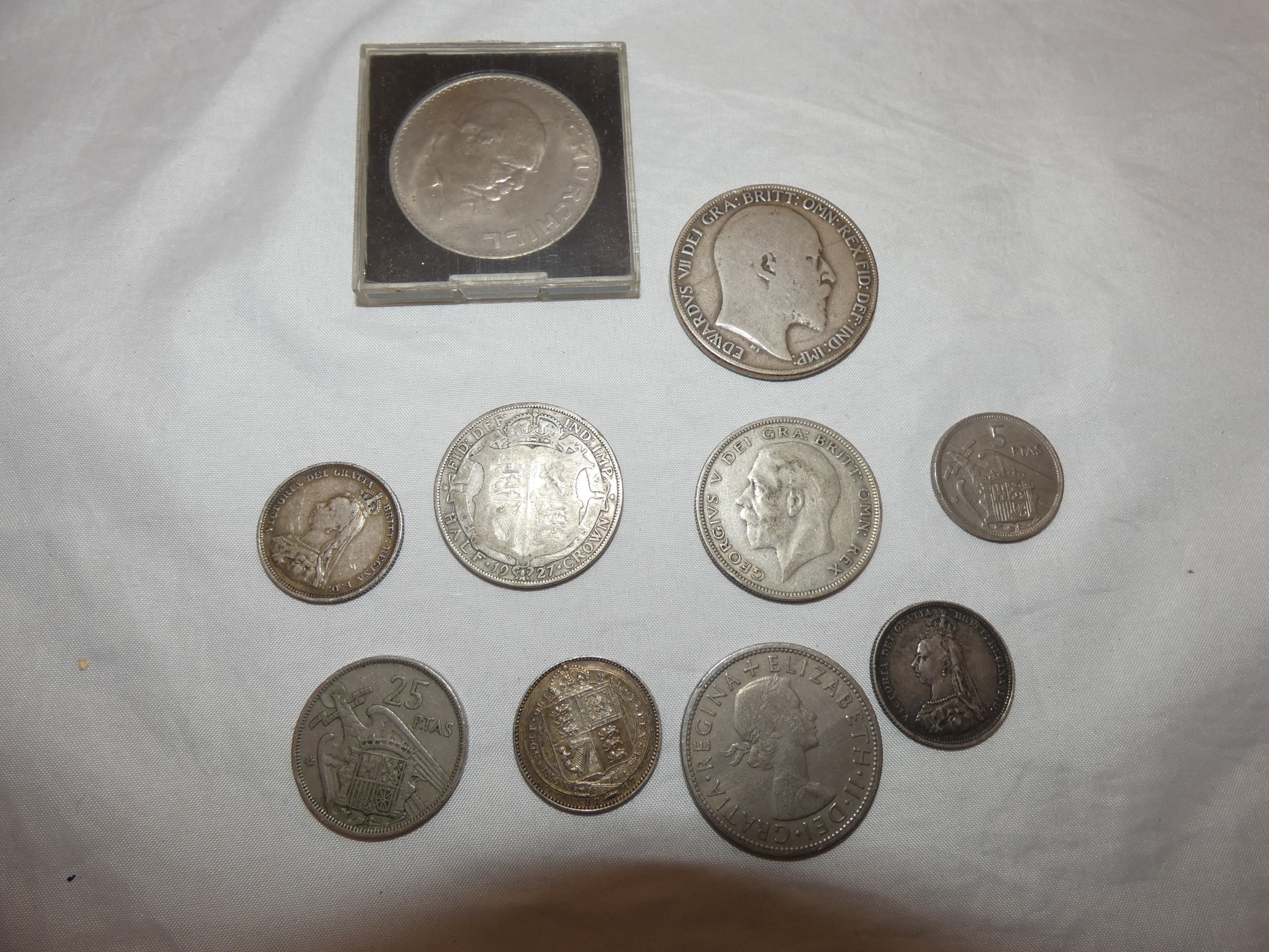 Edward VII 1902 silver crown, three small Victorian silver coins, 44g gross, and later coins, commemorative Churchill coin etc.