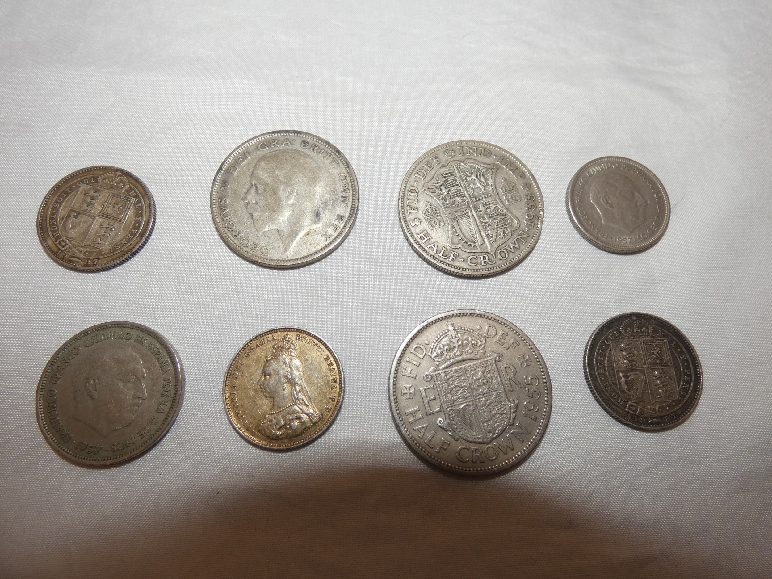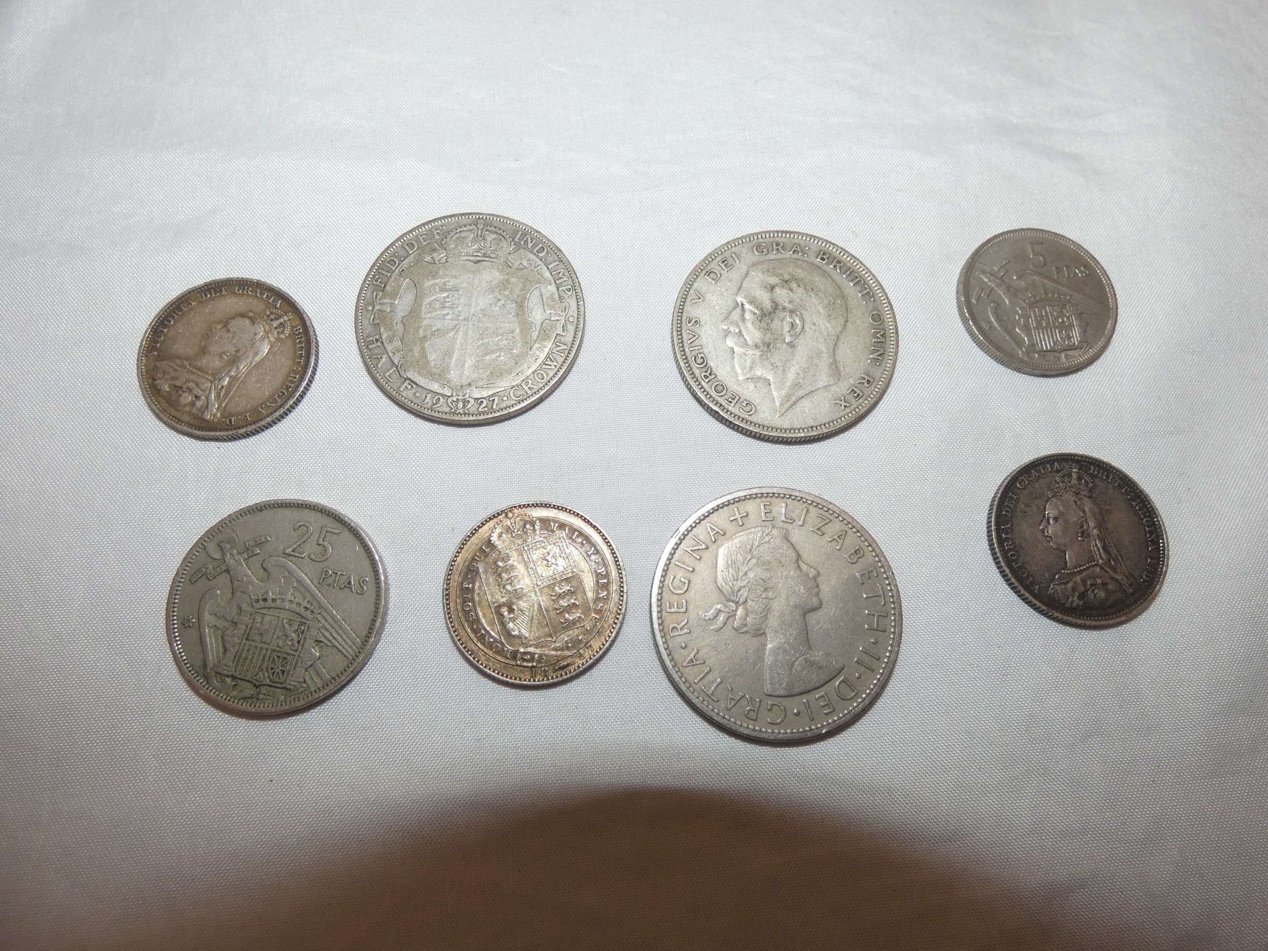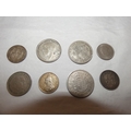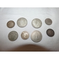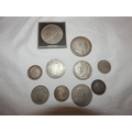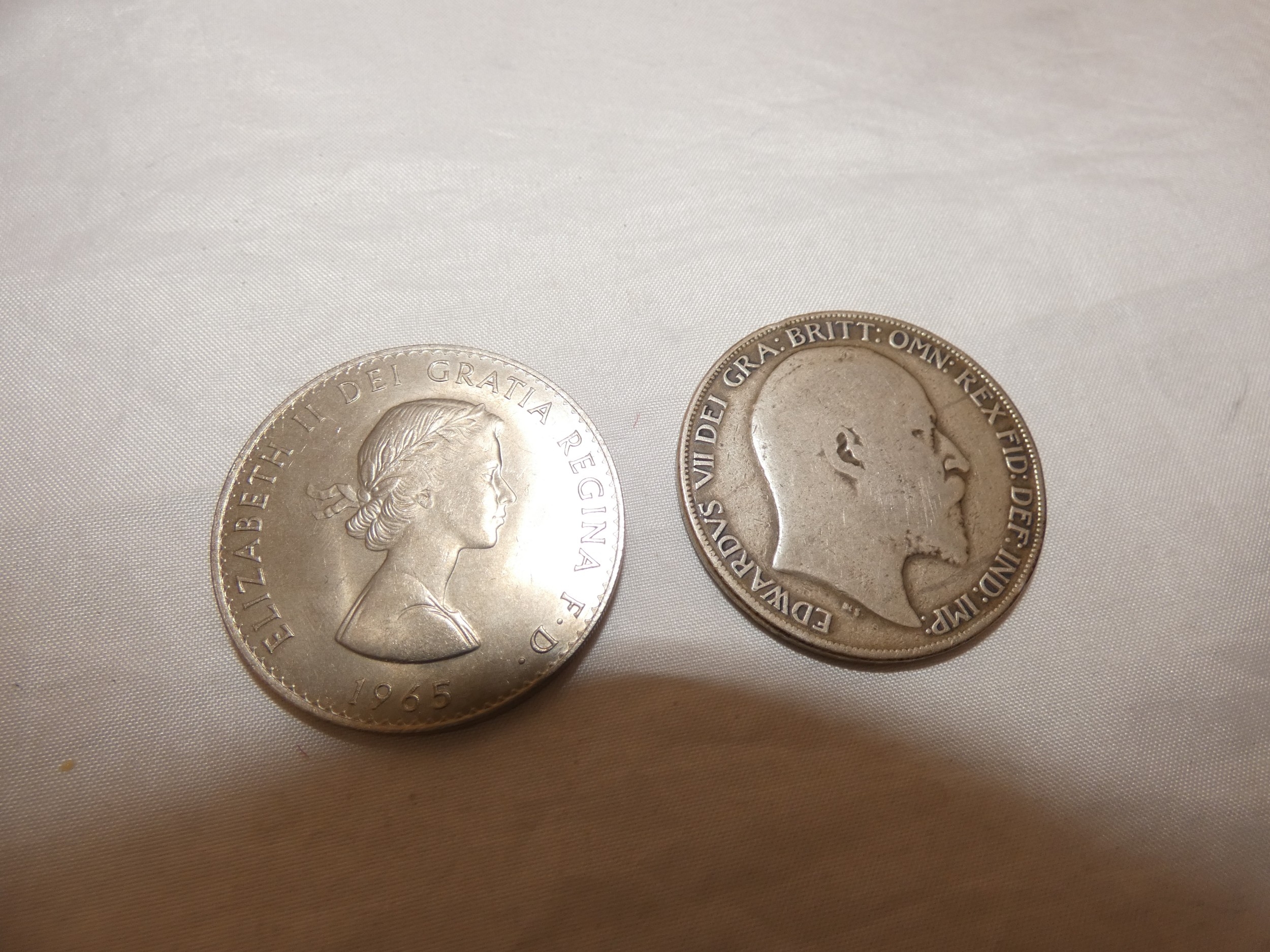 Edward VII 1902 silver crown, three small Victorian silver coins, 44g gross, and later coins, commemorative Churchill coin etc.
