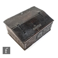 A 17th Century oak lap desk, the interior enclosed by a sloped front and carved with the date 1658 and initialled ID, iron lock and hinges, width 69.5cm.
