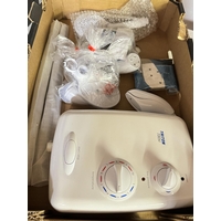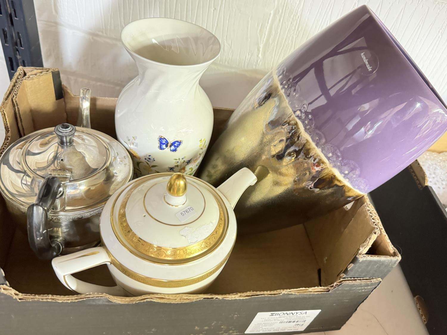 BOX OF ITEMS INCL PLATED TEA POT & AYNSLEY VASE