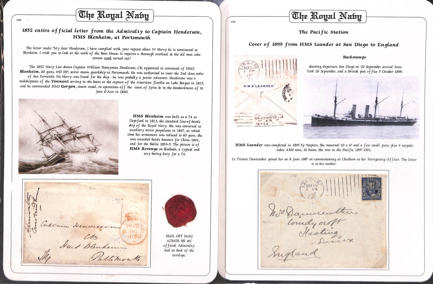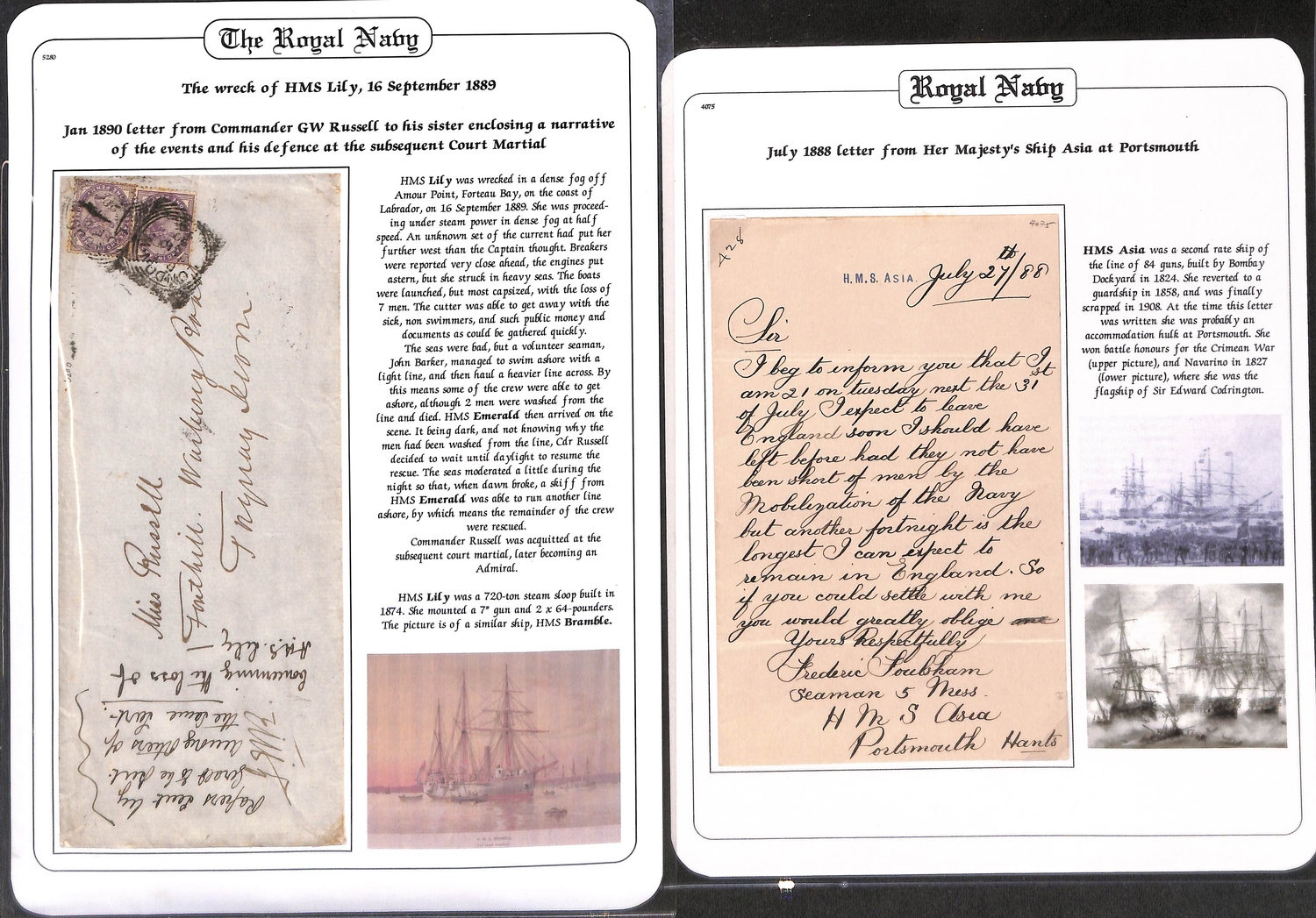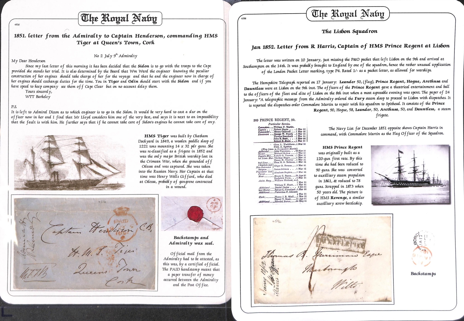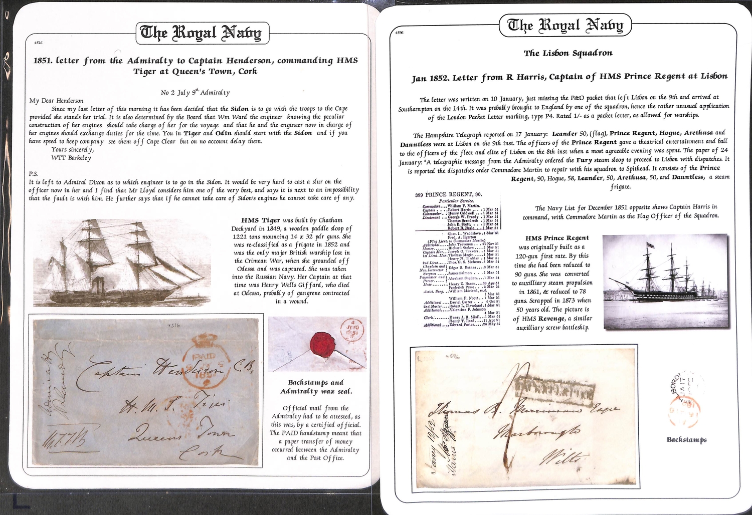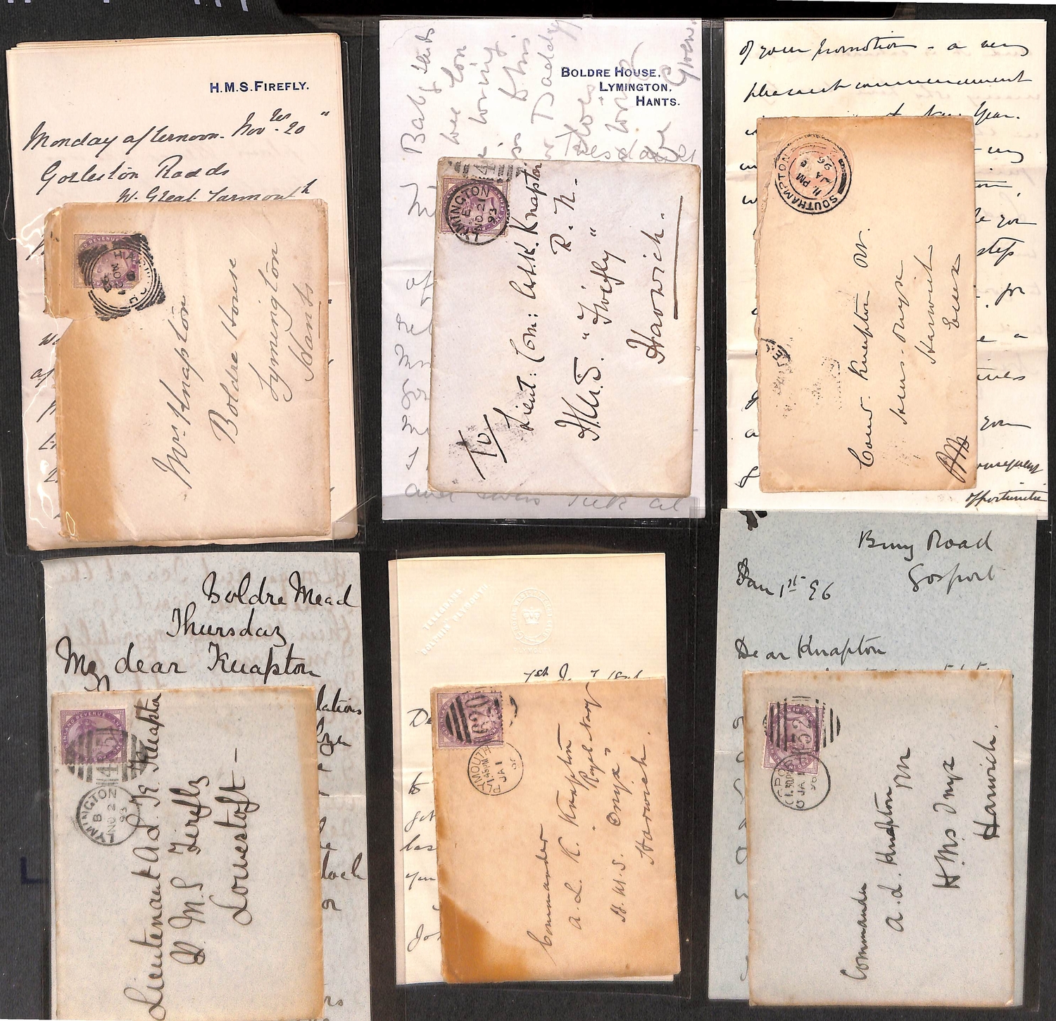 1851-1900 Covers, cards, letters and ephemera including official Admiralty envelopes to H.M.S "Tiger" or "Blenheim"; 1852 stampless cover with enclosed letter from H.M.S "Prince Regent" at Lisbon charged 1/- with boxed "PACKET LETTER"; 1862 Admiralty envelope signed by the Duke of Somerset, Lord High Admiral; 1871 cover with H.M.S "Lord Warden" crest posted at Gibraltar franked 6d; 1890 cover from Commander G.W Russell with enclosed narrative of the loss of H.M.S "Lily" and his defence at the subsequent Court Martial where he was acquitted (later becoming an Admiral); covers (with letters) to or from Commander Knapton mainly on H.M.S "Firefly" or "Onyx" (20); various other covers to or from naval ships (13); 1856 appointment of Arthur Douglas to rank of retired Captain with the lowest rate of half pay allowed to a Captain, etc. (42).