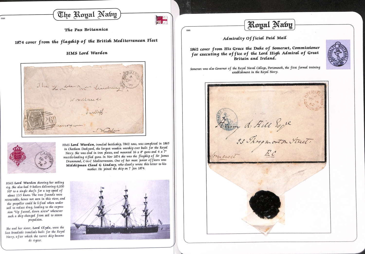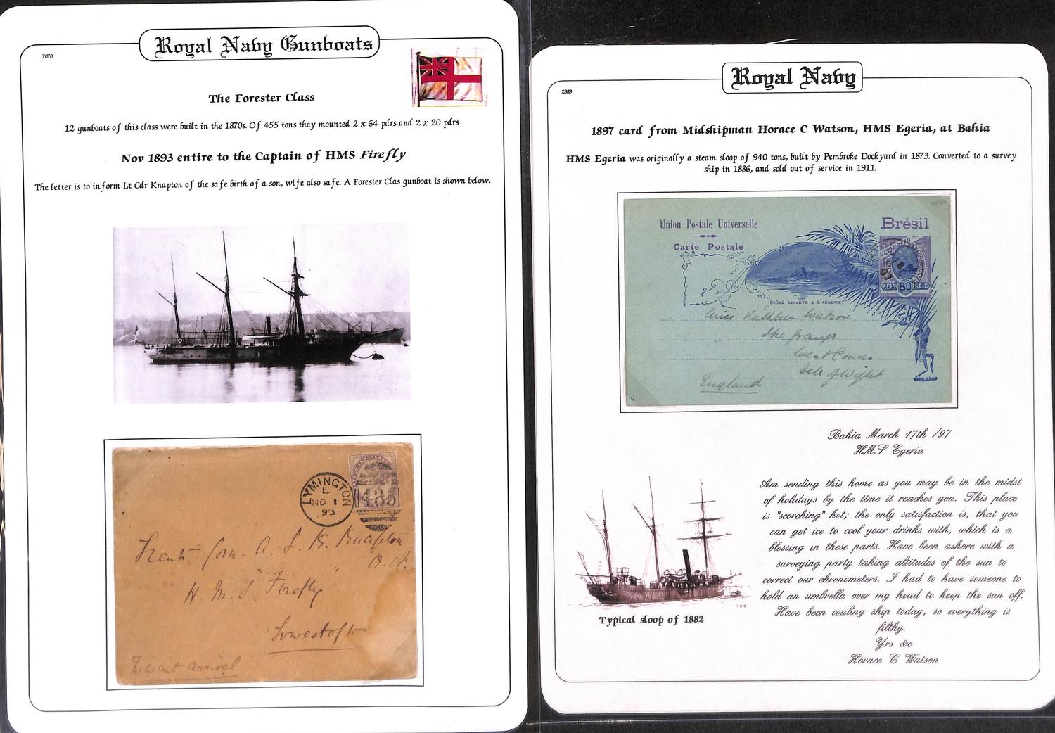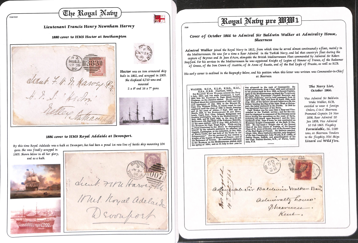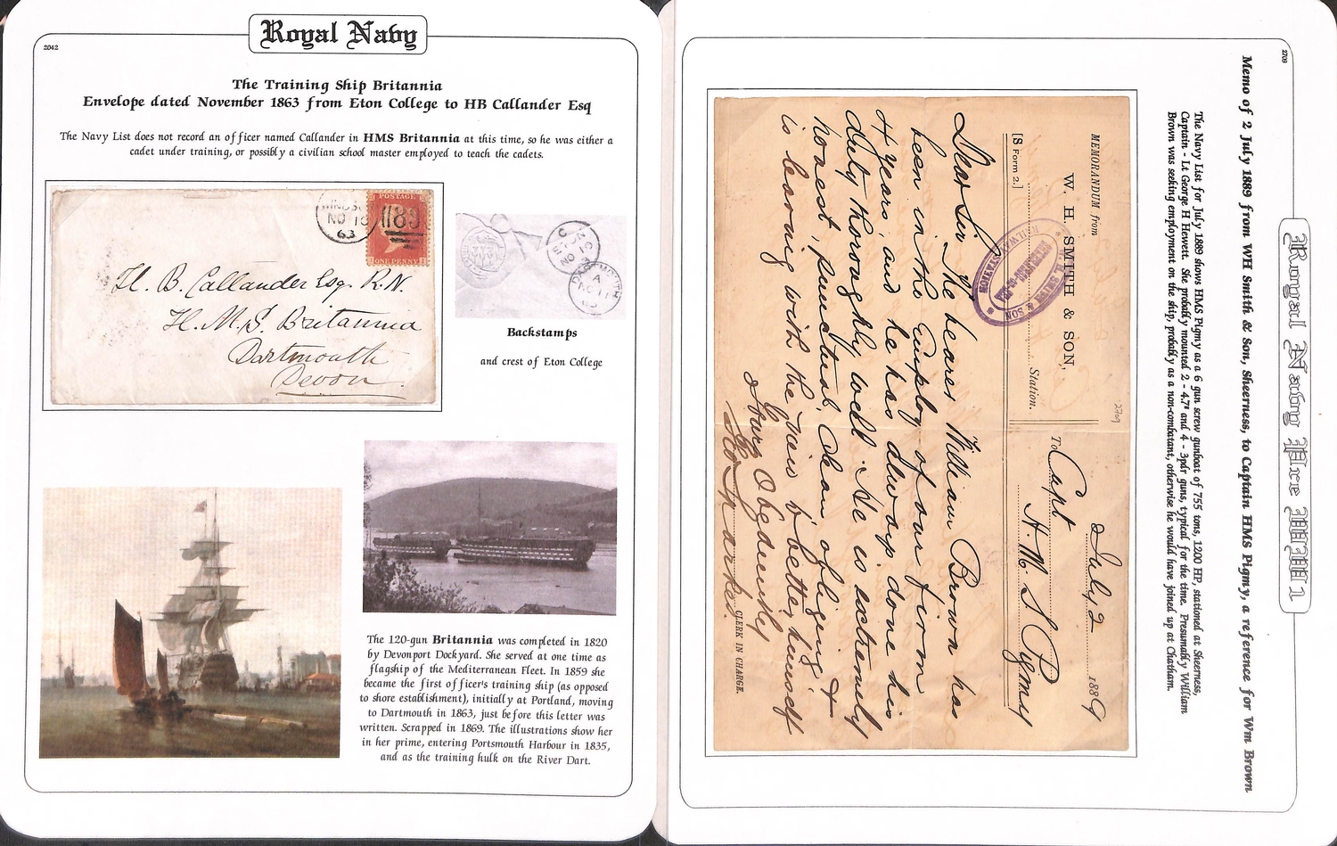 1851-1900 Covers, cards, letters and ephemera including official Admiralty envelopes to H.M.S "Tiger" or "Blenheim"; 1852 stampless cover with enclosed letter from H.M.S "Prince Regent" at Lisbon charged 1/- with boxed "PACKET LETTER"; 1862 Admiralty envelope signed by the Duke of Somerset, Lord High Admiral; 1871 cover with H.M.S "Lord Warden" crest posted at Gibraltar franked 6d; 1890 cover from Commander G.W Russell with enclosed narrative of the loss of H.M.S "Lily" and his defence at the subsequent Court Martial where he was acquitted (later becoming an Admiral); covers (with letters) to or from Commander Knapton mainly on H.M.S "Firefly" or "Onyx" (20); various other covers to or from naval ships (13); 1856 appointment of Arthur Douglas to rank of retired Captain with the lowest rate of half pay allowed to a Captain, etc. (42).