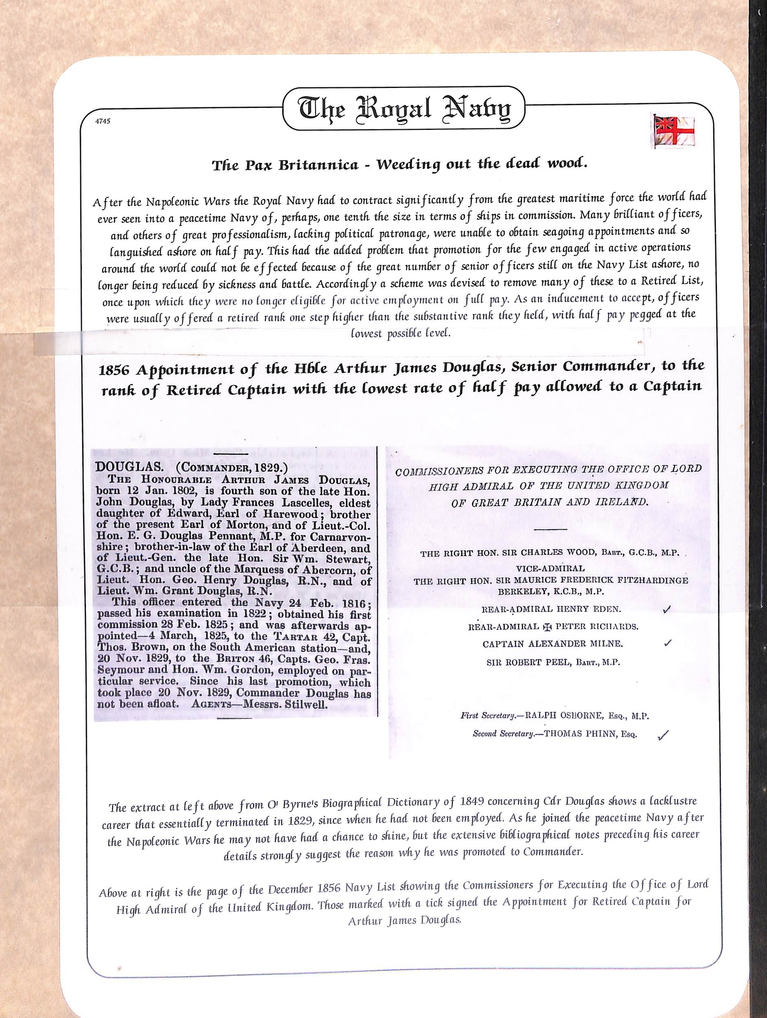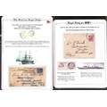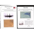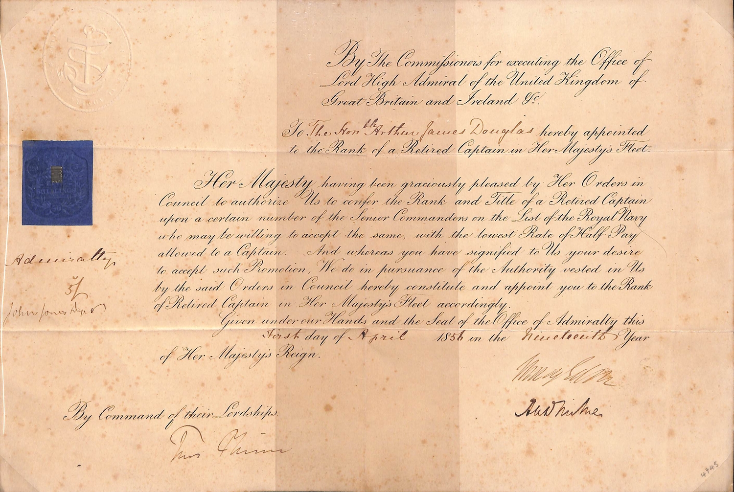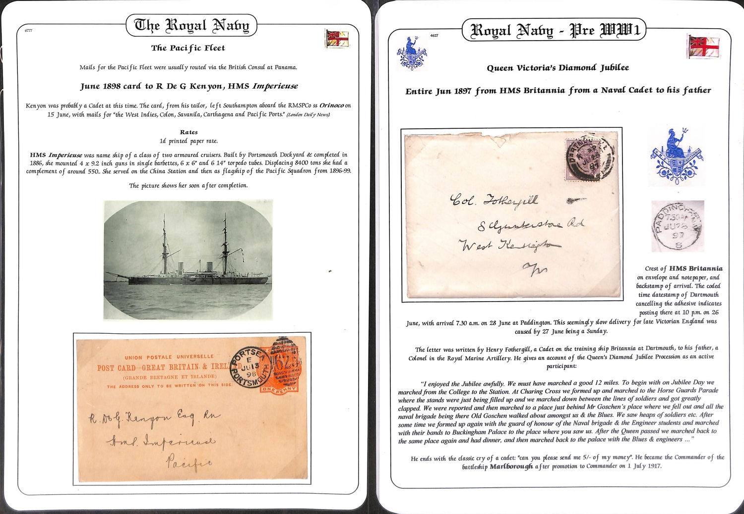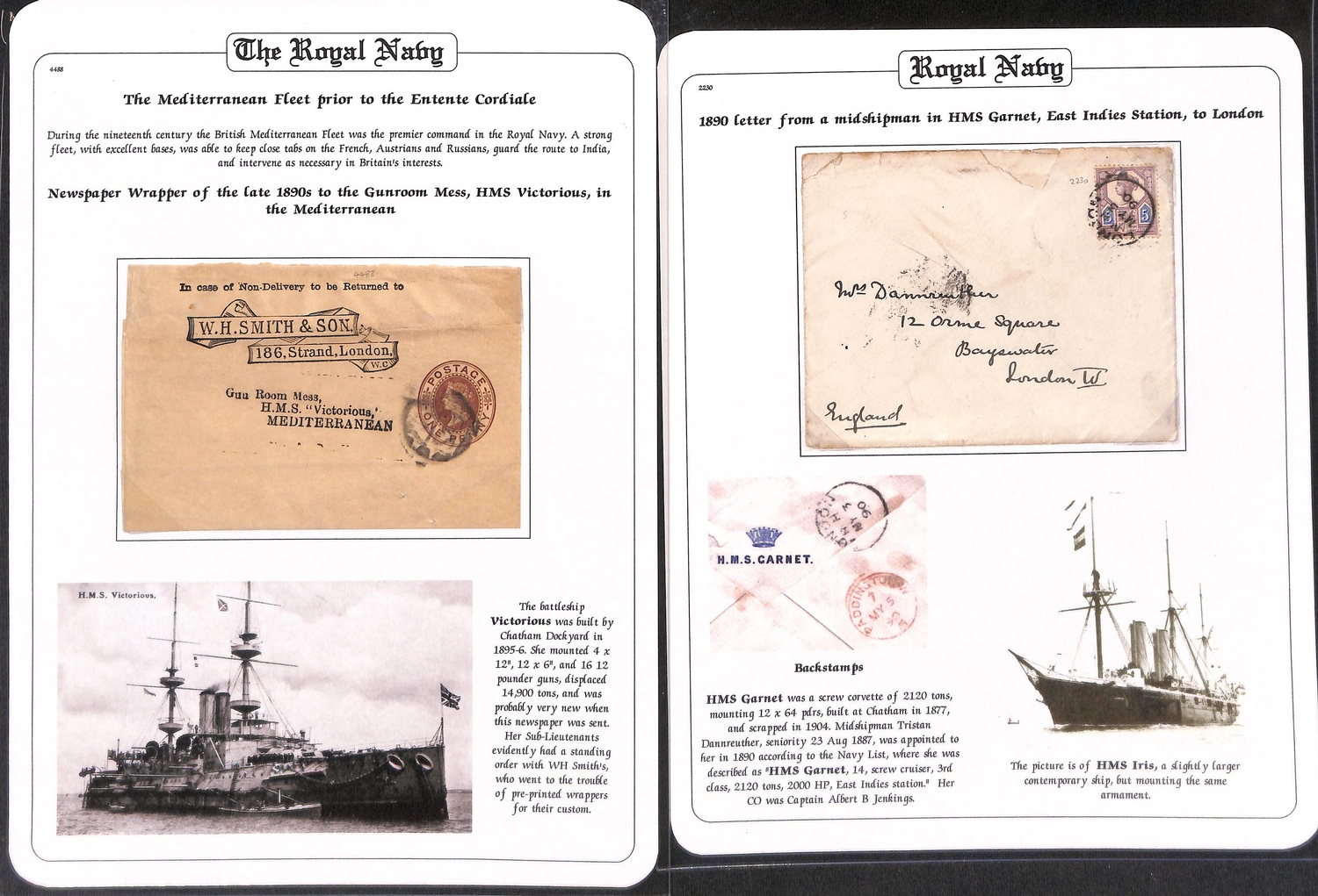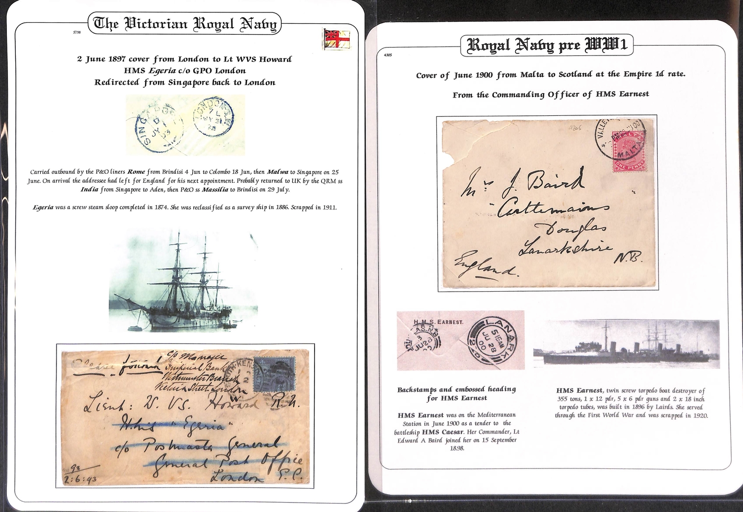 1851-1900 Covers, cards, letters and ephemera including official Admiralty envelopes to H.M.S "Tiger" or "Blenheim"; 1852 stampless cover with enclosed letter from H.M.S "Prince Regent" at Lisbon charged 1/- with boxed "PACKET LETTER"; 1862 Admiralty envelope signed by the Duke of Somerset, Lord High Admiral; 1871 cover with H.M.S "Lord Warden" crest posted at Gibraltar franked 6d; 1890 cover from Commander G.W Russell with enclosed narrative of the loss of H.M.S "Lily" and his defence at the subsequent Court Martial where he was acquitted (later becoming an Admiral); covers (with letters) to or from Commander Knapton mainly on H.M.S "Firefly" or "Onyx" (20); various other covers to or from naval ships (13); 1856 appointment of Arthur Douglas to rank of retired Captain with the lowest rate of half pay allowed to a Captain, etc. (42).