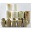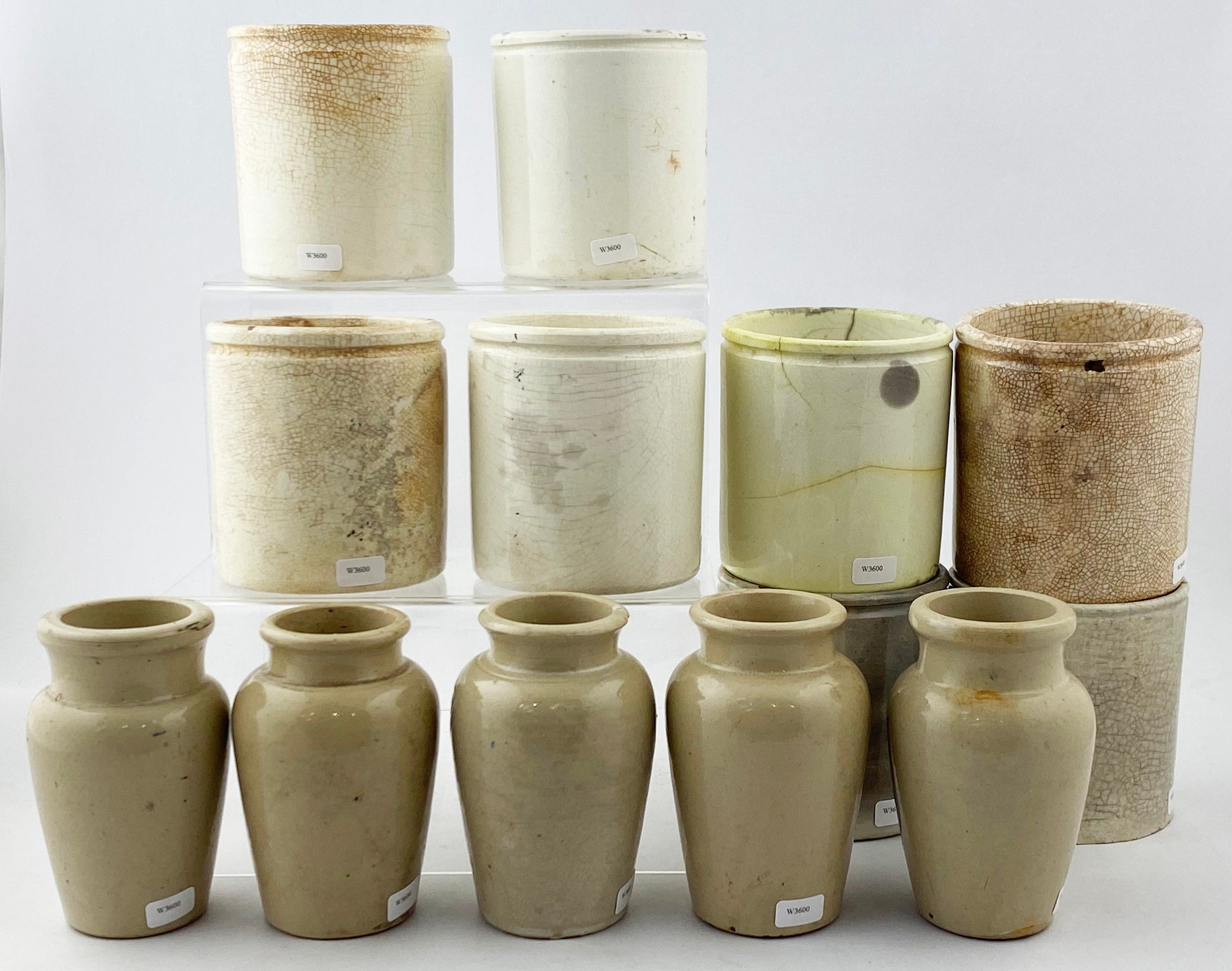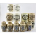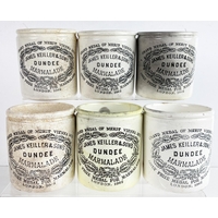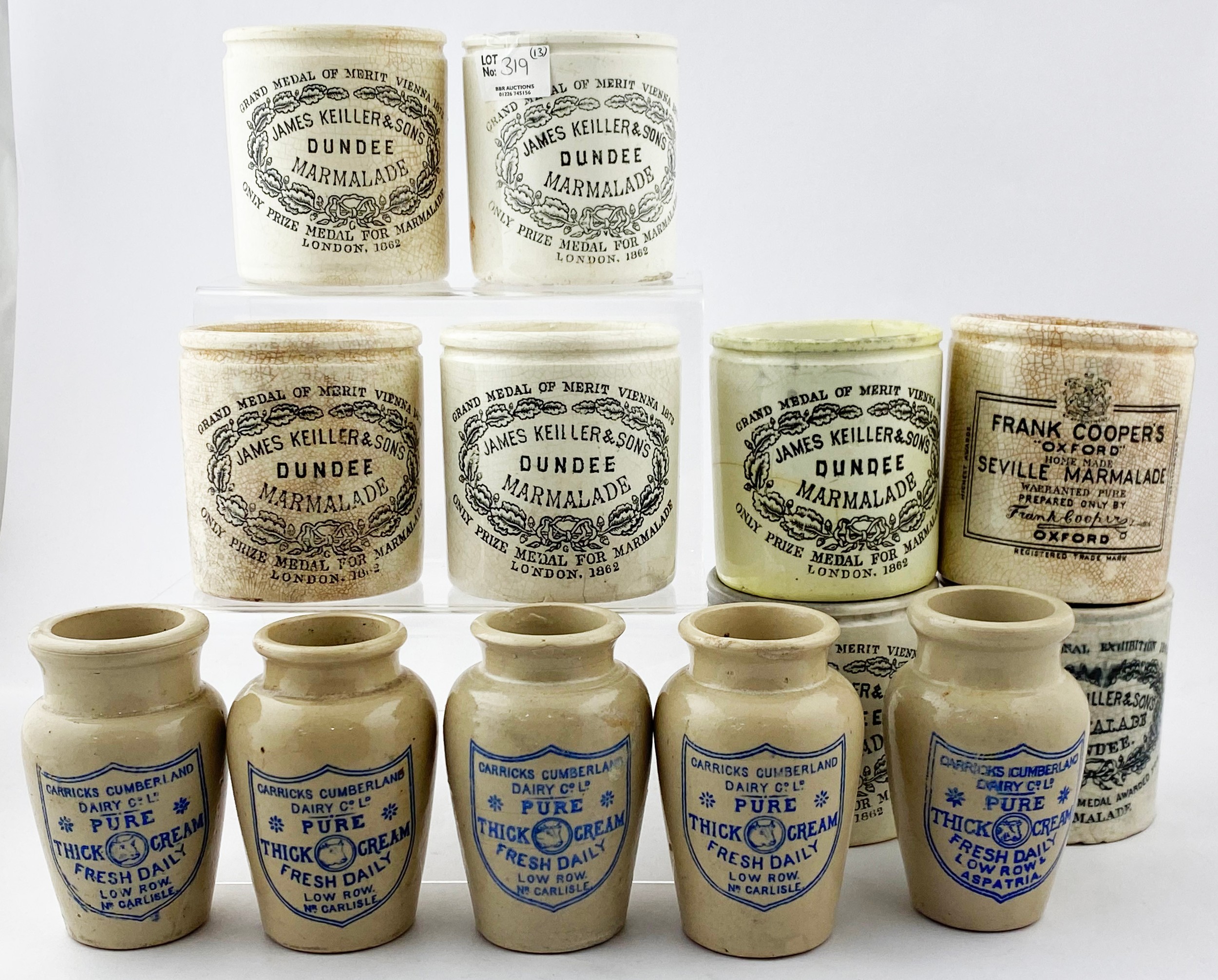 MARMALADE & CREAMS GROUP. Tallest 4.25ins. James Keiller & Frank Coopers Marmaldes plus Carricks blue transferred creams. Stained & damages. (13)