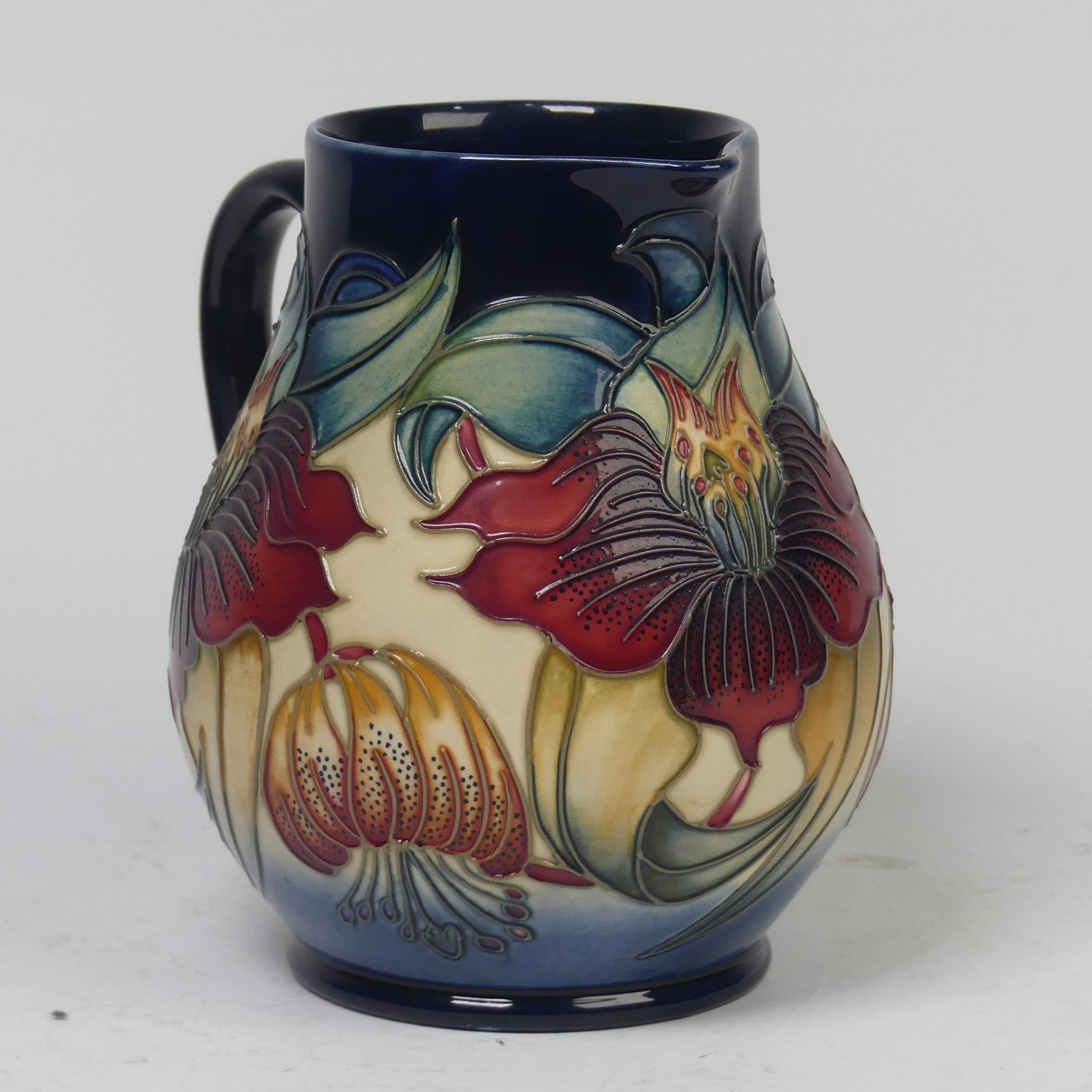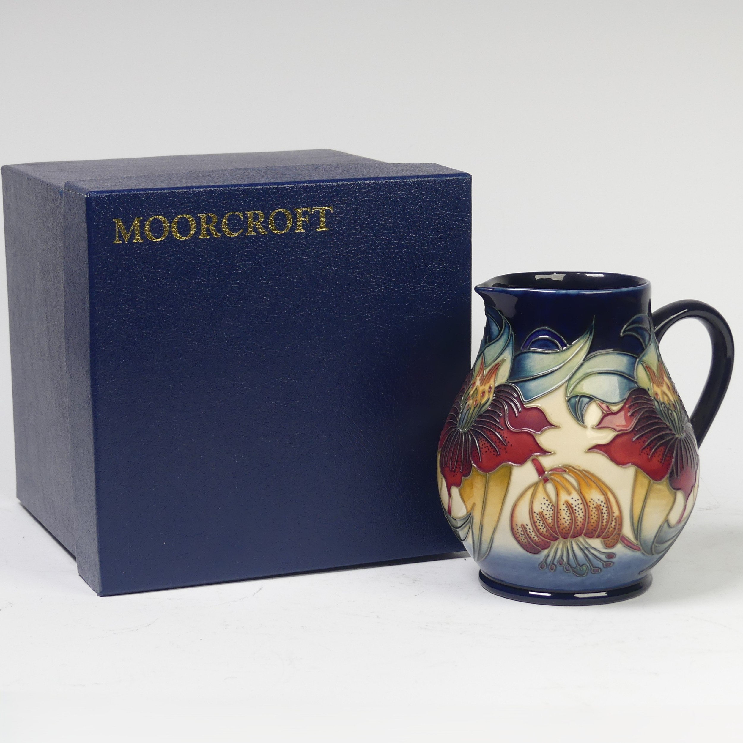 A Moorcroft Pottery ‘Anna Lily’ pattern Jug, by Nicola Slaney, 20th century, marks to base, 15cm high, boxed.