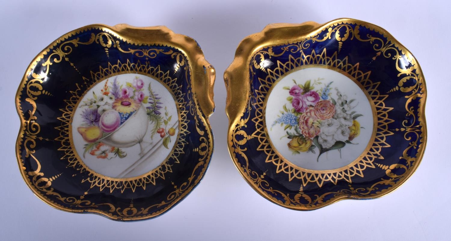 EARLY 19TH C. COALPORT FINE PAIR OF SHELL SHAPED DISHES PAINTED WITH FLOWERS. 22cm diameter. 5cm high, 20cm long (2)