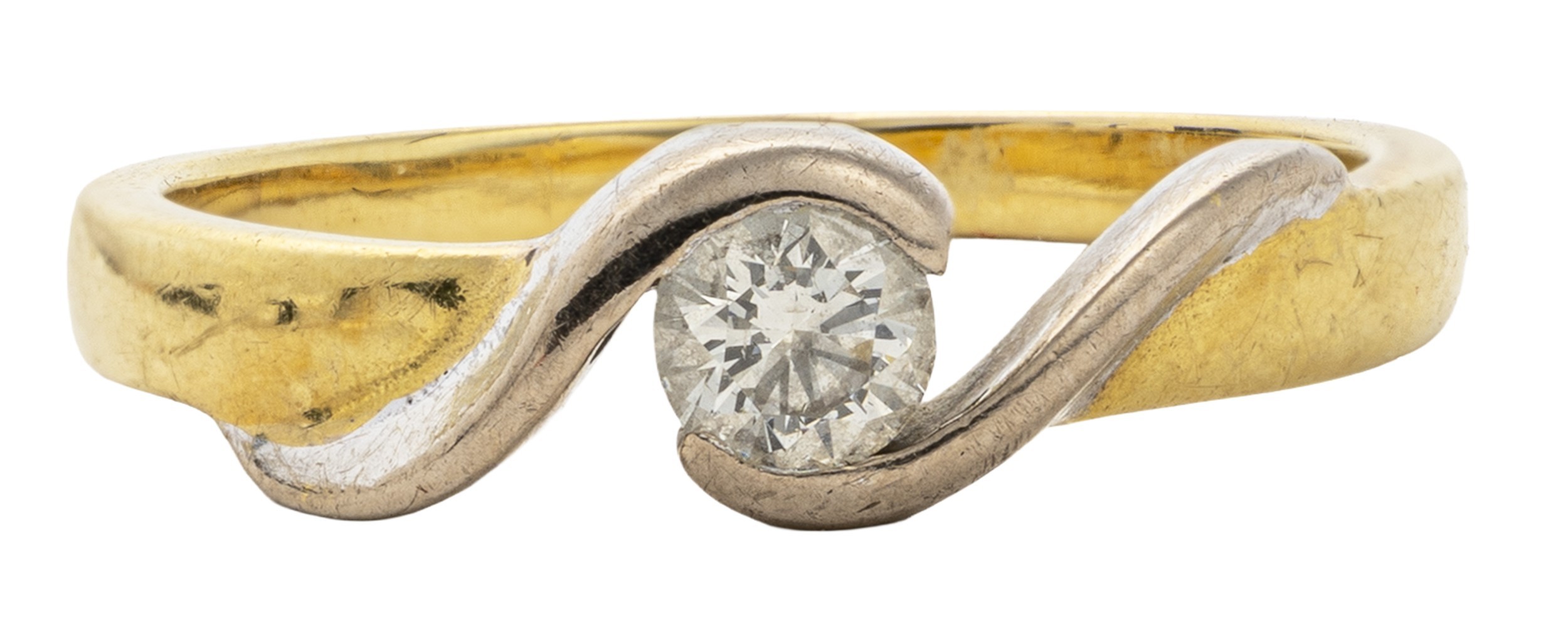 Bezel set to the centre with a round brilliant cut diamond weighing 0.20 carats, colour G, clarity VS, in 18ct white and yellow gold, size J, 3,2g all in