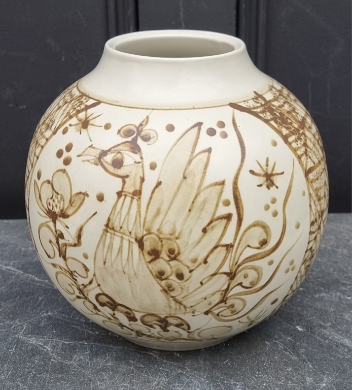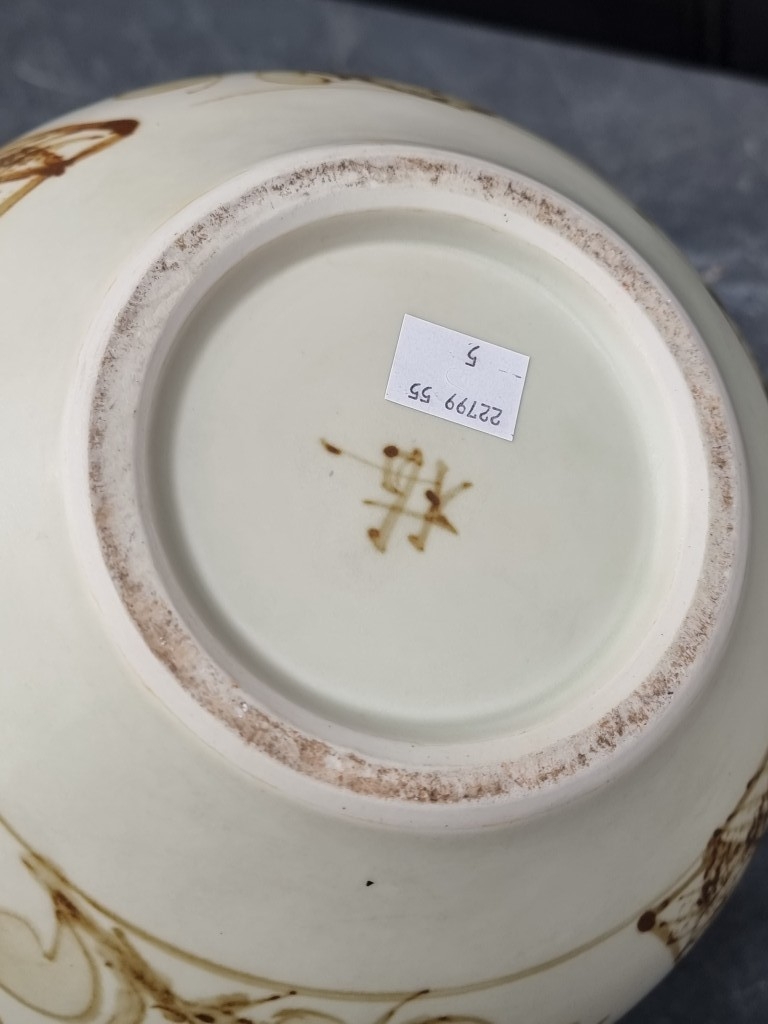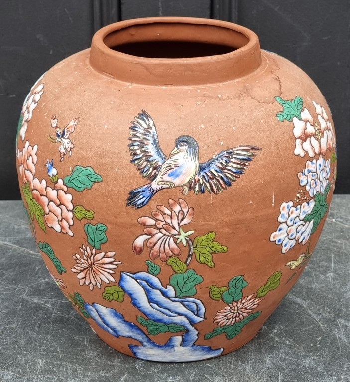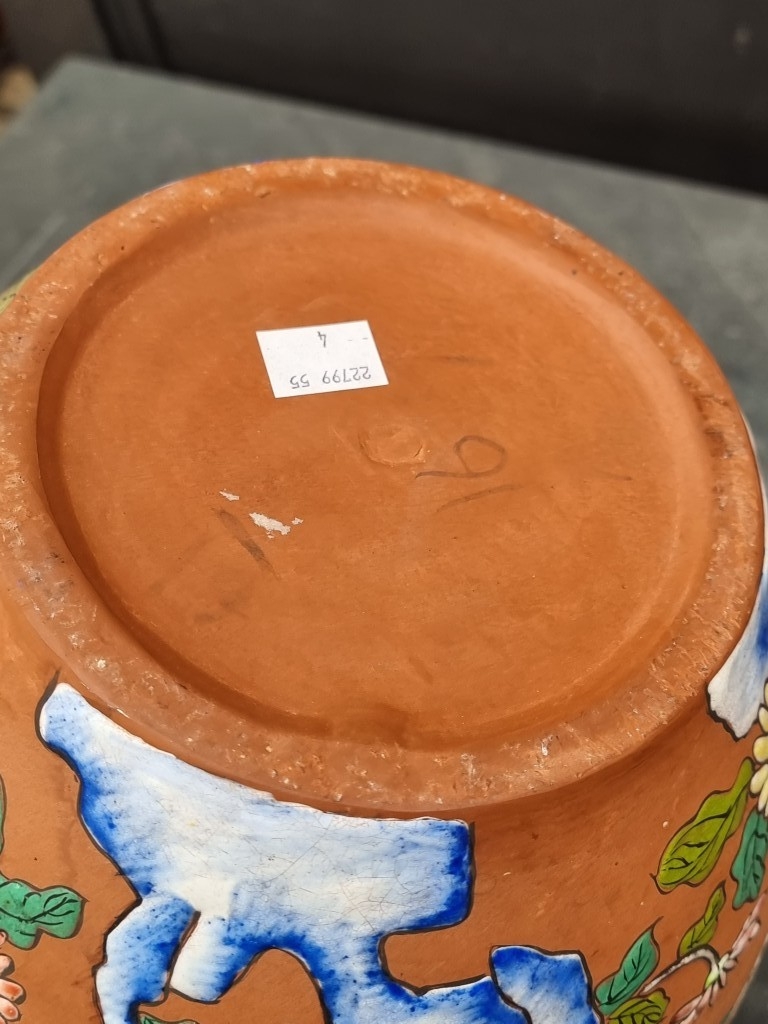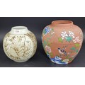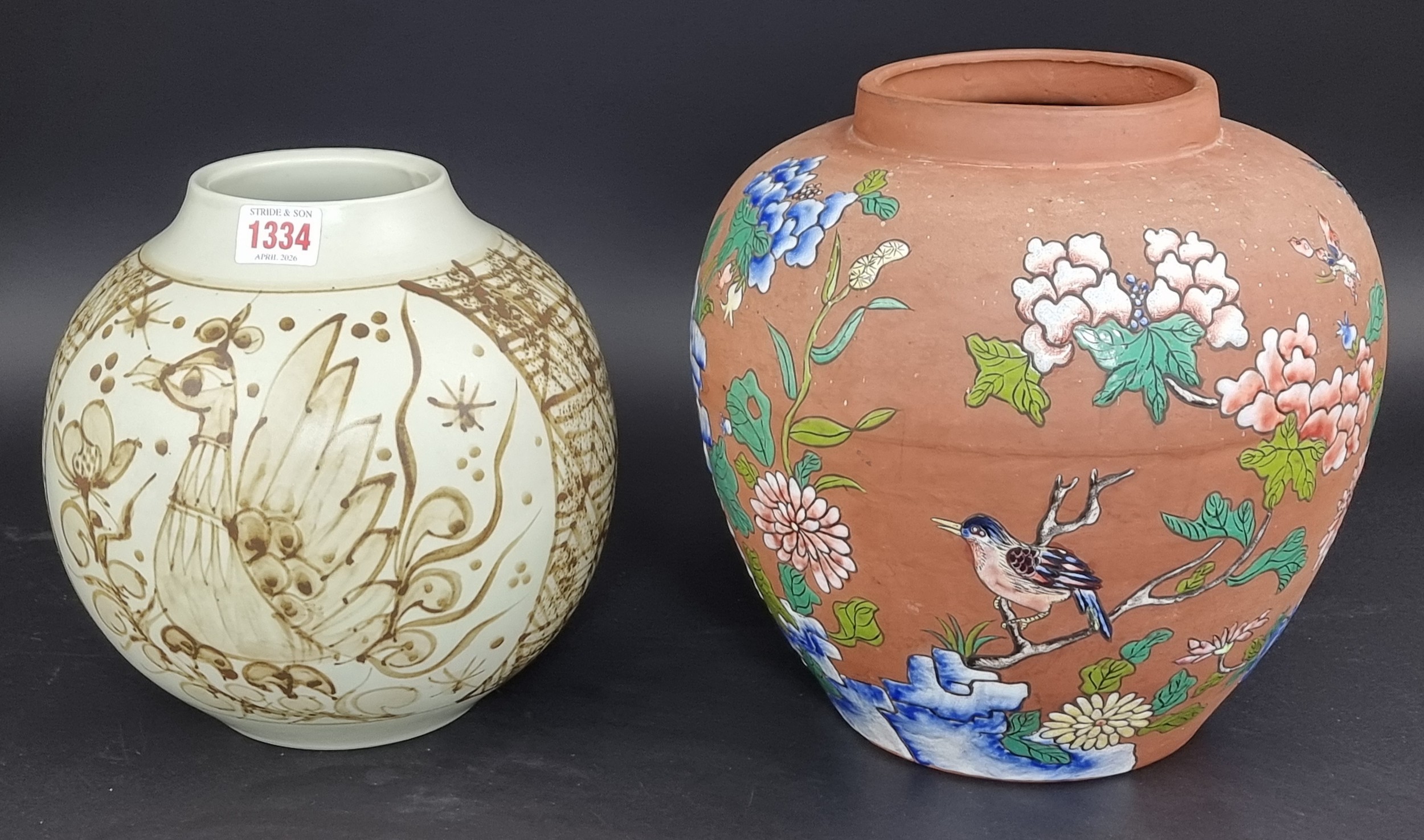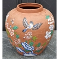 A terracotta ovoid base, enamelled in the Chinese style, possible Wedgwood, 25.5cm high; together with another Japanese vase, 22cm high. (2)