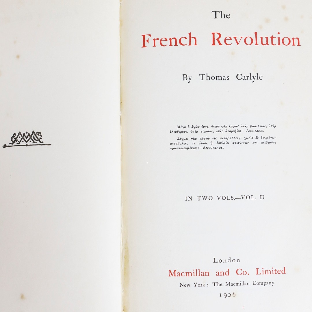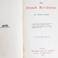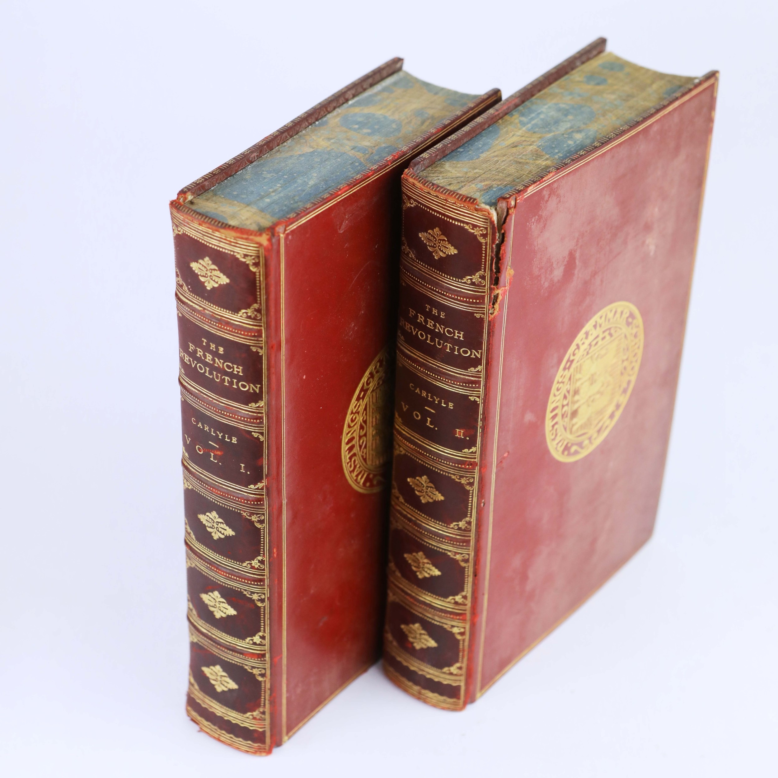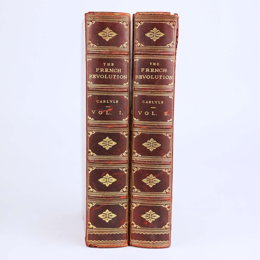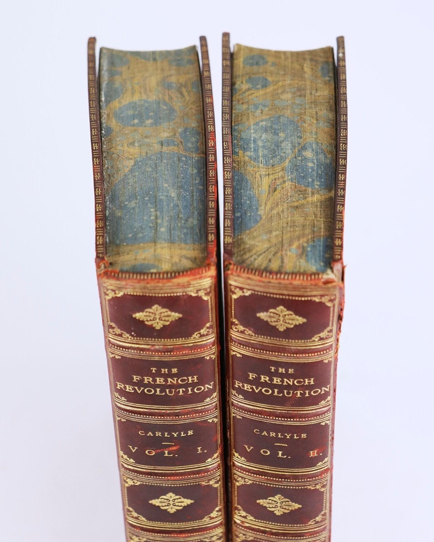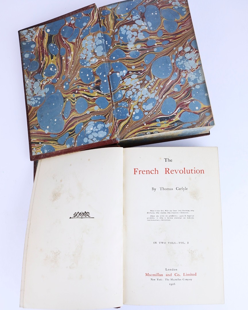 THOMAS CARLYLE. THE FRENCH REVOLUTION, 2 VOLS, 1906 (2). London: Macmillan and Co Ltd., 1906. Two volumes. Polished red calf boards, raised bands with bright gilt lettering and decoration to spines and boards. Hastings Grammer School insignia gilt embossed to front cover, prize bookplate presented to H.E. Shoresmith to front pastedown of first volume. Marbled edges and endpapers. Endpapers loosening. Some insect damage to spines, particulary on volume 2. Foxing to several front and rear leaves, else pages are clean and clear with light toning.