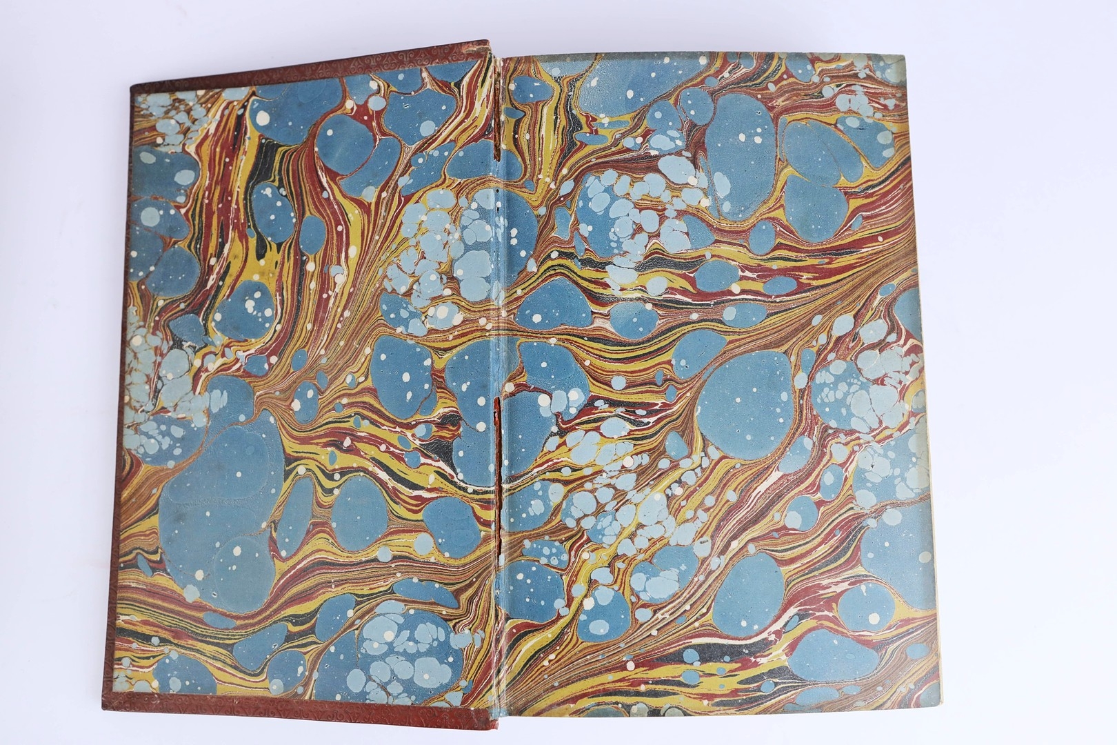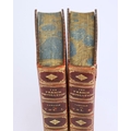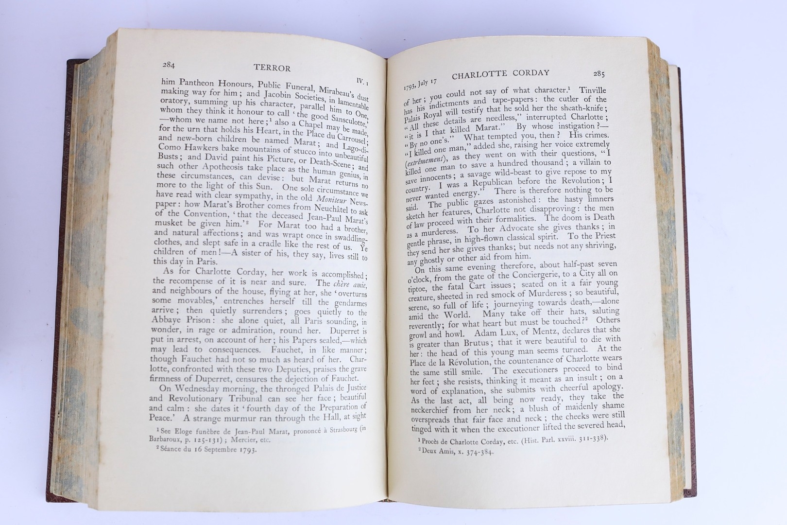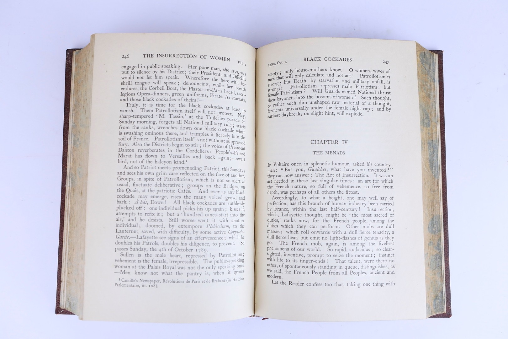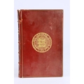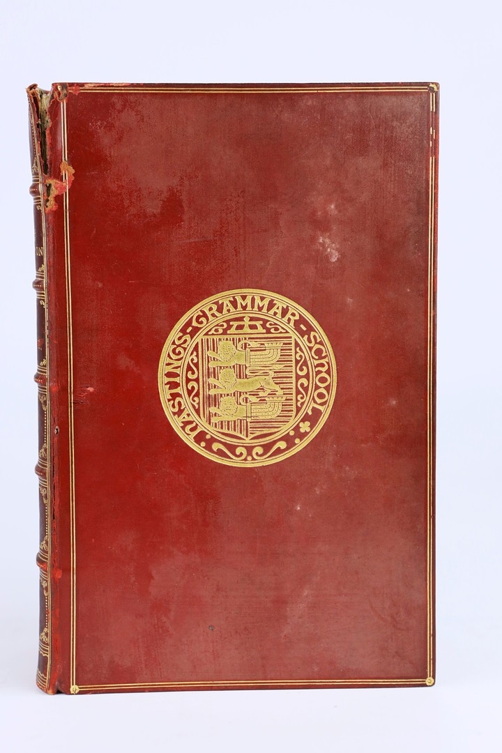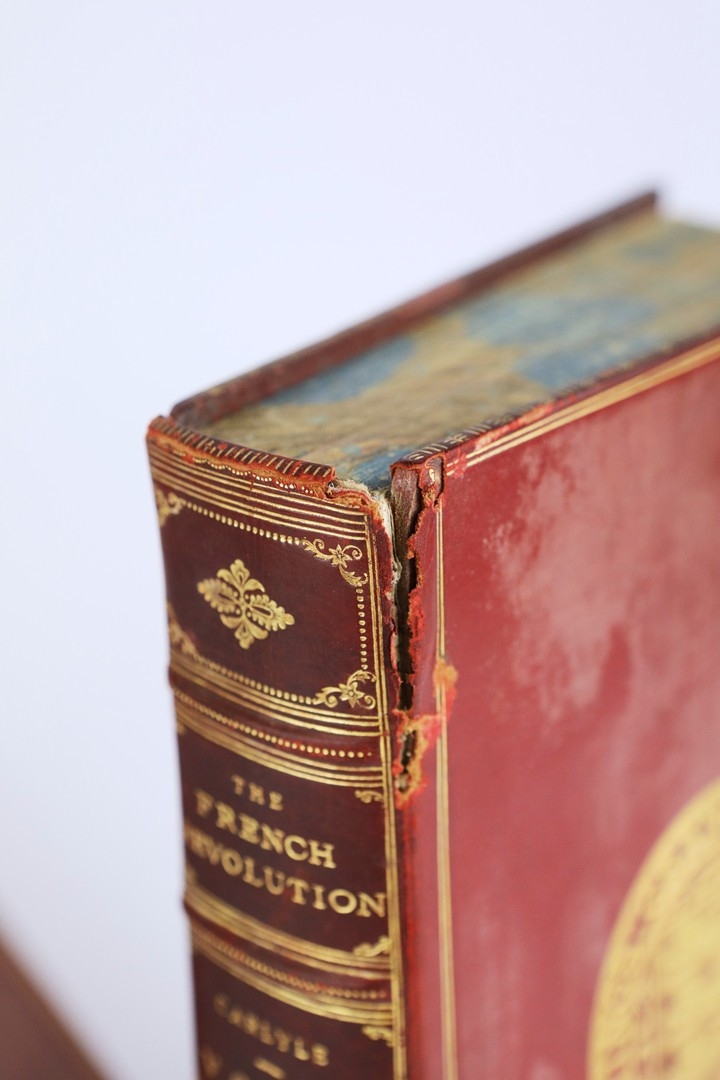 THOMAS CARLYLE. THE FRENCH REVOLUTION, 2 VOLS, 1906 (2). London: Macmillan and Co Ltd., 1906. Two volumes. Polished red calf boards, raised bands with bright gilt lettering and decoration to spines and boards. Hastings Grammer School insignia gilt embossed to front cover, prize bookplate presented to H.E. Shoresmith to front pastedown of first volume. Marbled edges and endpapers. Endpapers loosening. Some insect damage to spines, particulary on volume 2. Foxing to several front and rear leaves, else pages are clean and clear with light toning.