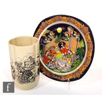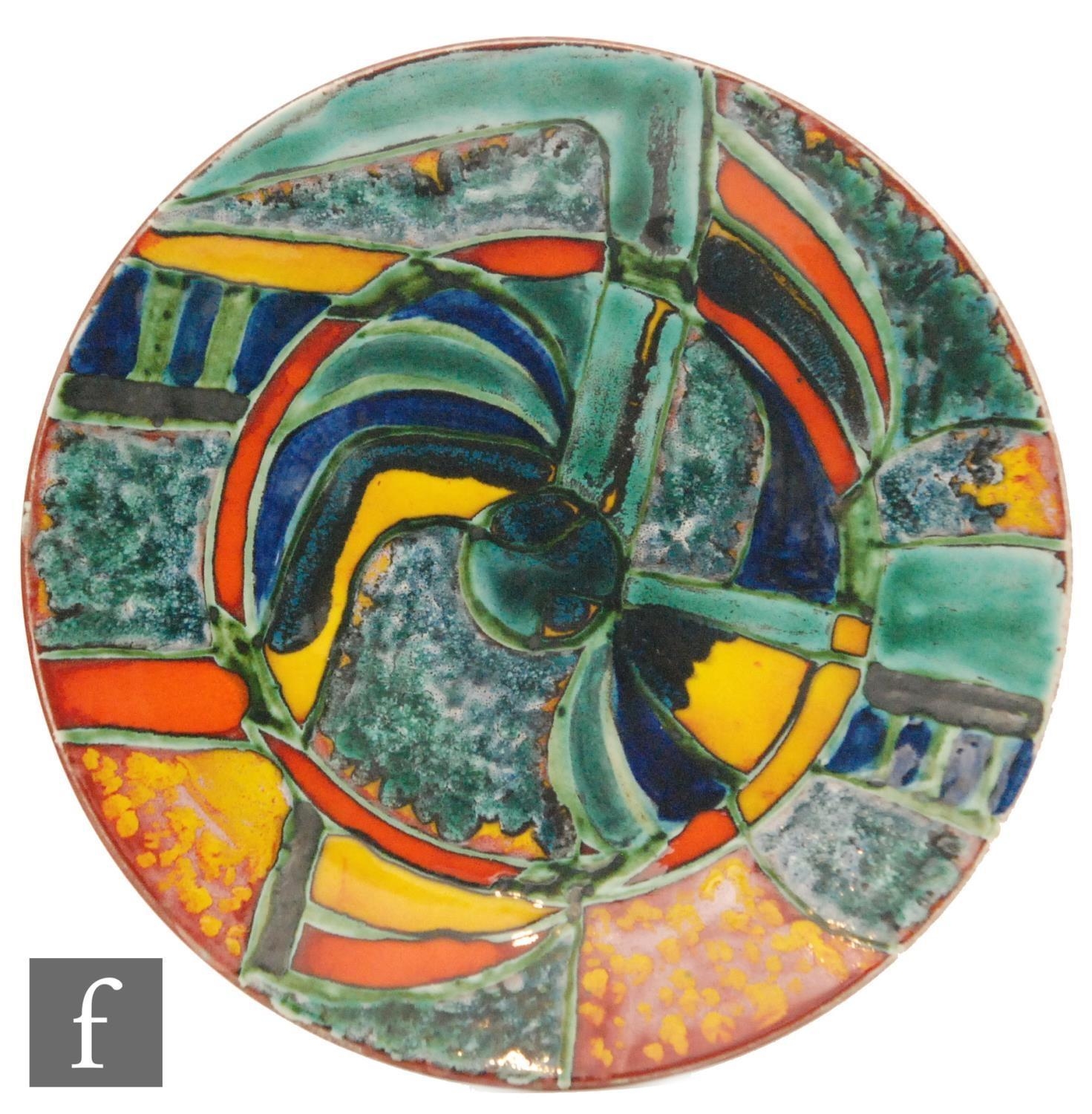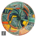 A later 20th Century Poole Pottery Studio plaque decorated with an abstract design in mixed palette, marked to the reverse TRIAL K 99, diameter 26cm.