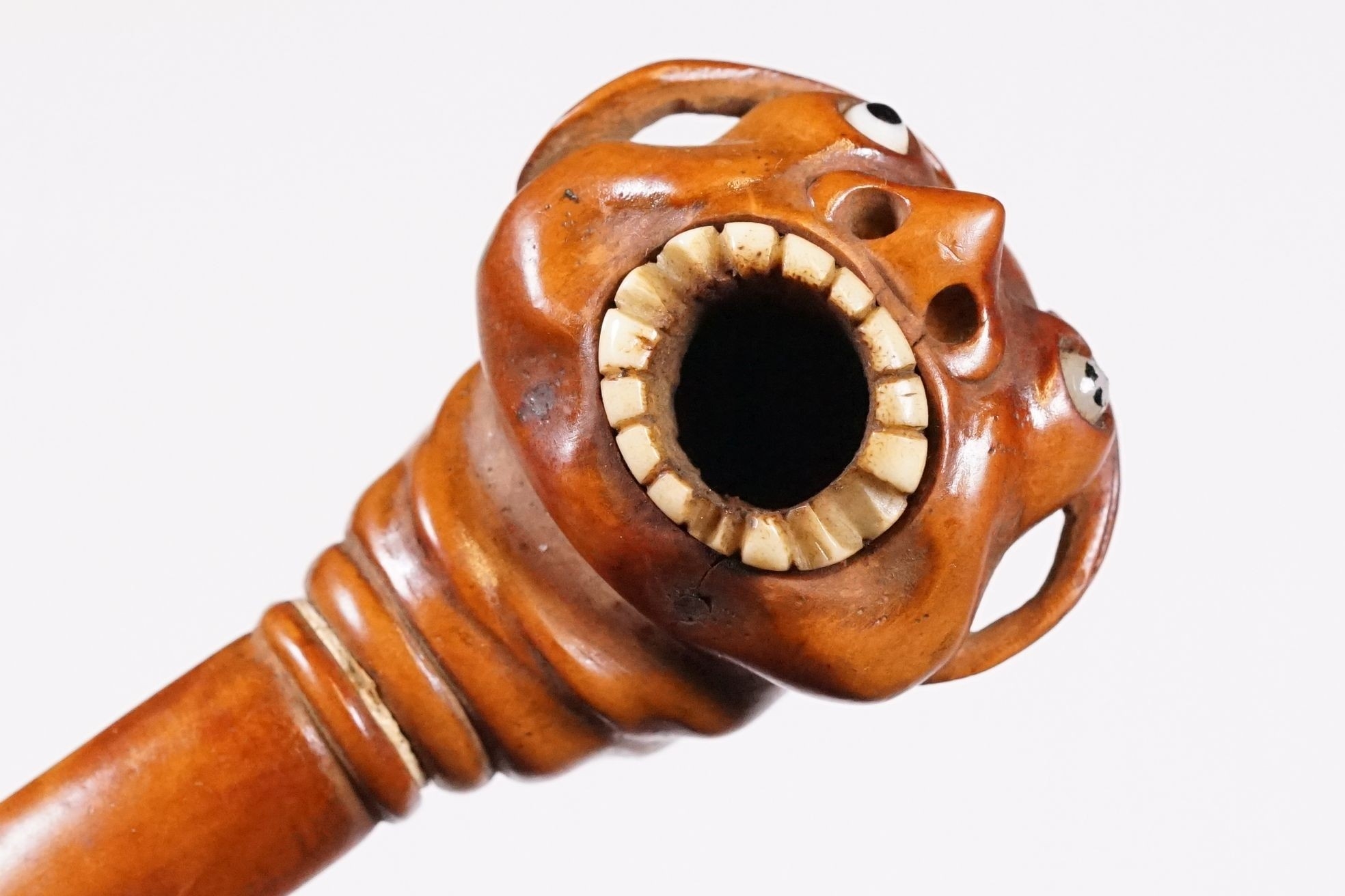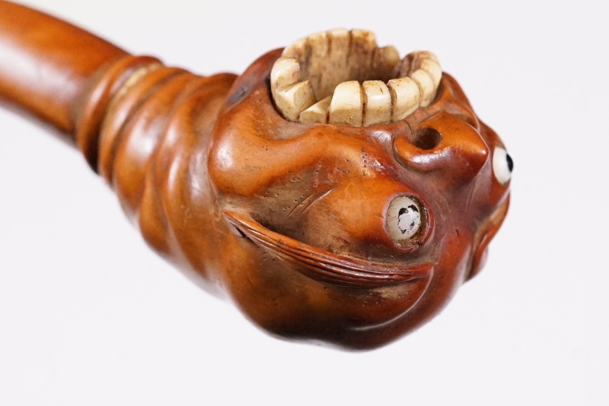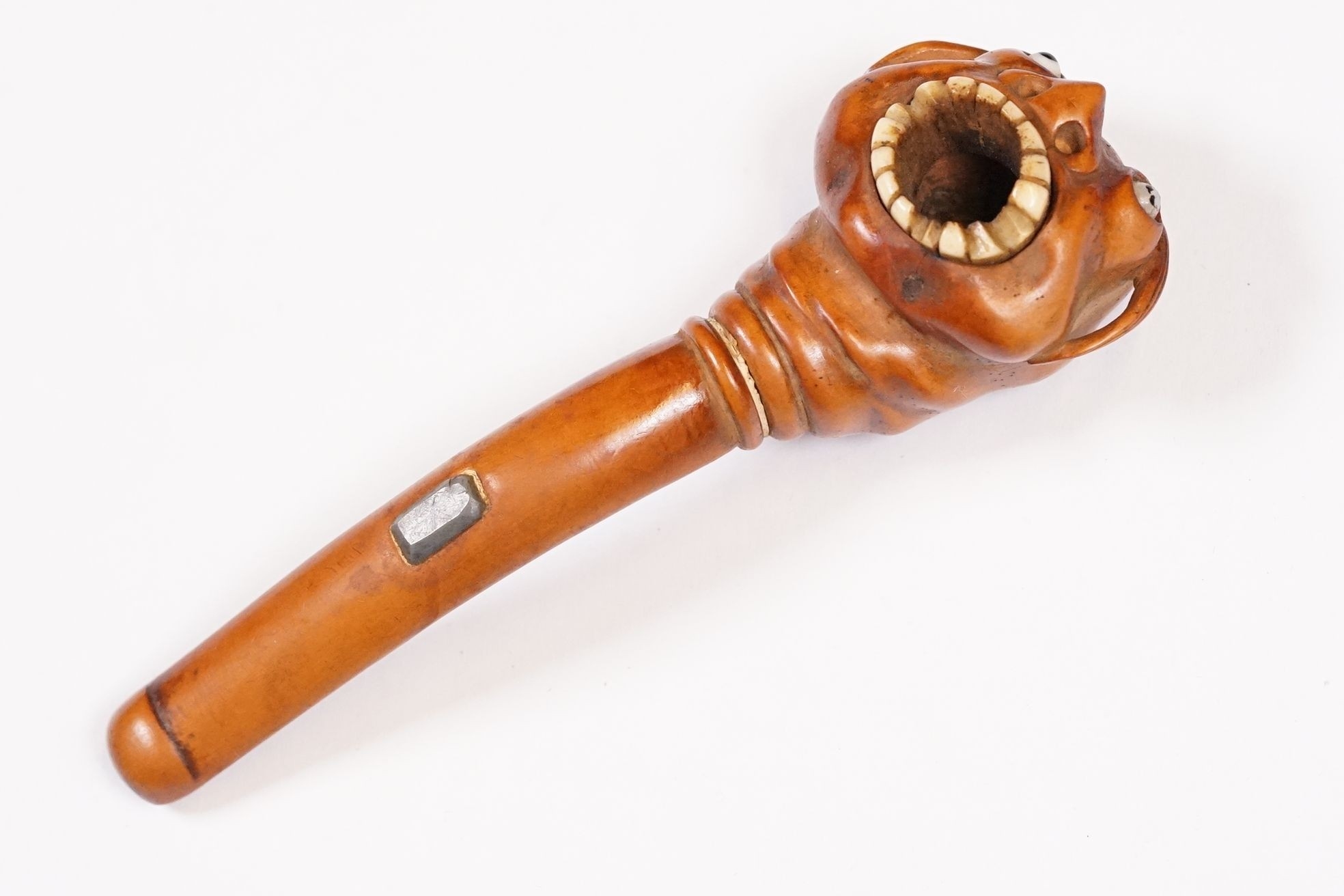 Japanese smoking pipe in the form of a demon, possibly Meiji period with bone inlay, L 11cm