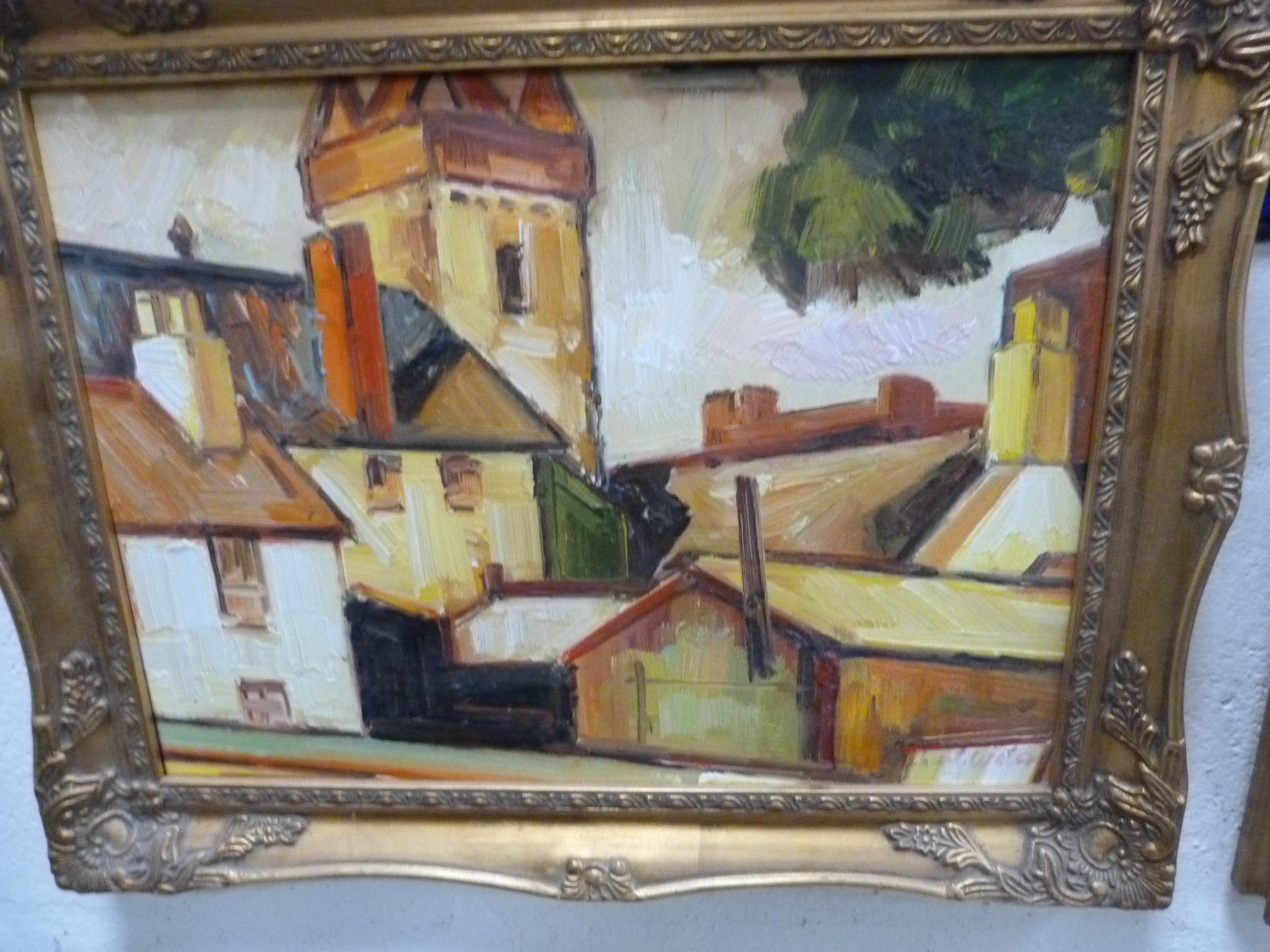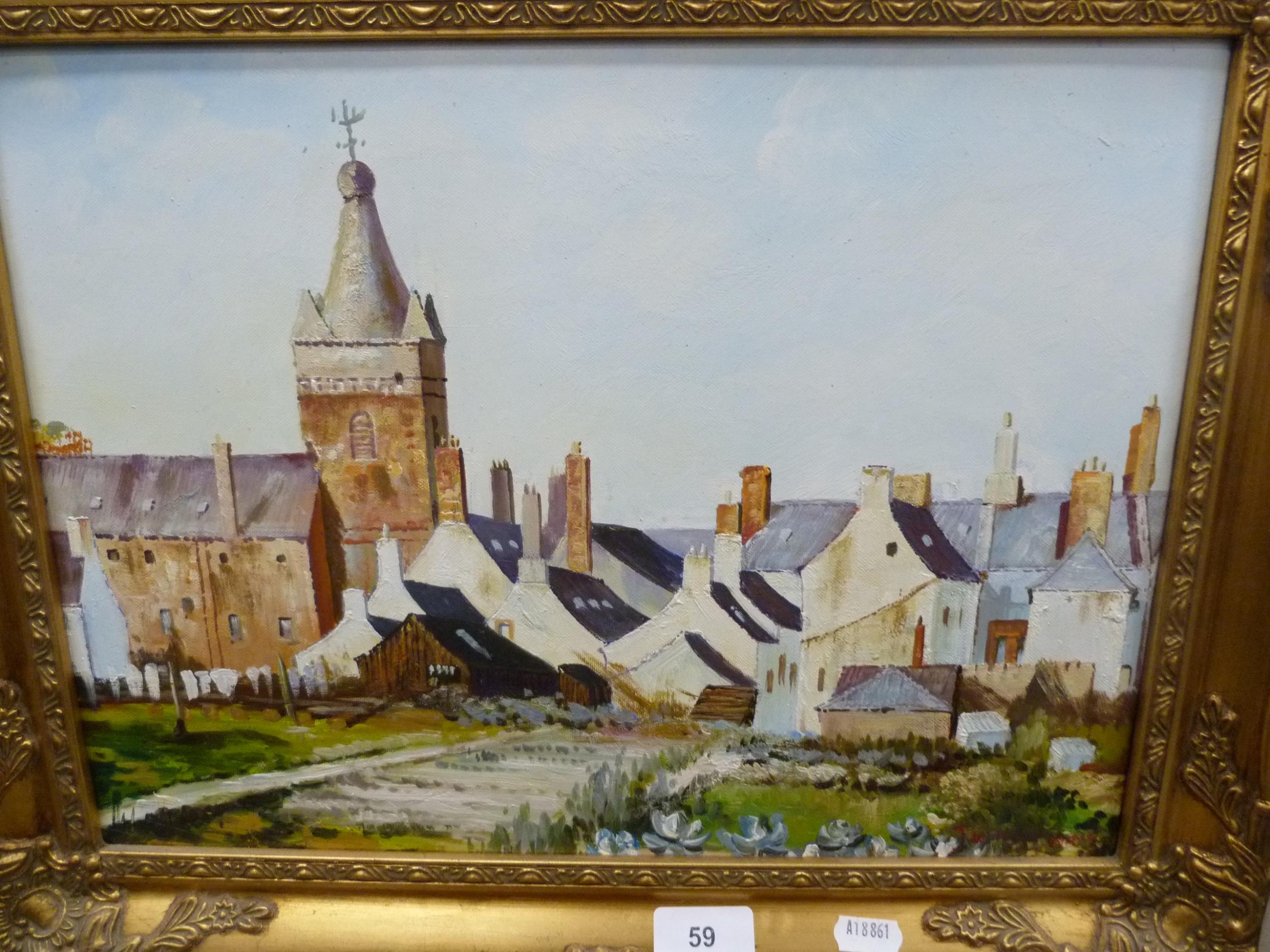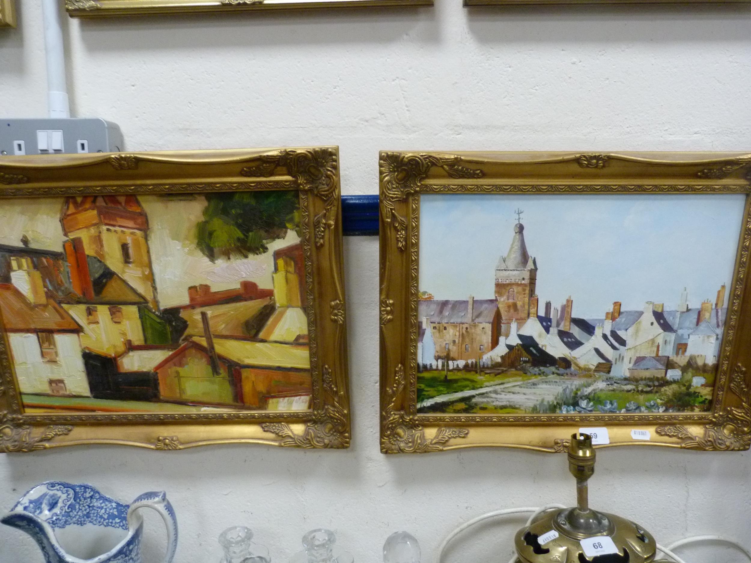 J Urquhart WatsonChurch steeples and surroundingsSigned, two oils on panel. (2)