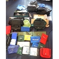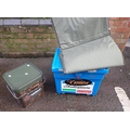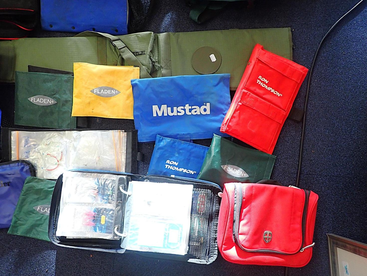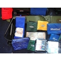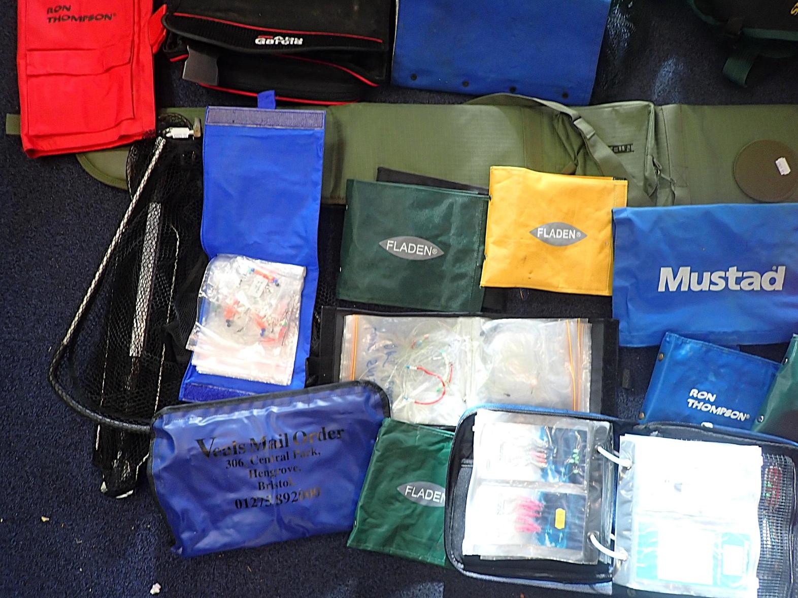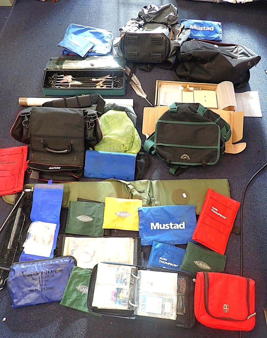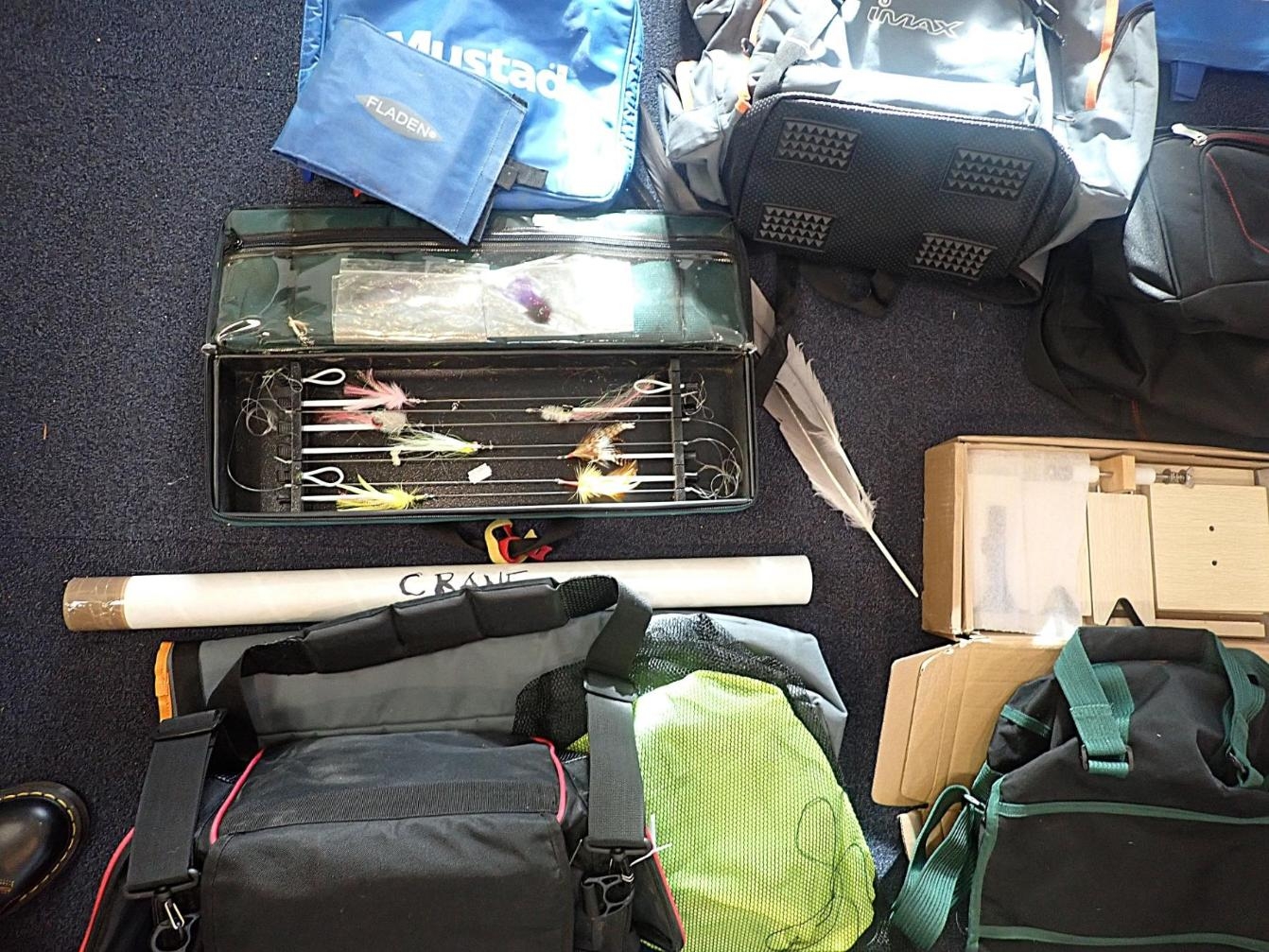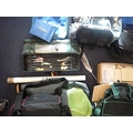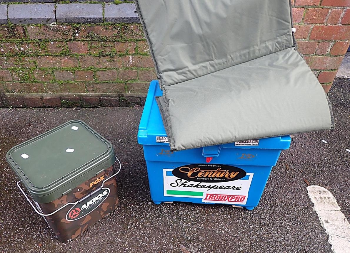 SHAKESPEARE: A PLASTIC FISHING BOXwith detachable green canvas fishing seat, a Fox fishing bait box and various fishing bags and fishing items.