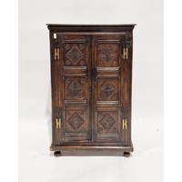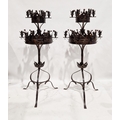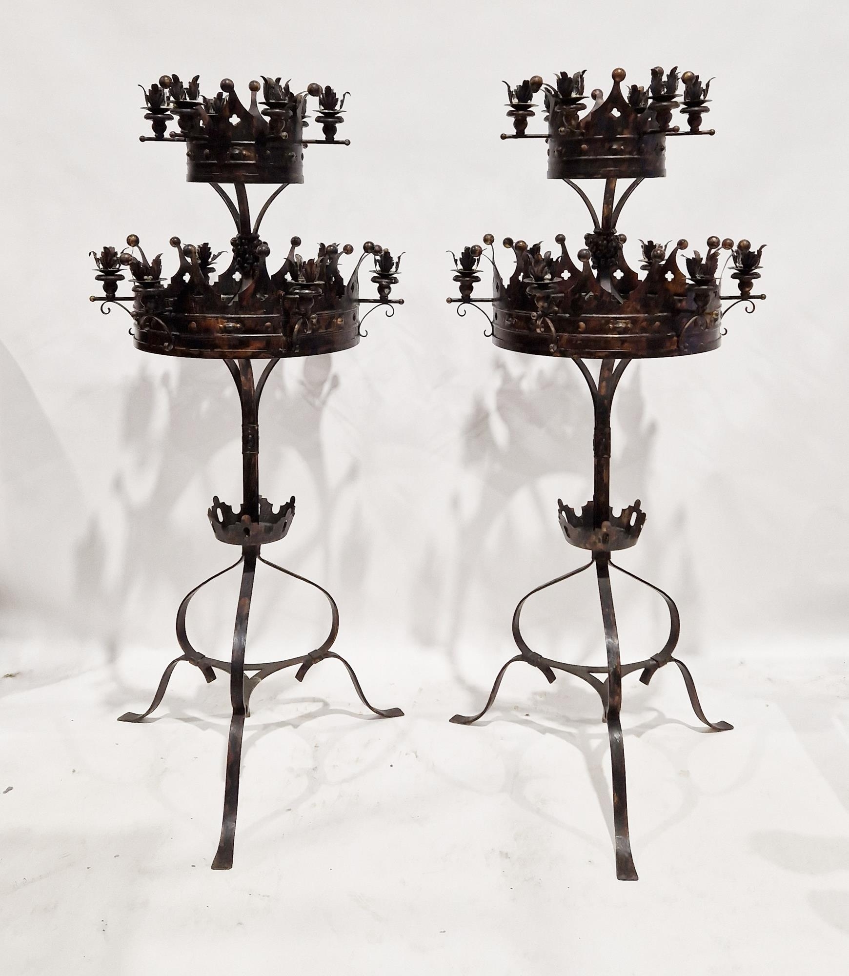 Pair of Victorian-style gothic wrought iron floor standing candelabra, each formed of two tiers with six sconces on each, raised on splayed tripod legs, each 175cm high (2)