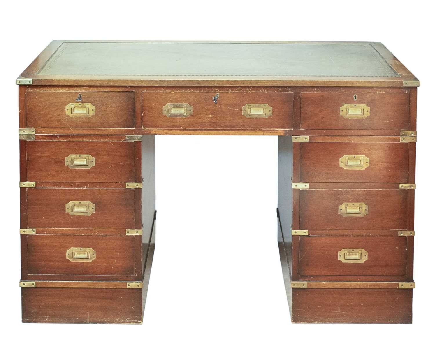 A campaign pedestal writing desk. Later 20th century, with flush brass handles and fittings and fitted with nine drawers, height 68cm, width 122cm, depth 58cm.