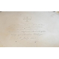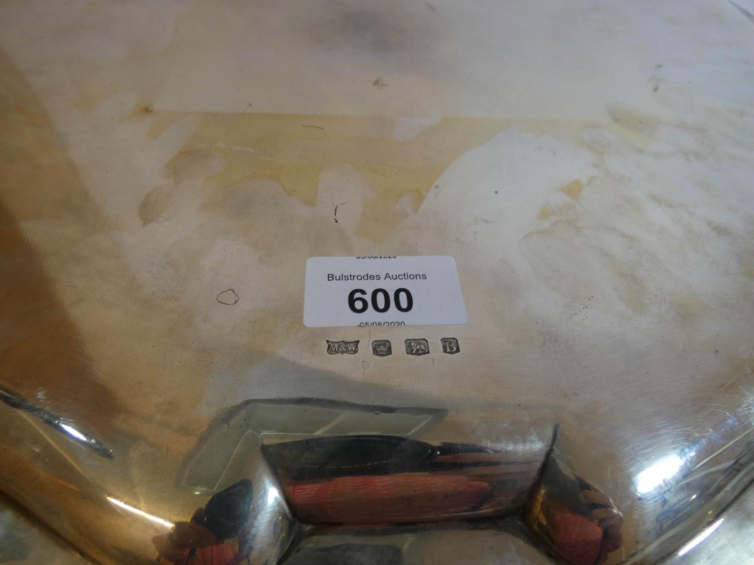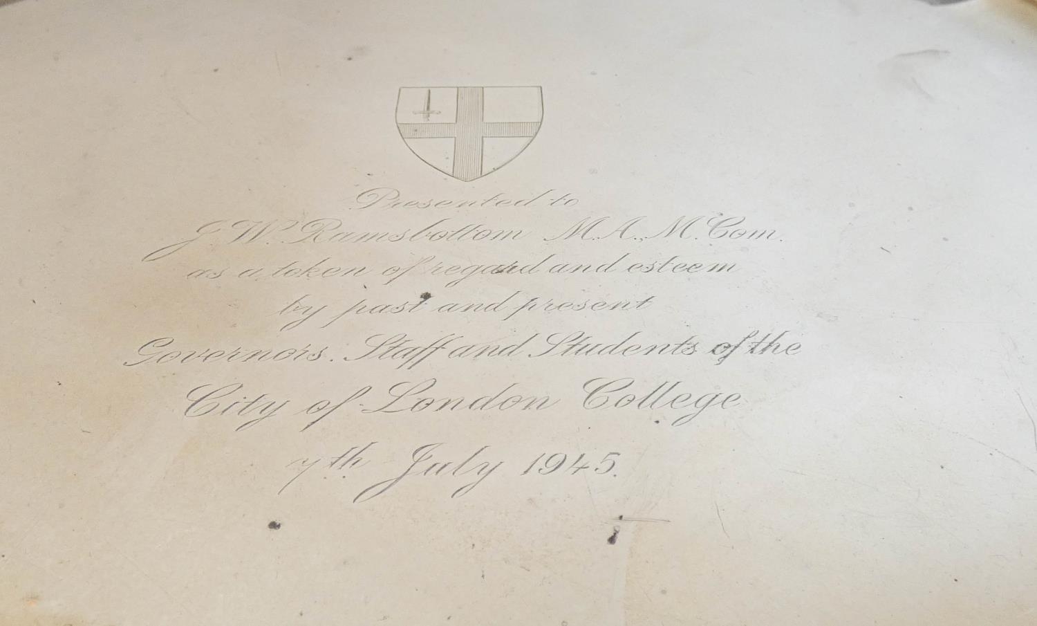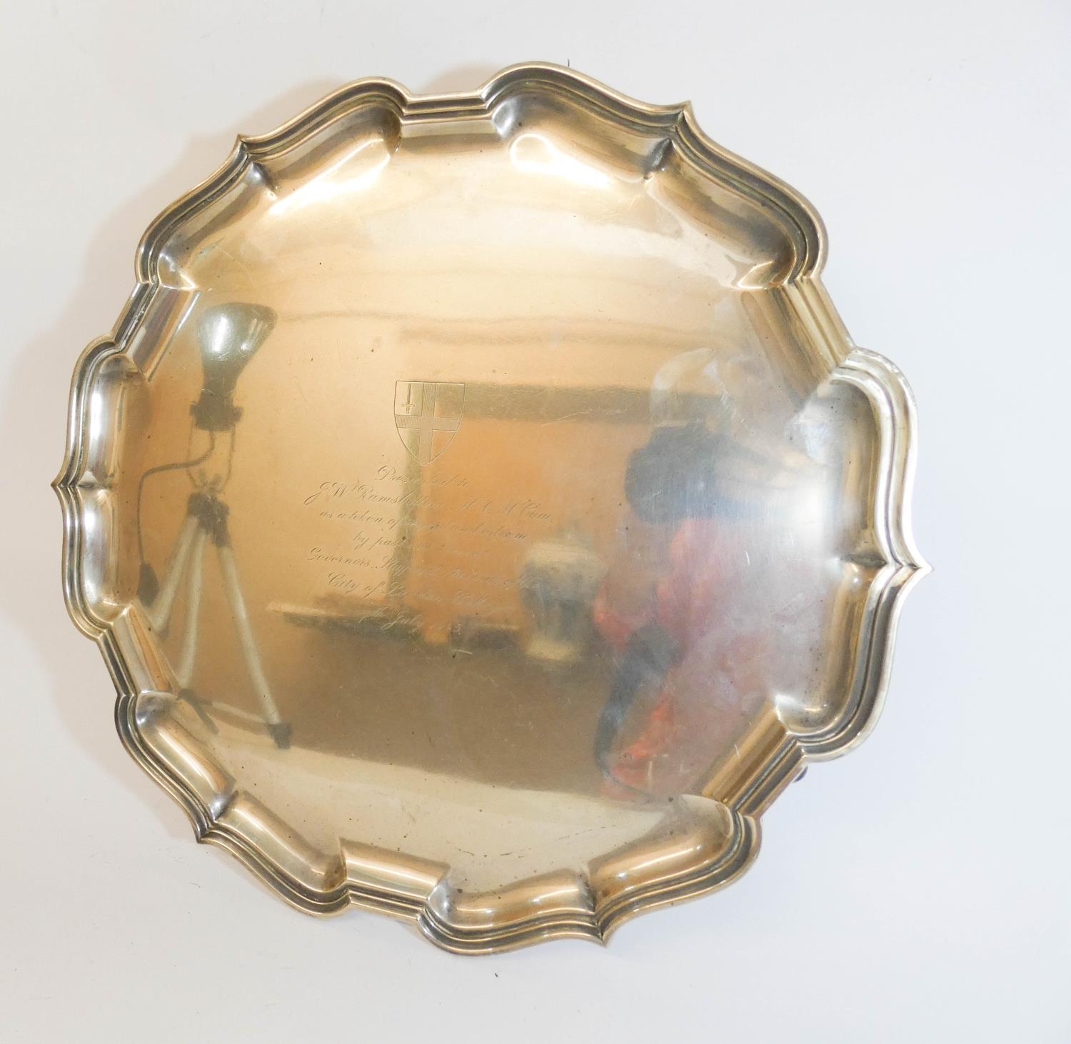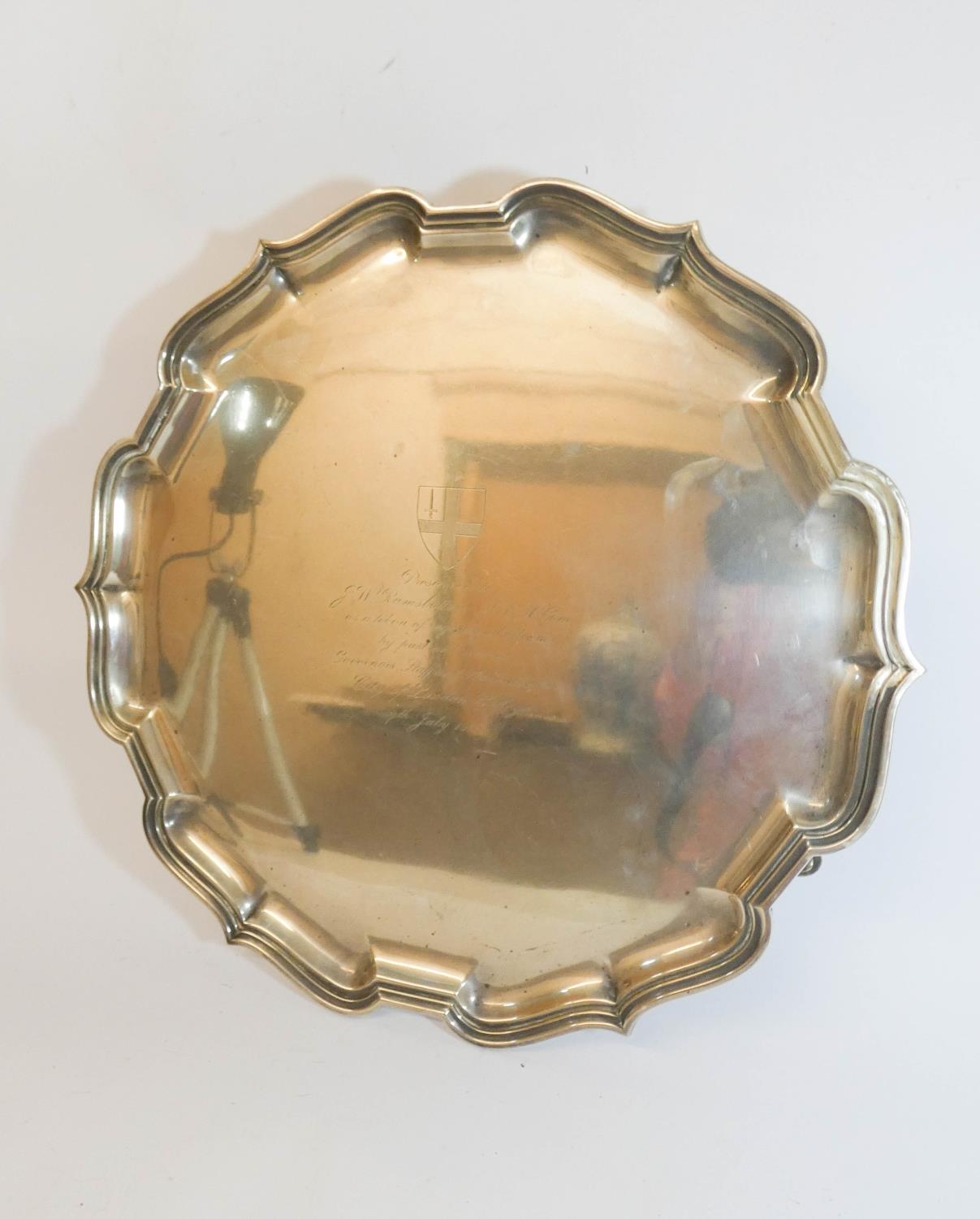 Mappin & Webb - substantial silver salver, of shaped form raised on three hoof feet, Sheffield 1945, gross weight 62.75 troy ounces. With faint presentation inscription - J W Ramsbottom - Head of City of London College 1945