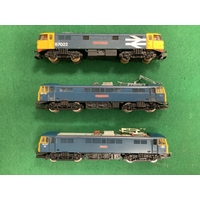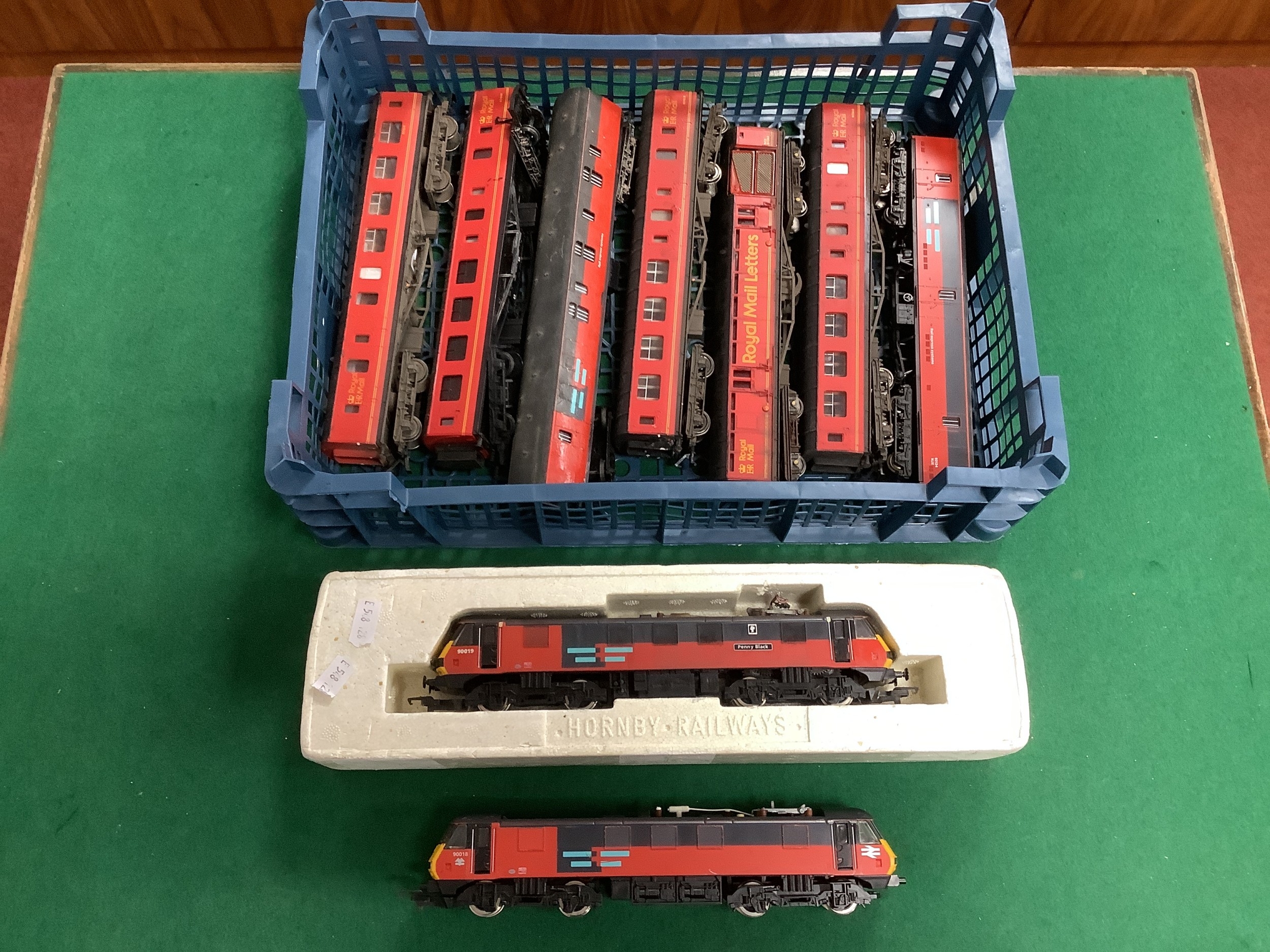 Two Hornby 00 gauge Class 90 Electric Locomotives in Rail Express Systems Red and Grey livery (one with damaged pantograph) and seven Mail coaches in Royal Mail and RES livery by Hornby and Lima, all playworn and locomotives untested.