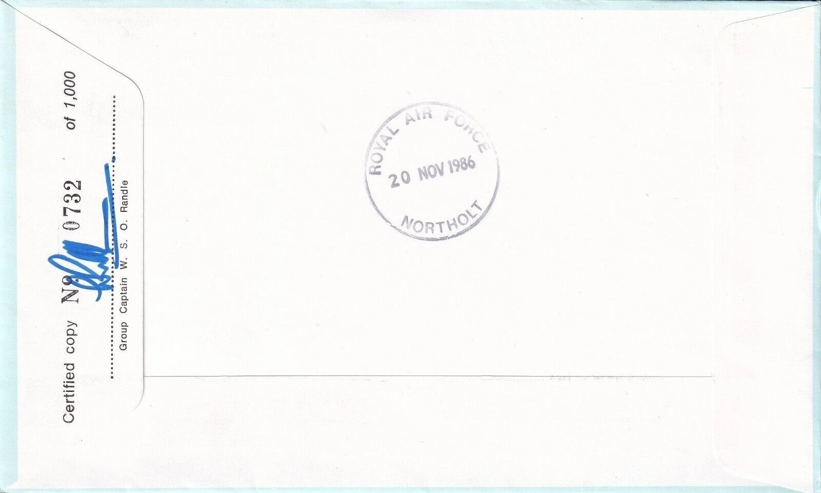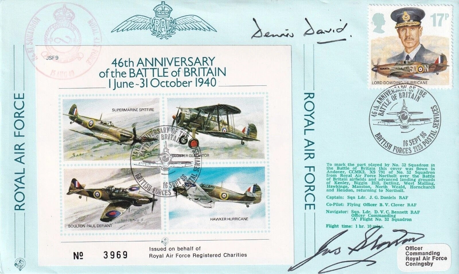 JSF9c 46th Anniv Battle of Britain Signed W. D. David and Battle of Britain. 16 th Sept 86 BFPS 2123 46th Anniversary of the Battle of Britain special Postmark. Green flown Cachet. To mark the part played by No 32 Squadron in the Battle of Britain this Cover was flown in Andover CCMK2 XS of 32 791 Squadron from RAF Northolt over the Battle of Britain airfields and advanced landing grounds of Kenley, Biggin Hill, Detling, West Malling. Hawkinge, Manston, North Weald, Hornchurch and Hendon, returning to Northolt. Personally Signed by Group Captain W. D. David CBE DFC AFC. Battle of Britain and World War 11 fighter Ace 15 Victories. Enclosed Photo Size 5 ½ by 3 ½ inches 7 Details. also Signed by James Eric Storrar Battle of Britain Pilot 145 and 73 Sqn's, 421 Flight. Details enclosed. Certified Copy no 0732 of 10000 Very Few issued Additionally Signed Storrar . Single Vendor RAF cover collection. Good condition. All autographs come with a Certificate of Authenticity. We combine postage on multiple winning lots and can ship worldwide. UK postage from £5.99, EU from £7.99, Rest of World from £9.99