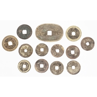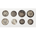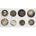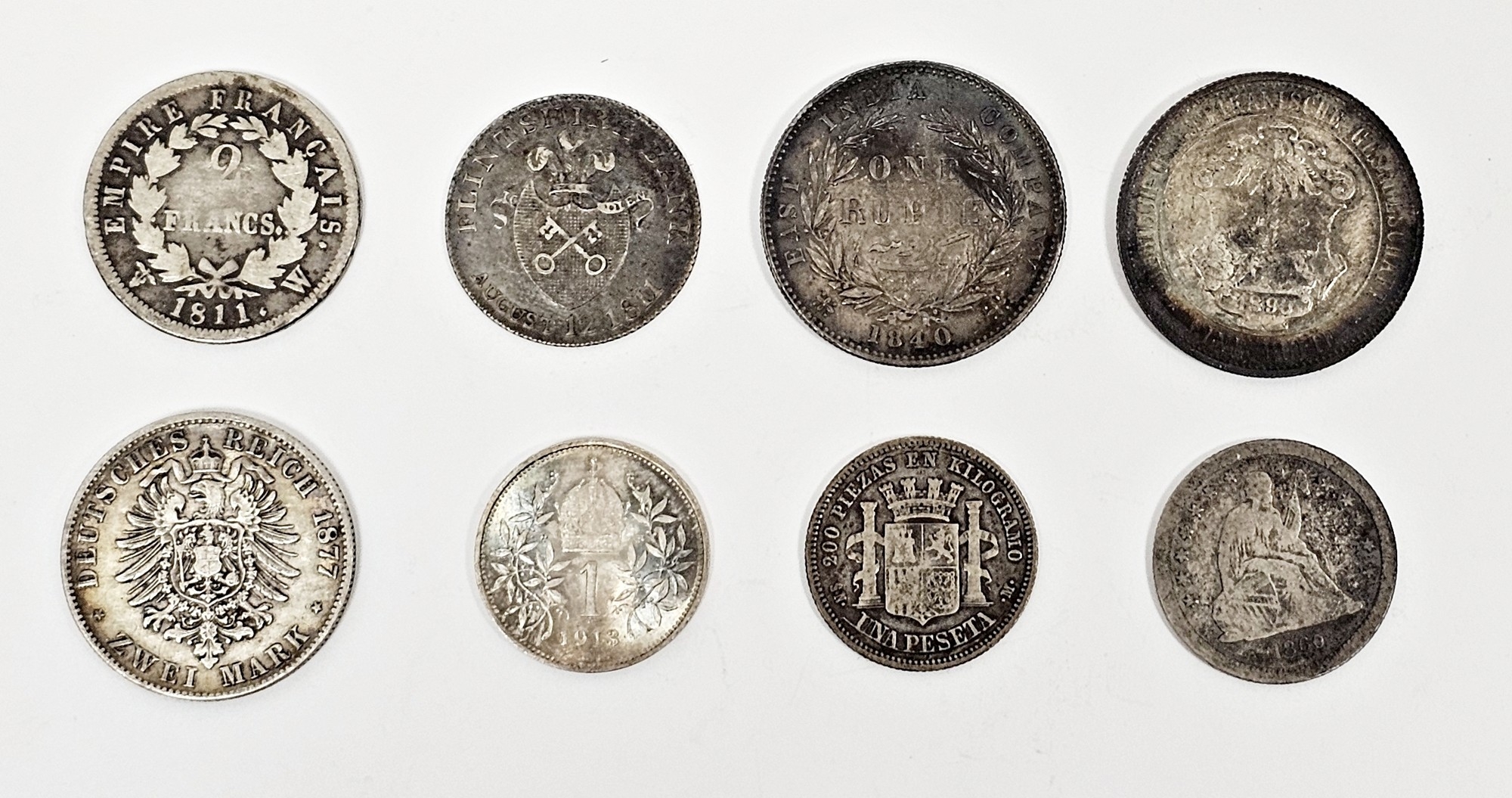 Collection of coins including a Victoria East Indian Company one Rupee 1840 silver coin, a 1913 Austrian one Corona coin, an East Africa one Rupee 1890 silver coin, a two Francs 1811 coin, a Prussian two Mark 1877 coin, a seated Liberty quarter coin, a Spanish one Pesto 1869 silver coin and a Flintshire Bank 1811 shilling token