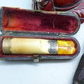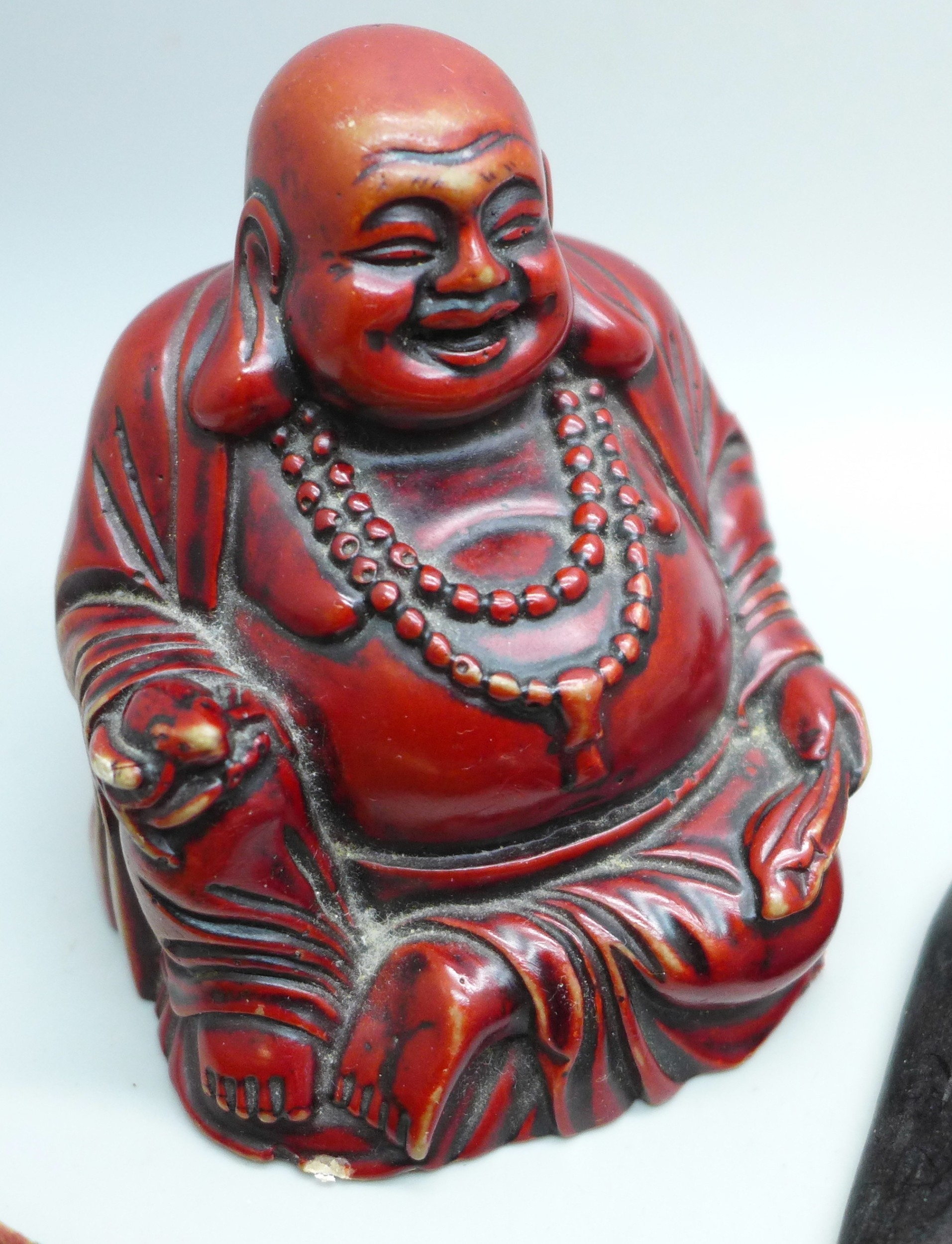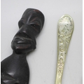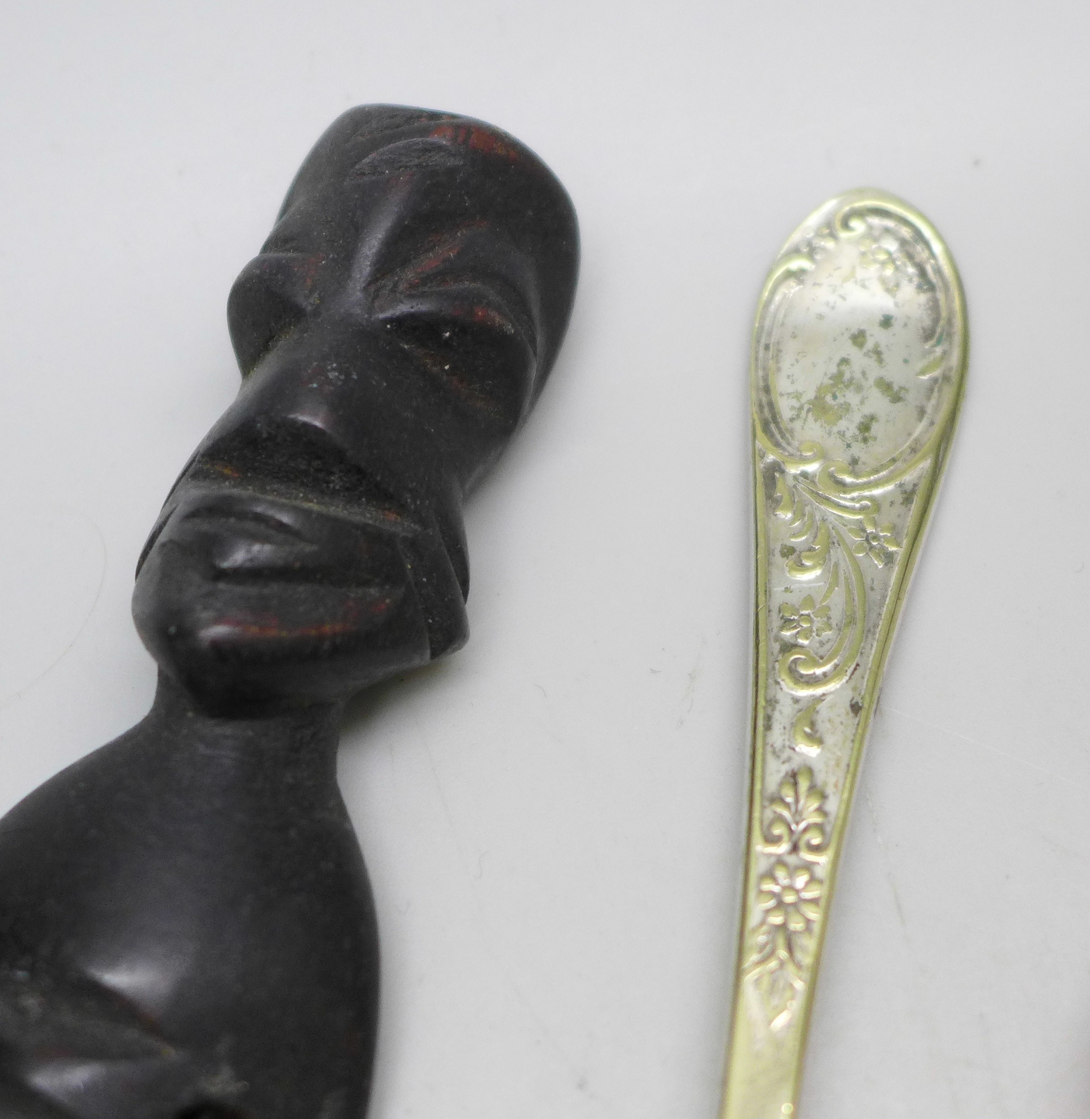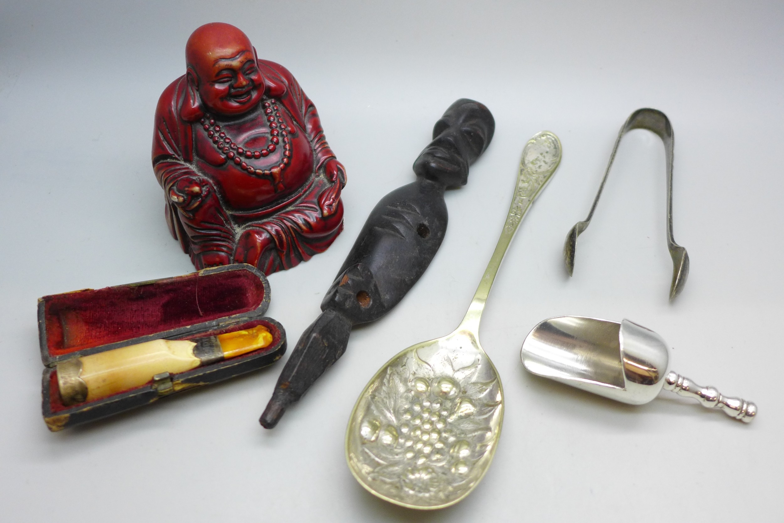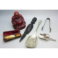 A late Victorian silver banded cheroot holder, a Buddha figure, a carved wooden item, a plated spoon, etc.