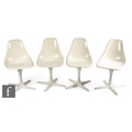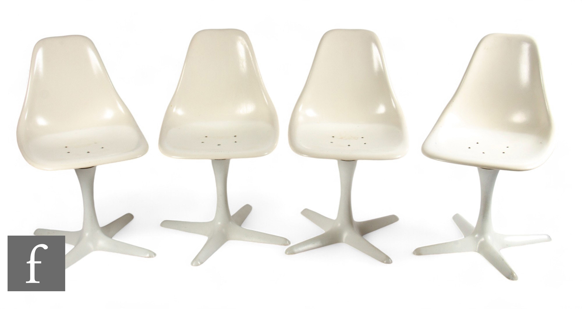 Maurice Burke for Arkana - A set of four mid century 'Tulip' model 115 fibreglass chairs, white, on four-stair metal bases, lacking original seat pads, height 81cm.