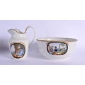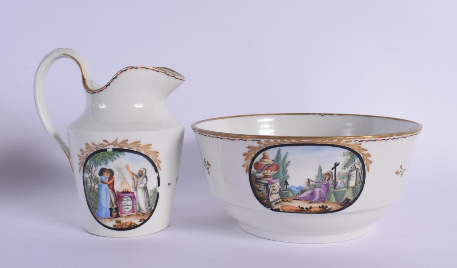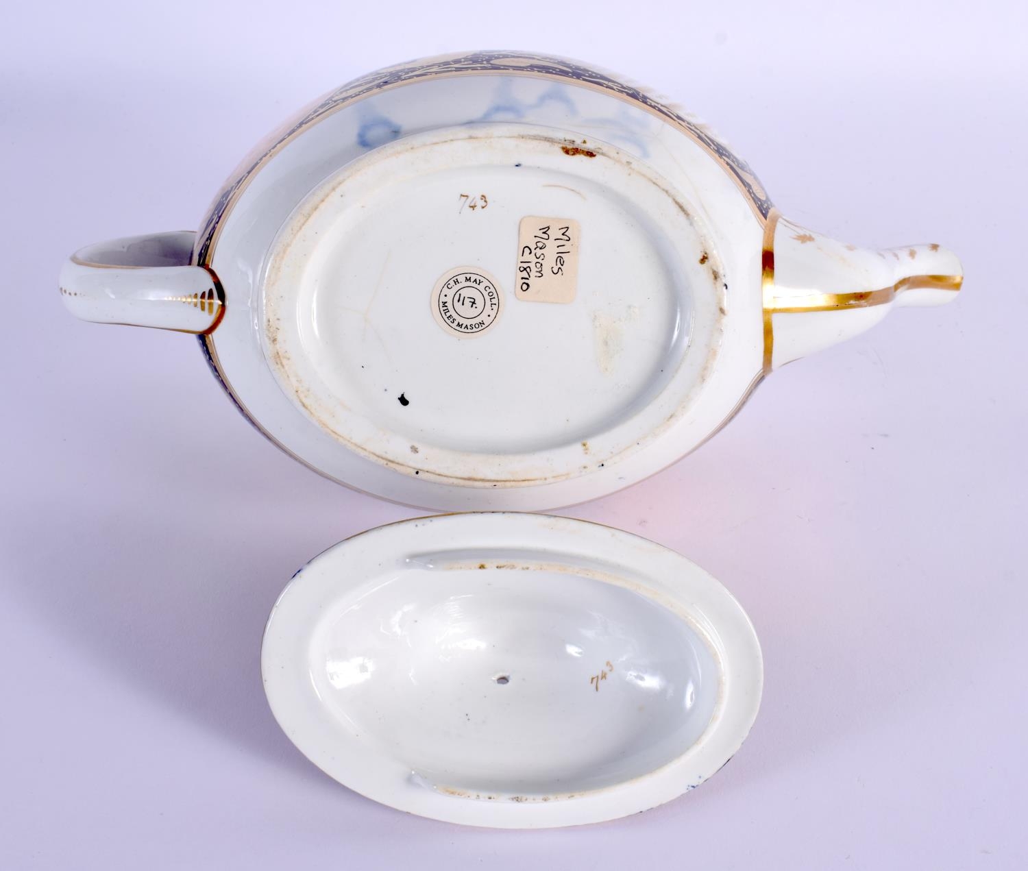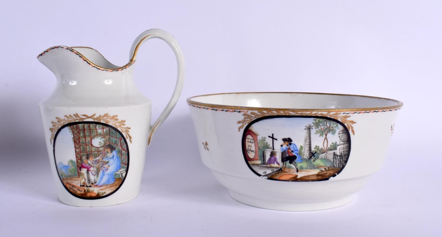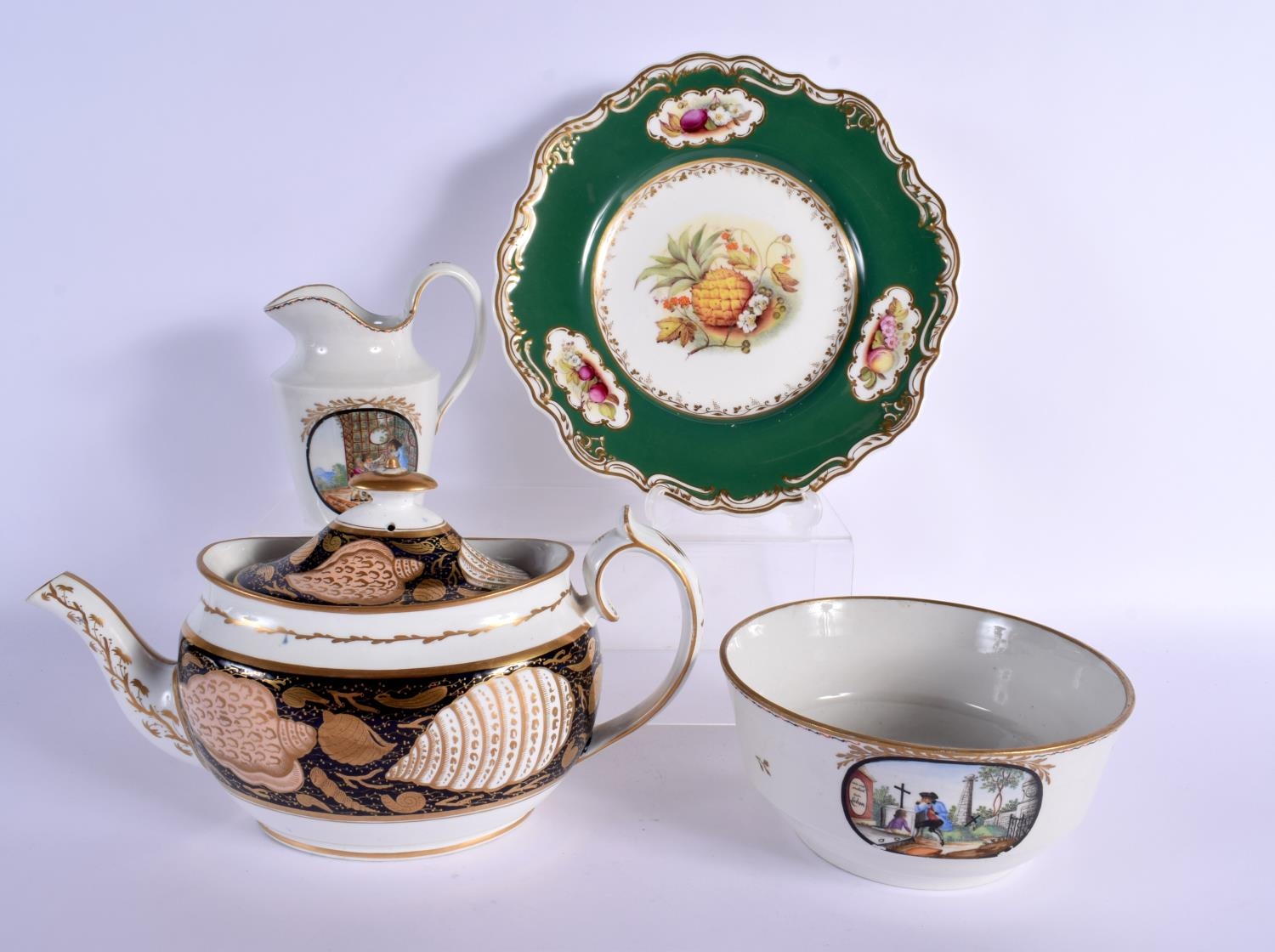 AN EARLY 19TH CENTURY MILES MASON TEAPOT AND COVER together with late 18th century Limbach jug with bowl & a plate. Largest 27 cm wide. (4)