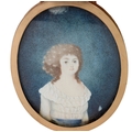 Oval portrait miniature depicting a female sitter shown bust-length wearing a ruffled white bodice with delicate lace detail and a ribbon or sash. The sitter is rendered with fine, detailed brushwork and sits against a plain ground, framed in unmarked gold. The quality of the costume and execution suggest genteel status; the plain gold frame, although unmarked, carries intrinsic material value in addition to its historical interest.