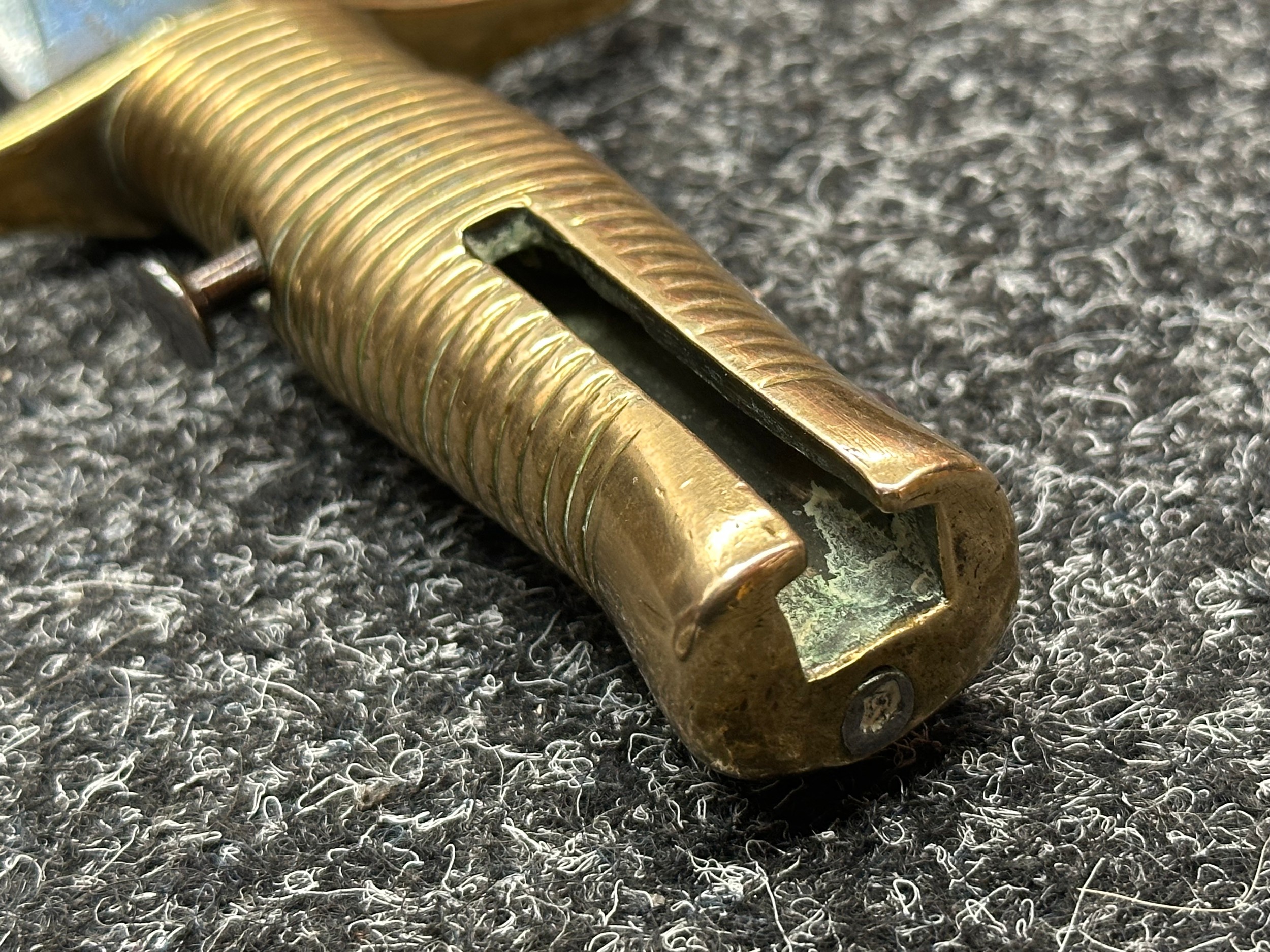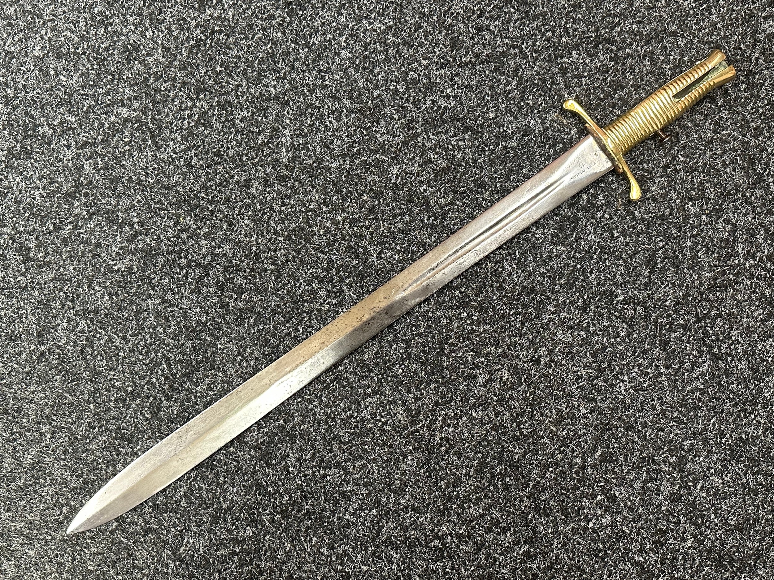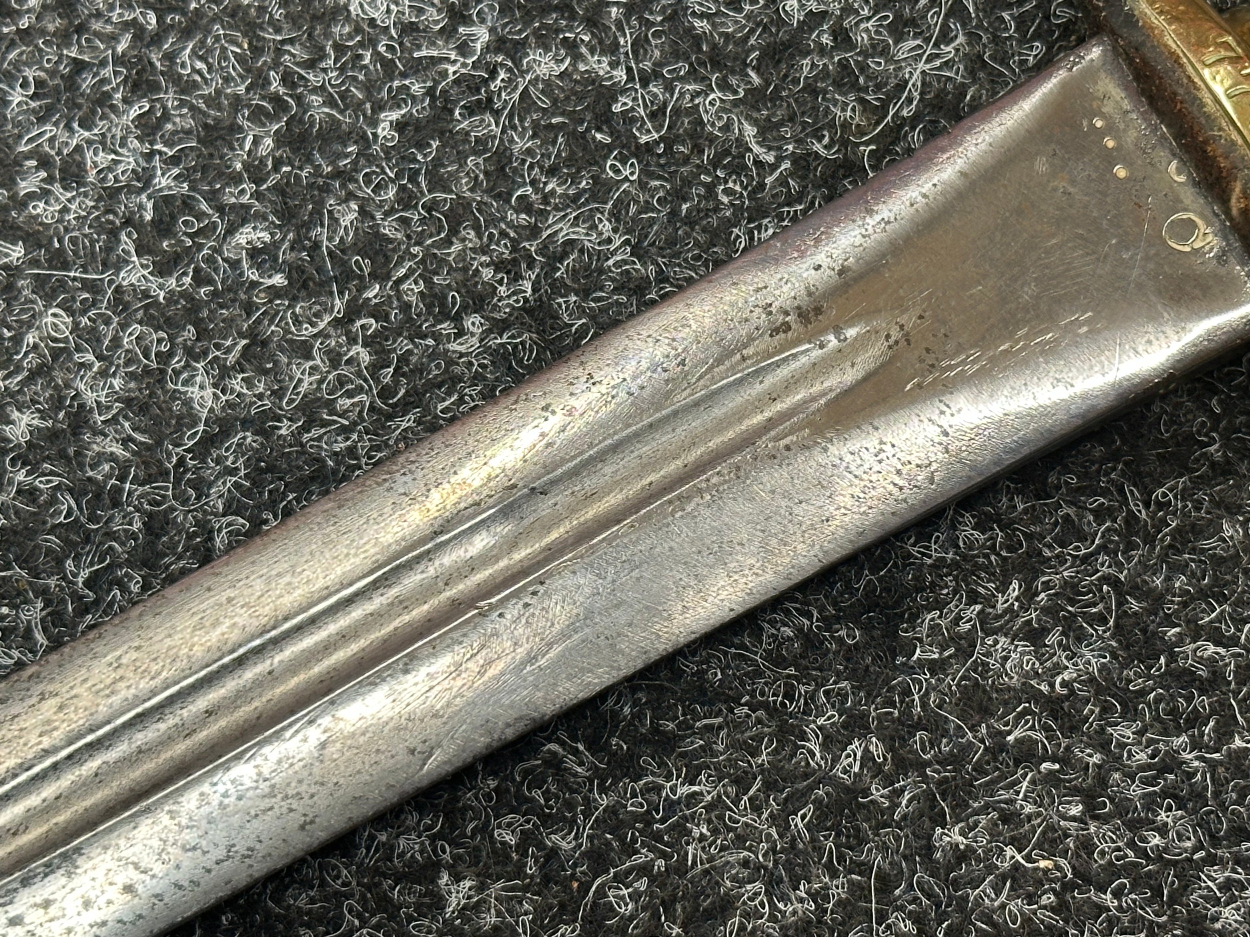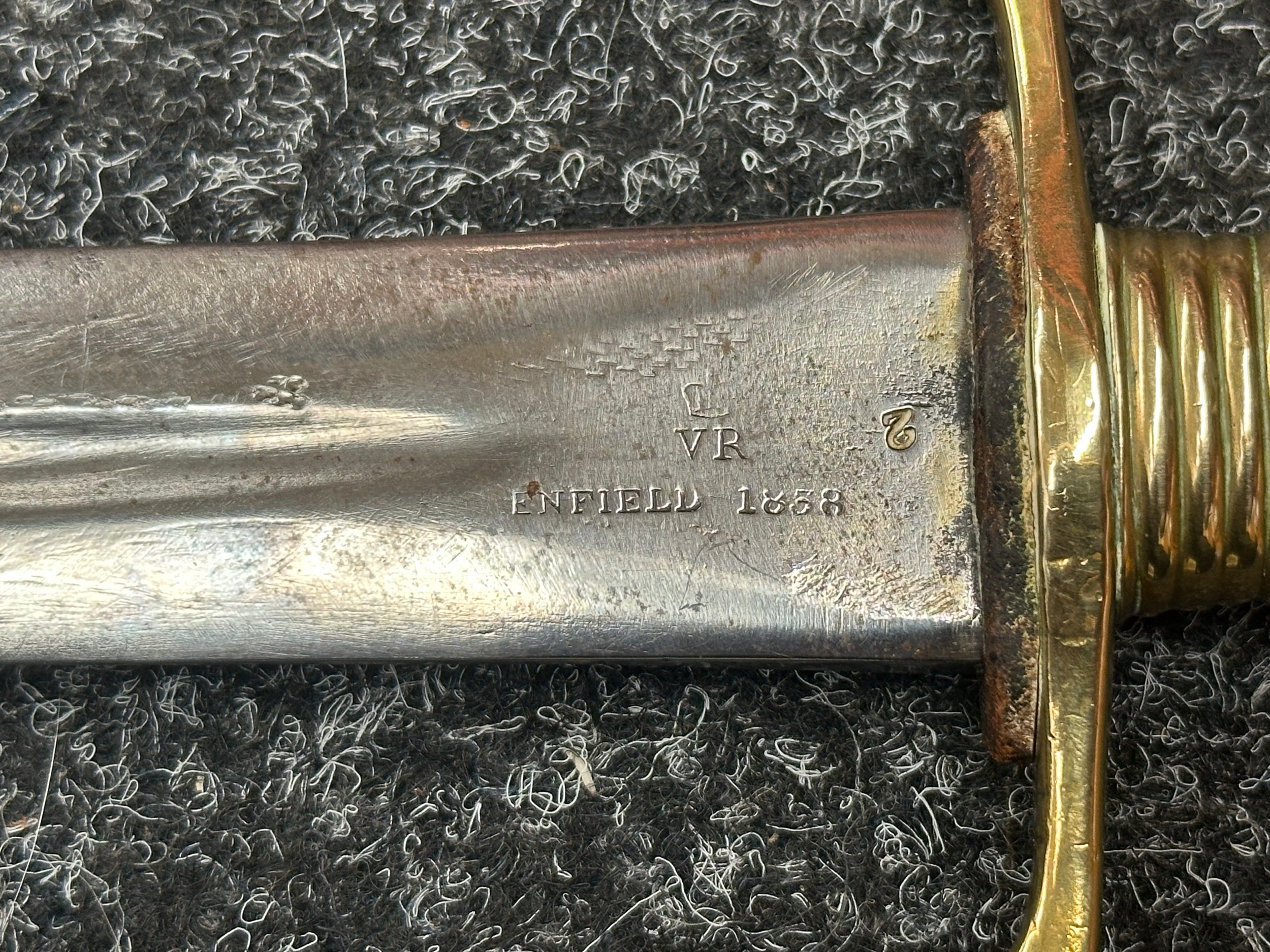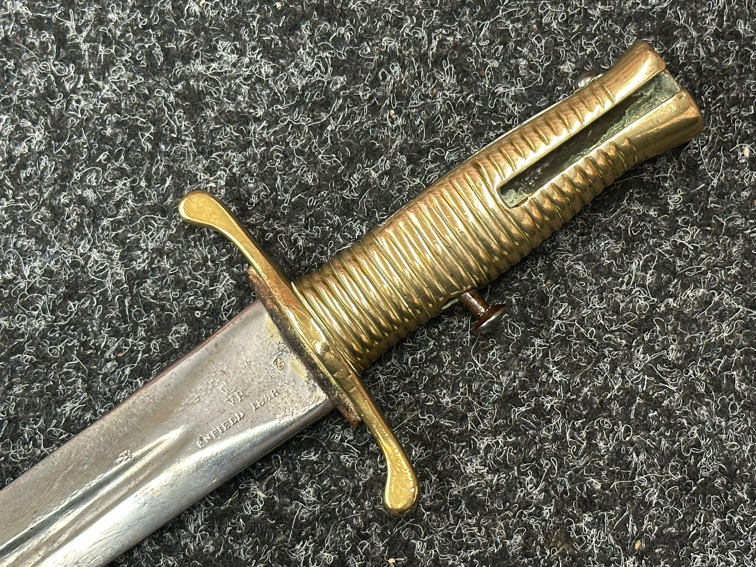Brunswick Rifle Bayonet, 1st Pattern, with double edged fullered blade 550mm in length, maker marked and dated "VR Crown Enfield 1858". Also marked "2" to blade. Leather washer to blade. Cast brass fluted grip. Crossguard numbered "773". Both crossguard, grip and pommel marked "2". Pommel has double Broad Arrow sold out of service mark. Working release catch. Overall length 670mm. No scabbard.