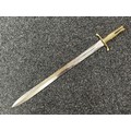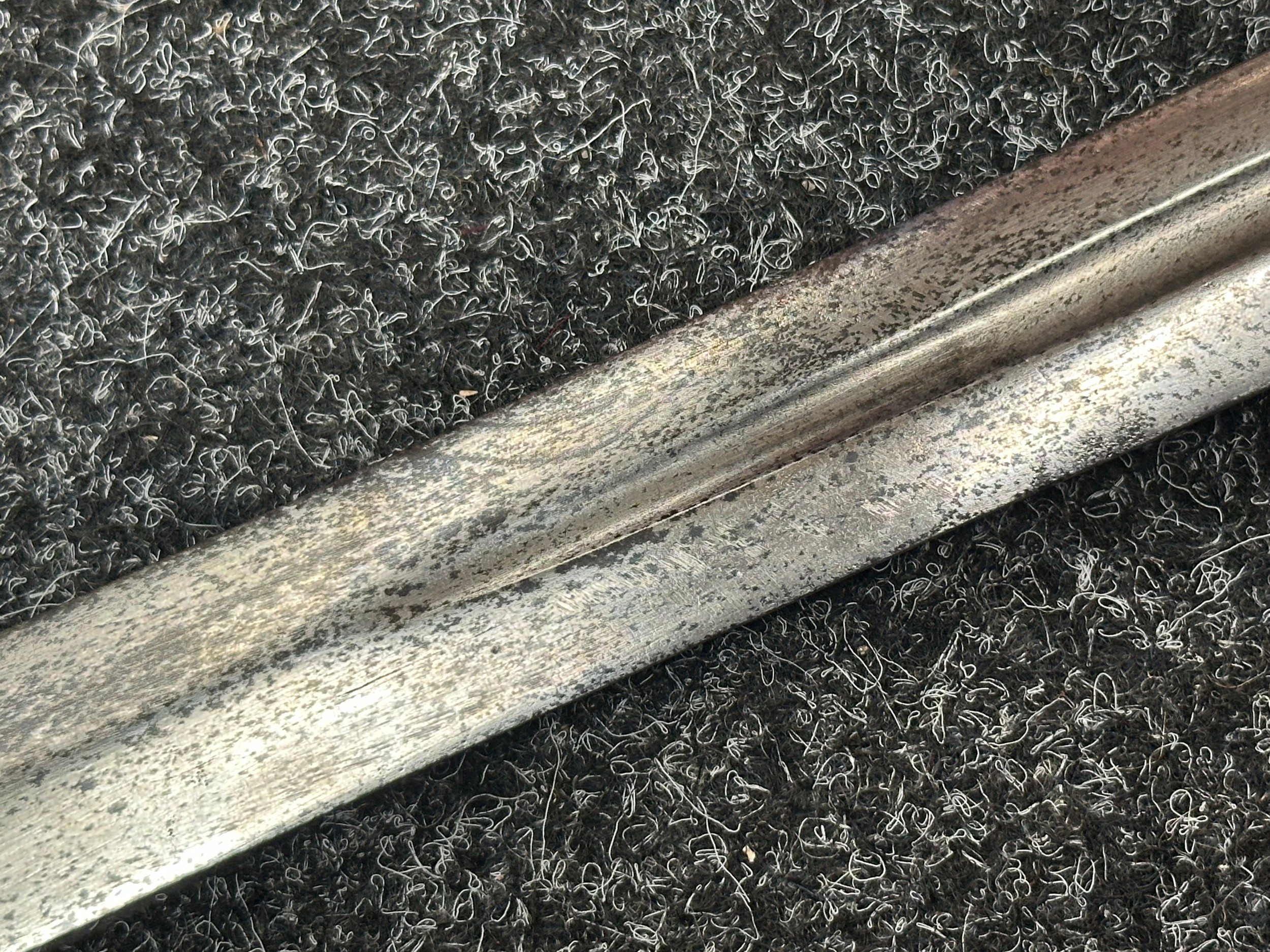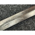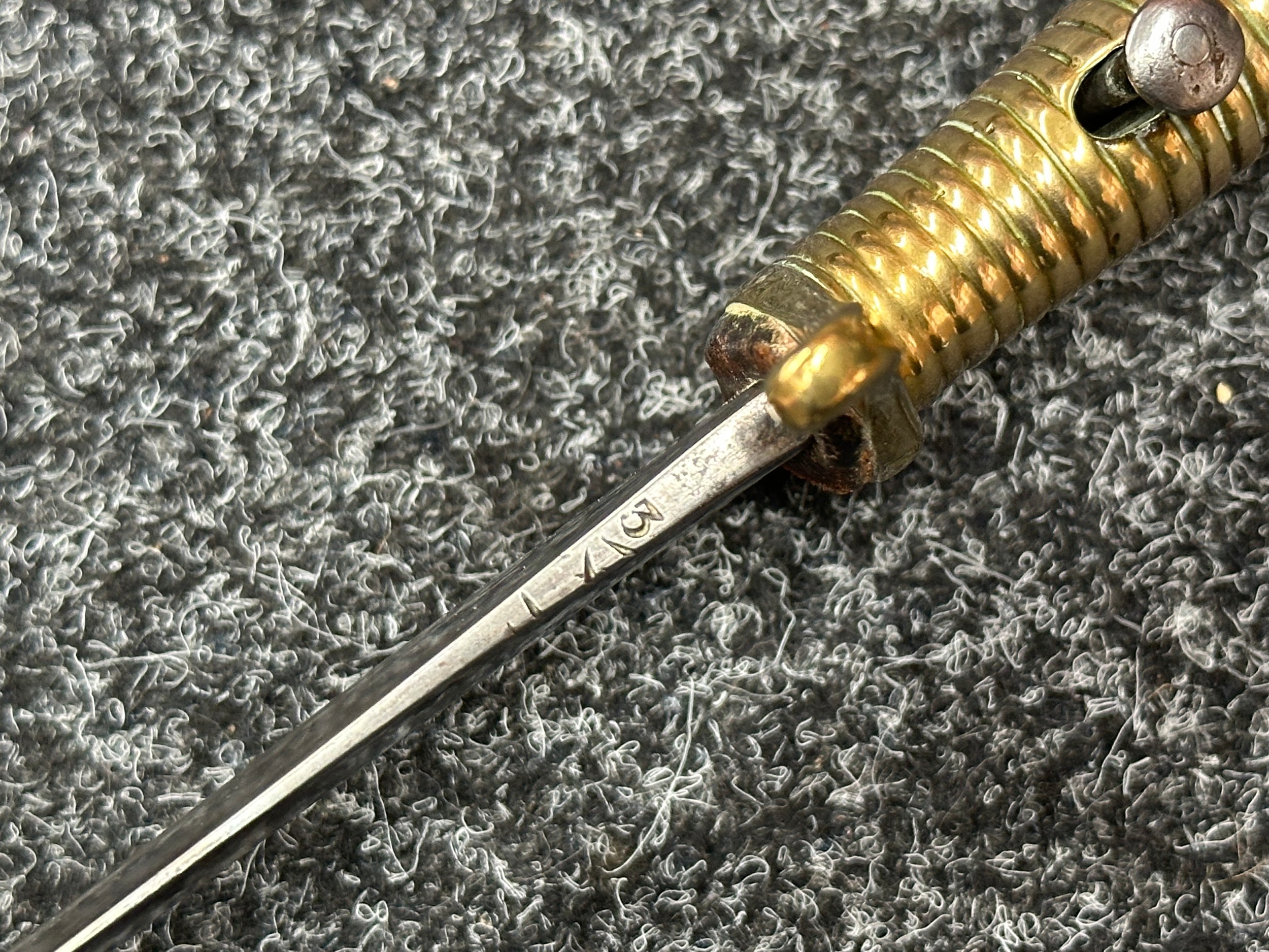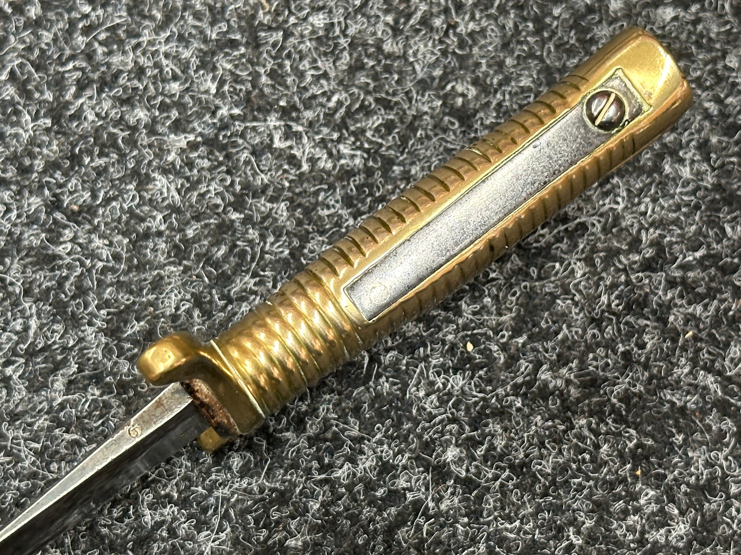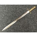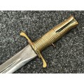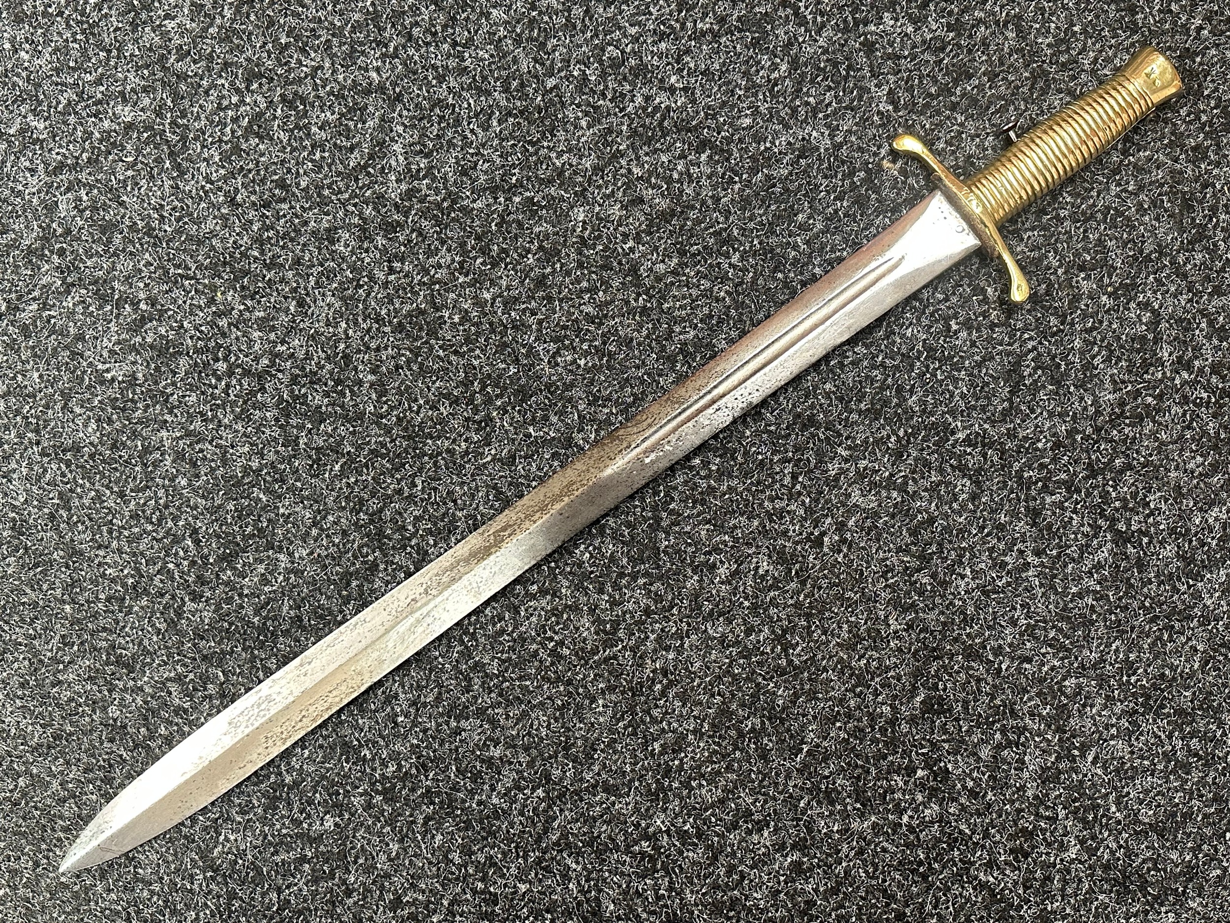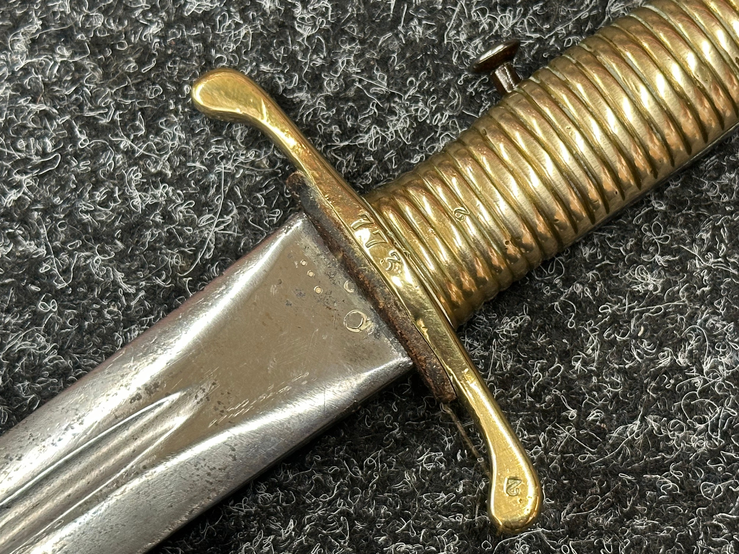 Brunswick Rifle Bayonet, 1st Pattern, with double edged fullered blade 550mm in length, maker marked and dated "VR Crown Enfield 1858". Also marked "2" to blade. Leather washer to blade. Cast brass fluted grip. Crossguard numbered "773". Both crossguard, grip and pommel marked "2". Pommel has double Broad Arrow sold out of service mark. Working release catch. Overall length 670mm. No scabbard.
