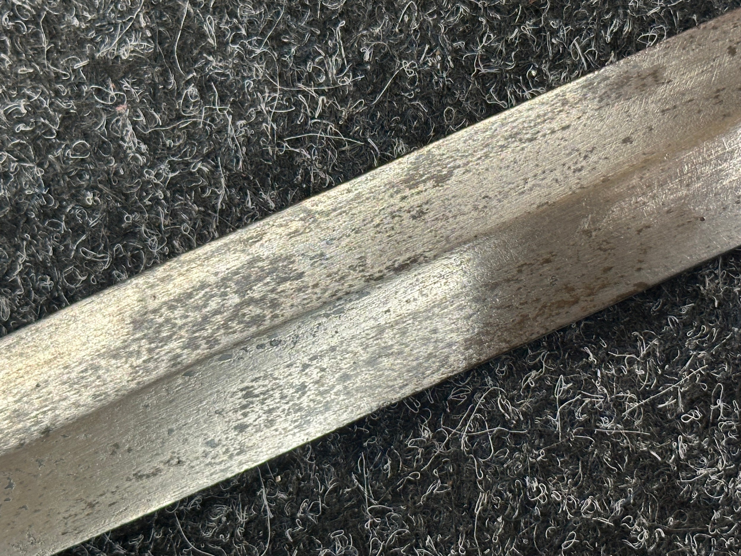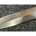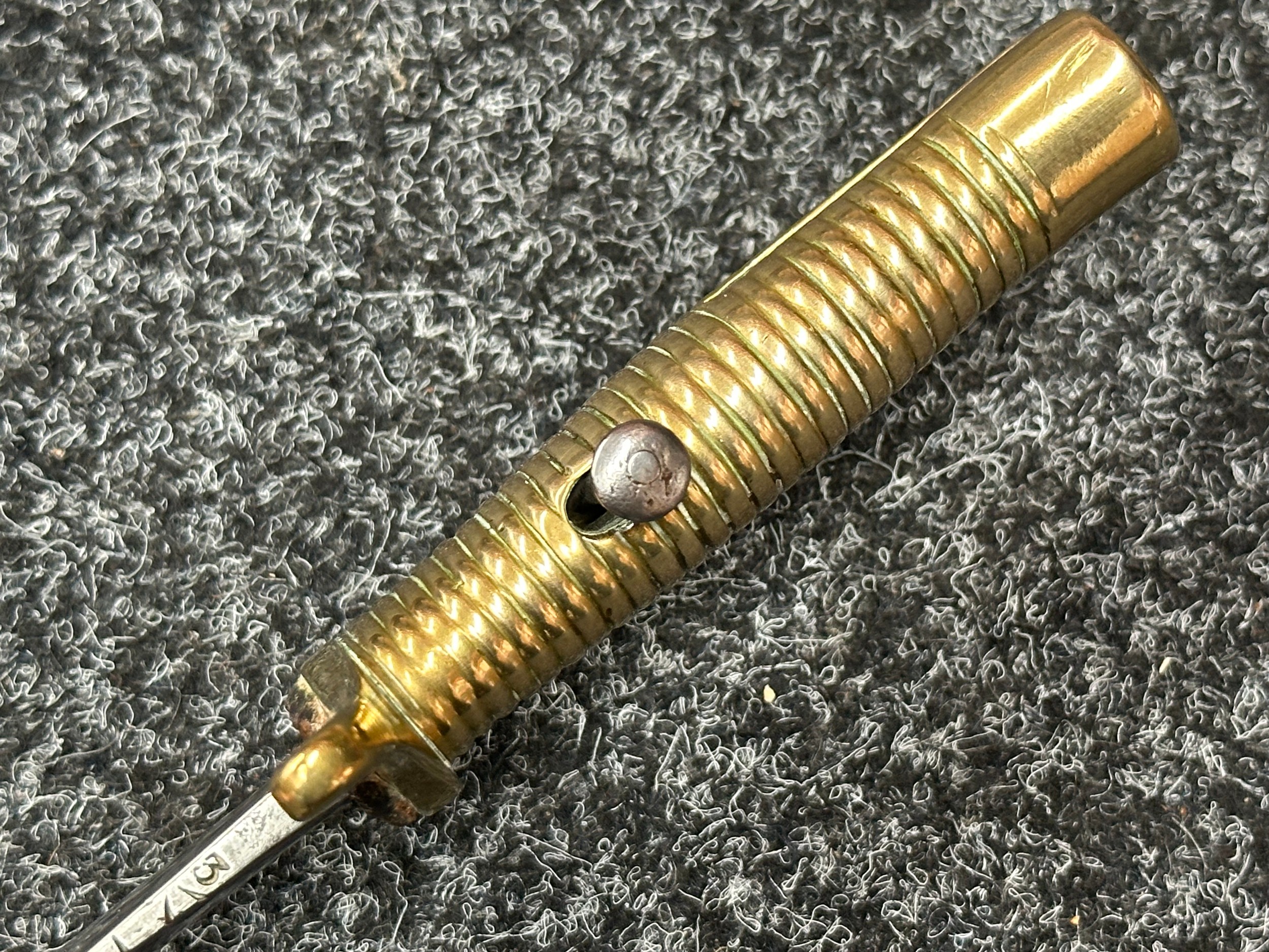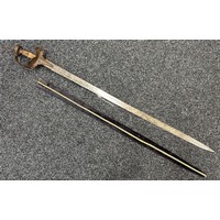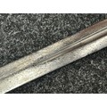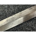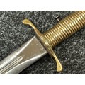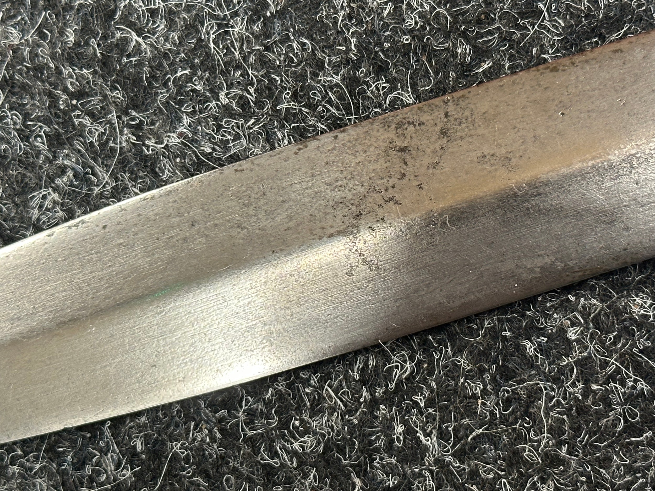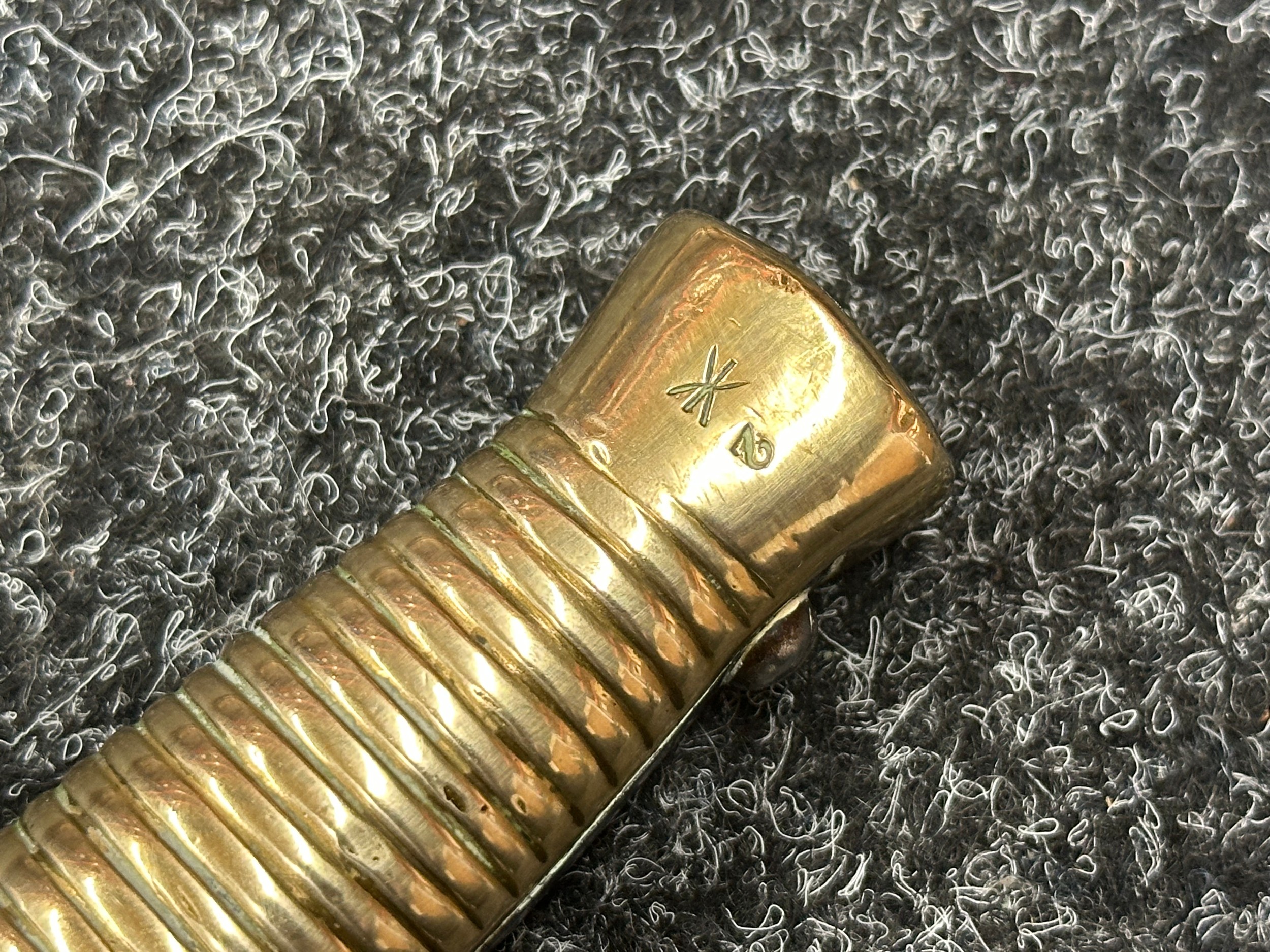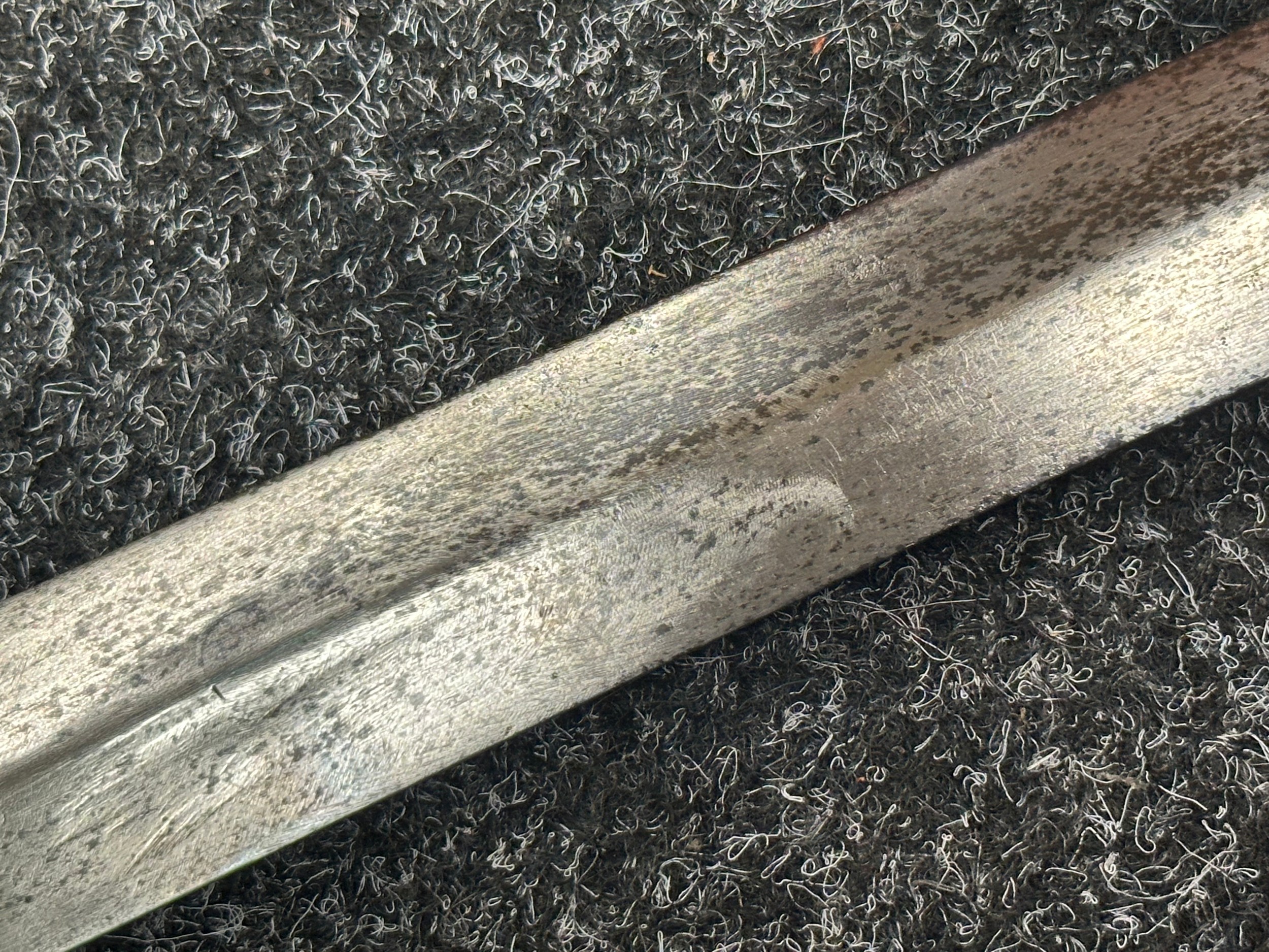 Brunswick Rifle Bayonet, 1st Pattern, with double edged fullered blade 550mm in length, maker marked and dated "VR Crown Enfield 1858". Also marked "2" to blade. Leather washer to blade. Cast brass fluted grip. Crossguard numbered "773". Both crossguard, grip and pommel marked "2". Pommel has double Broad Arrow sold out of service mark. Working release catch. Overall length 670mm. No scabbard.