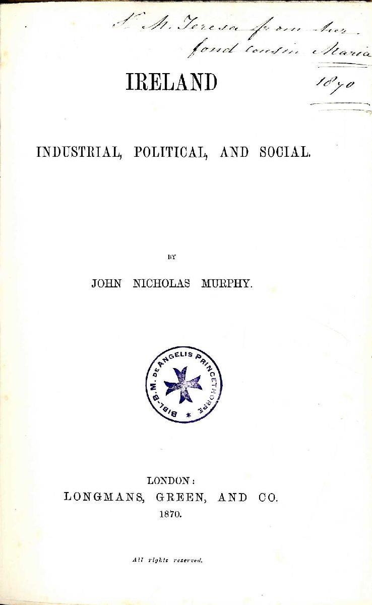 Murphy (John Nicholas) Ireland Industrial, Political and Social, 8vo L. 1870. First Edn., adverts. at end, orig. cloth. (1)