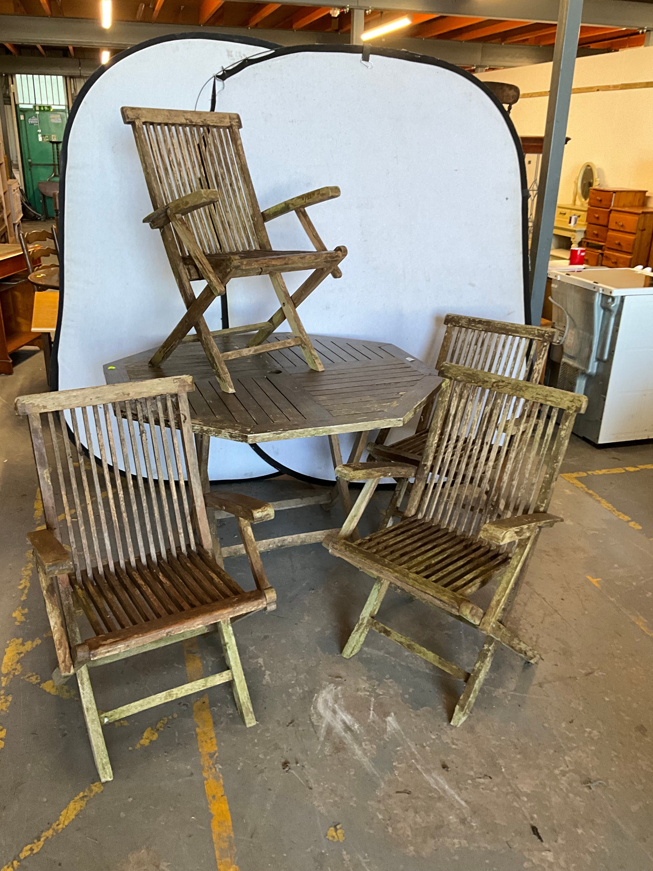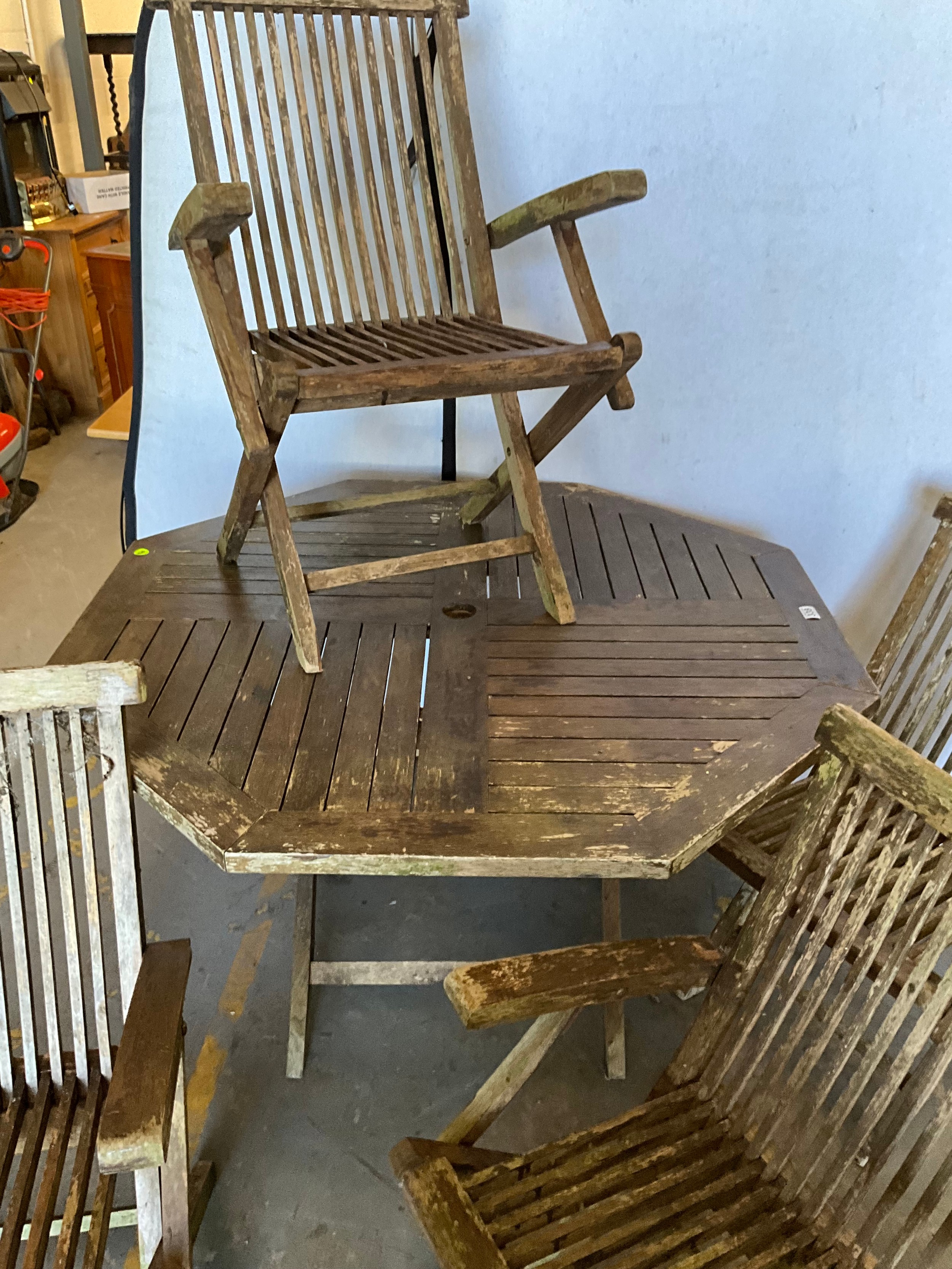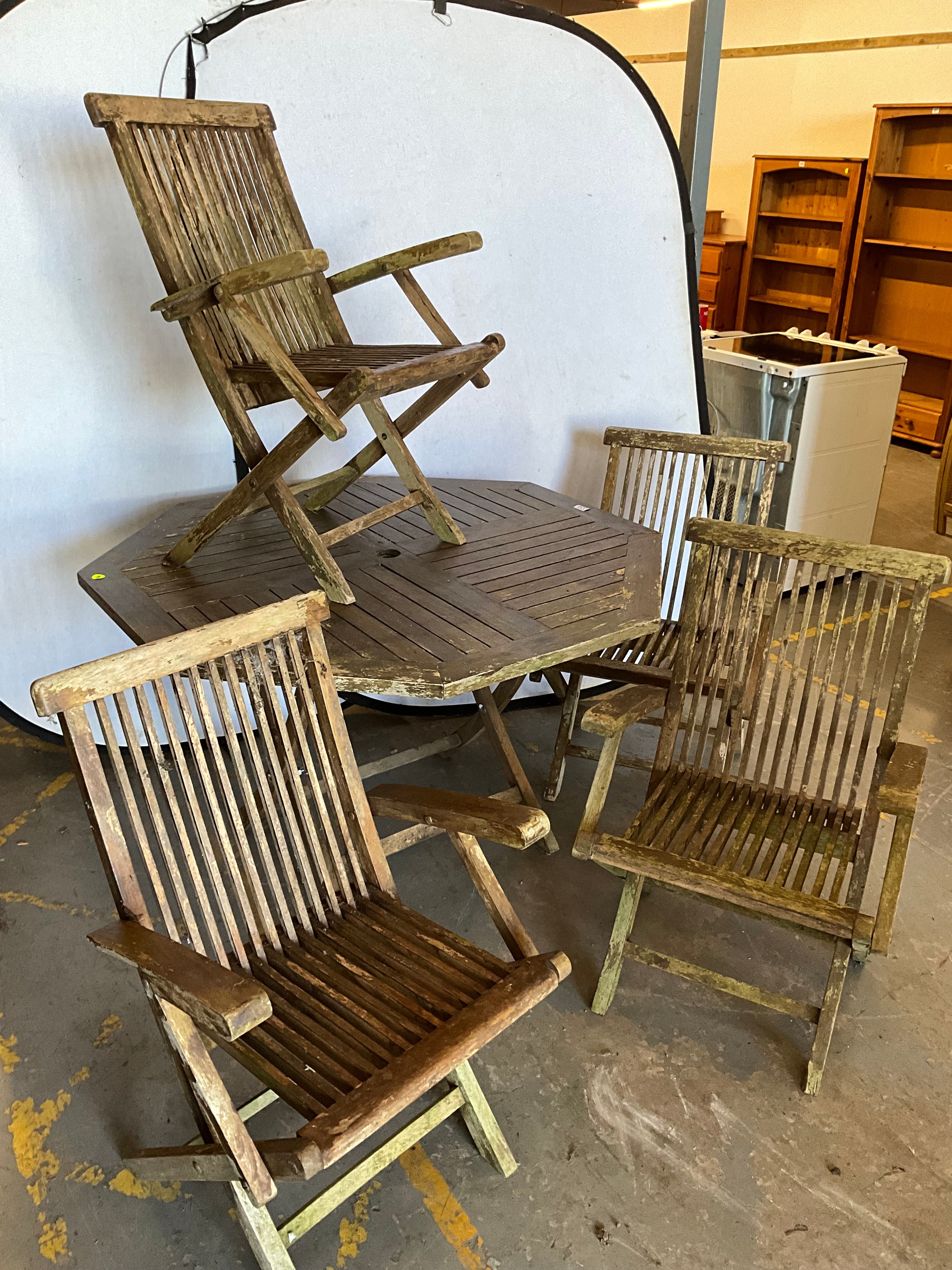 TEAK OCTAGNOL GARDEN TABLE WITH 4 MATCHING CHAIRS A/F H30"DIA47"