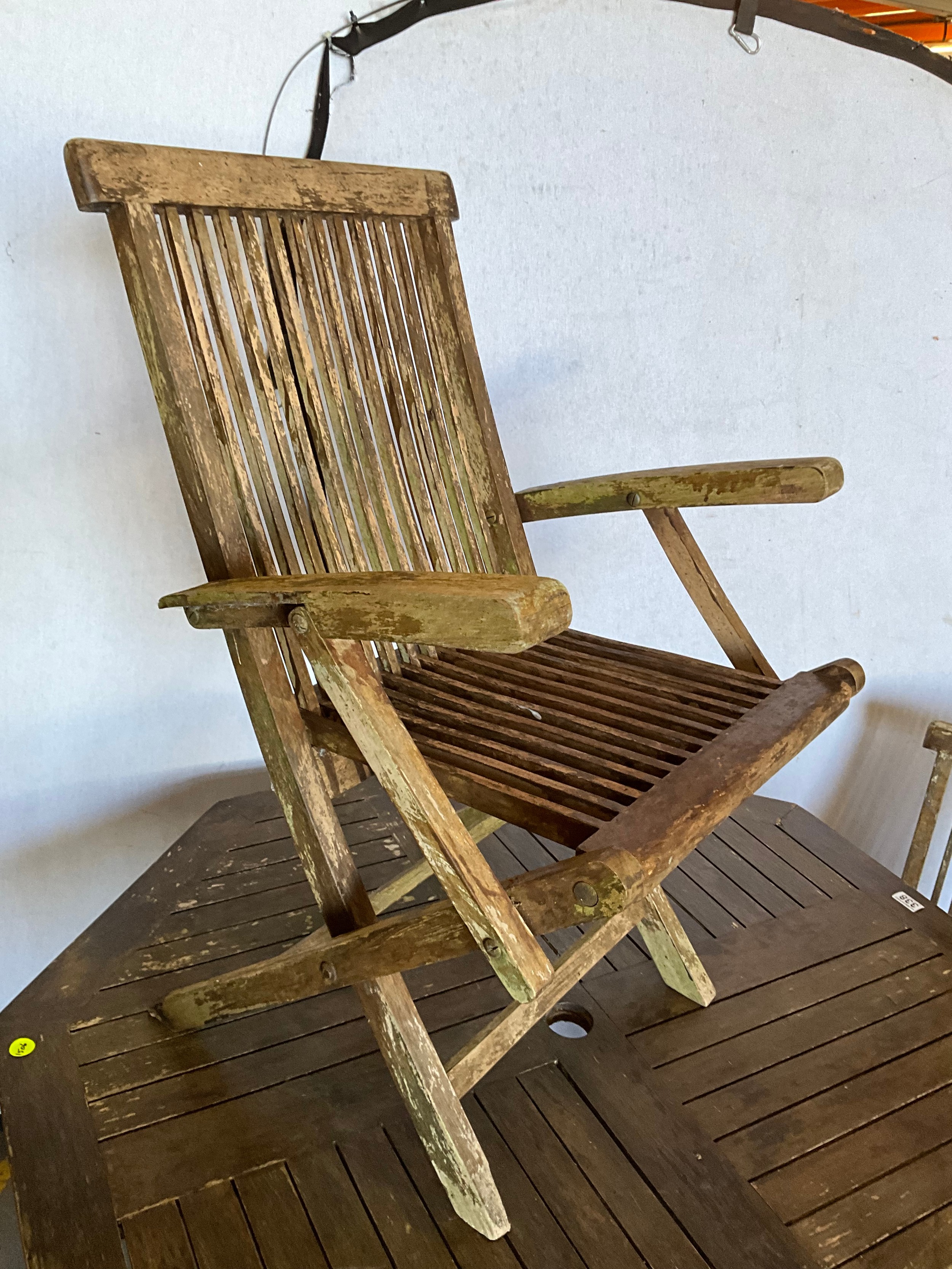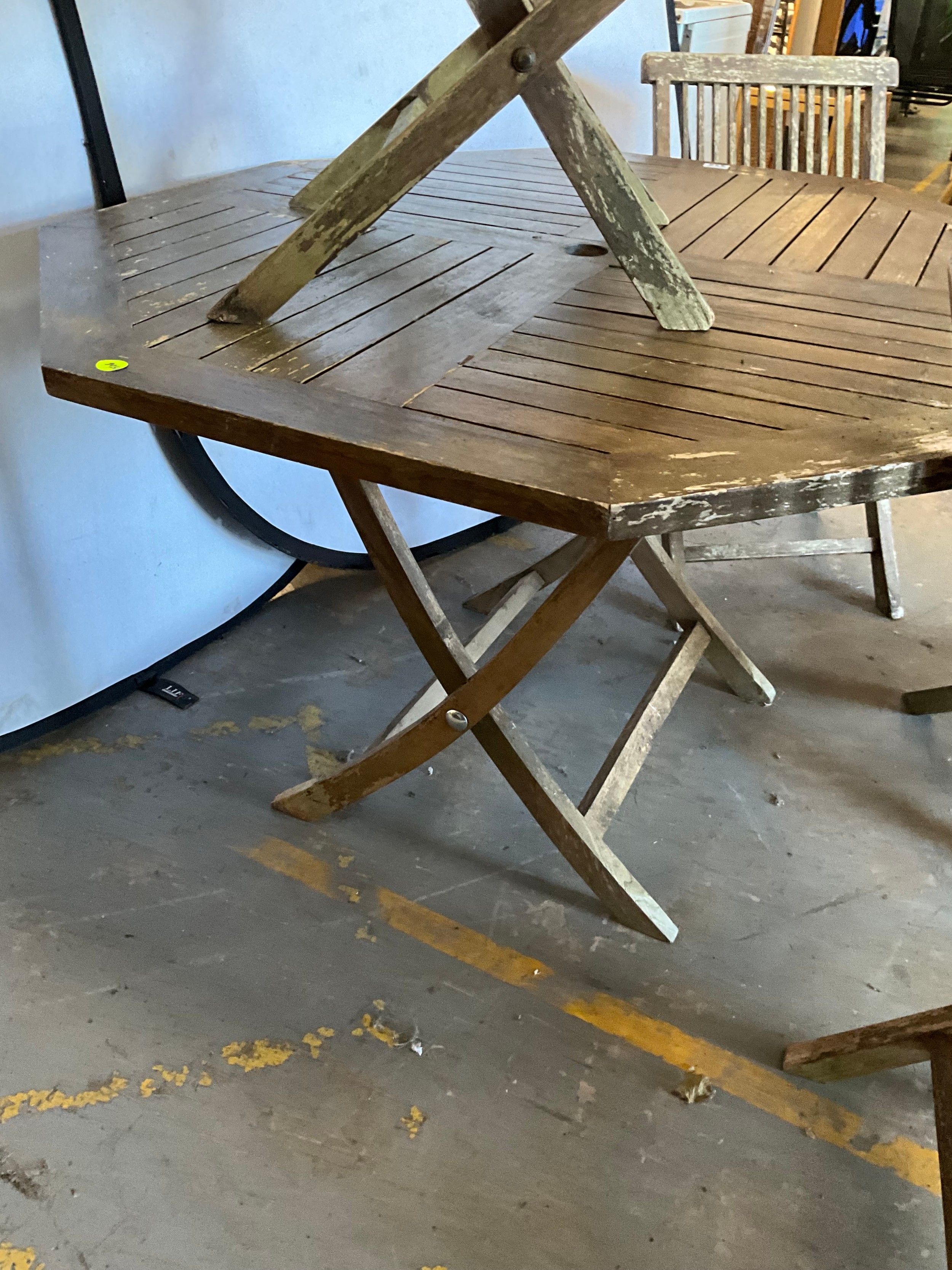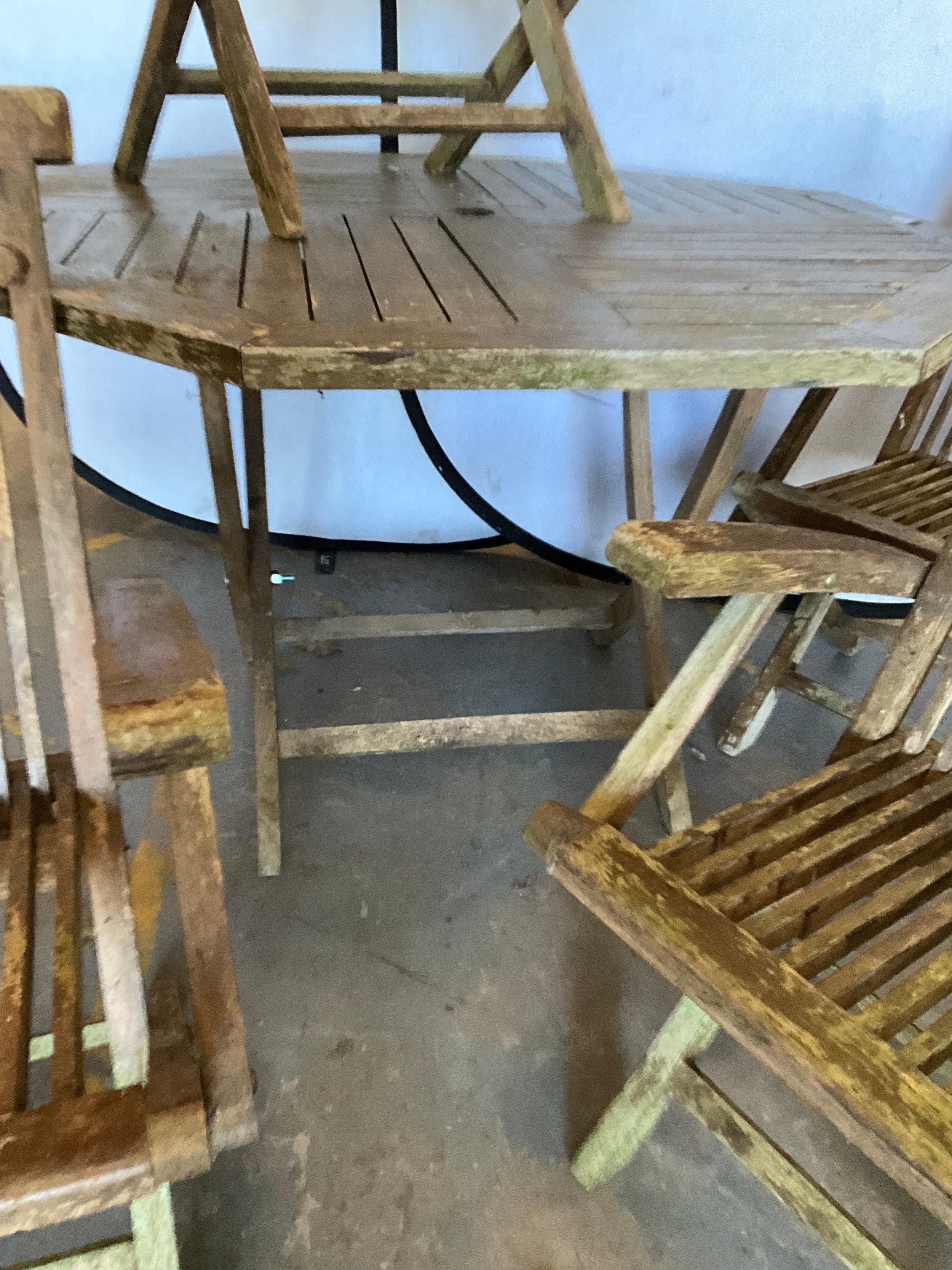 TEAK OCTAGNOL GARDEN TABLE WITH 4 MATCHING CHAIRS A/F H30"DIA47"