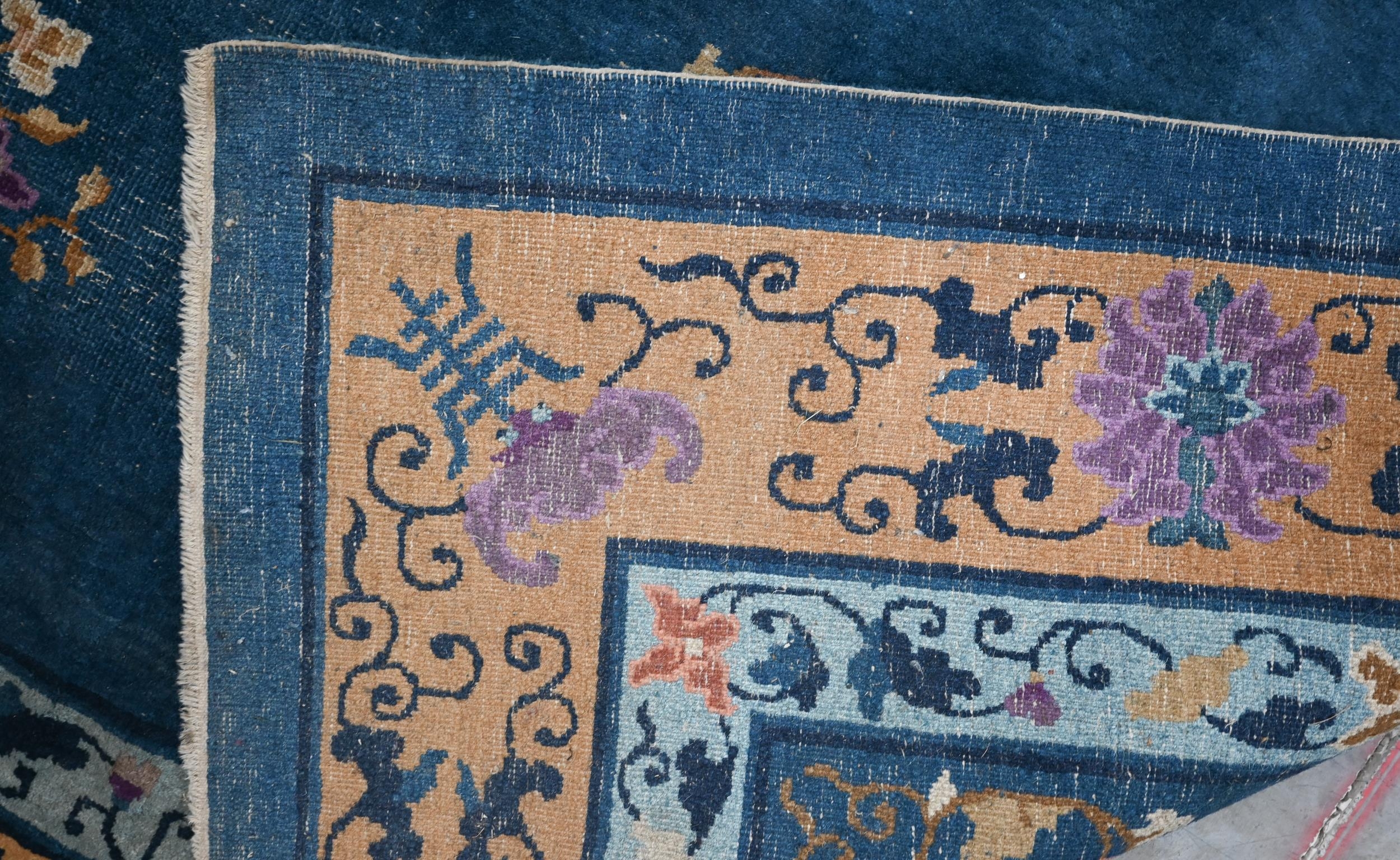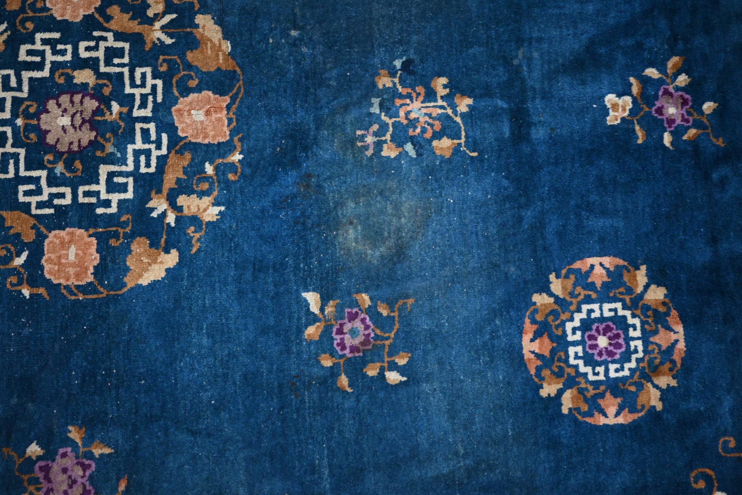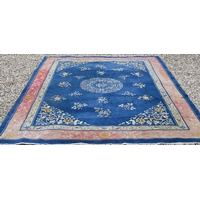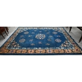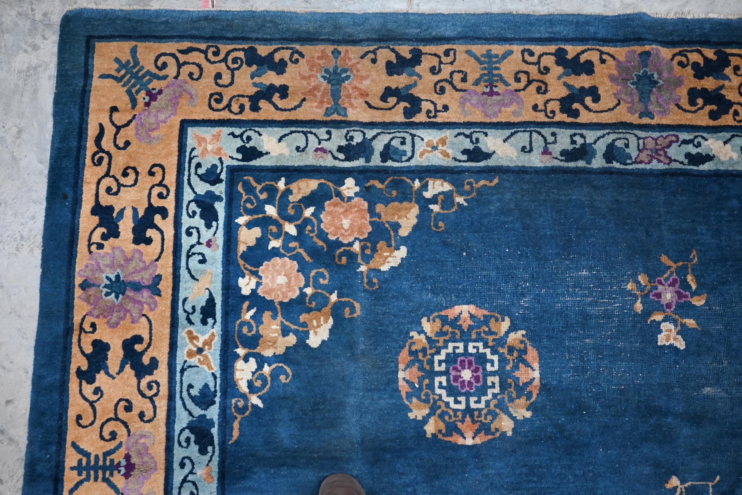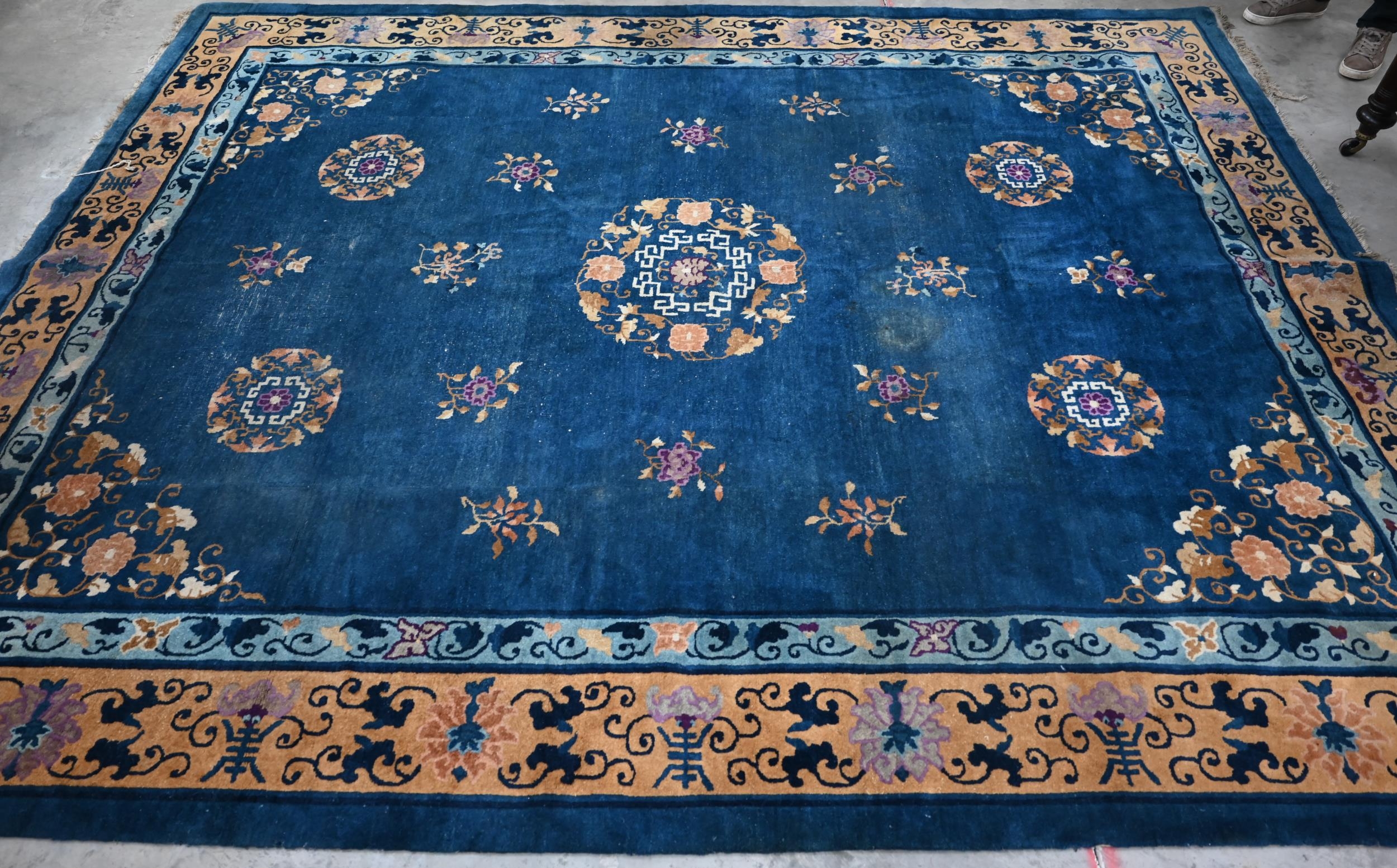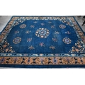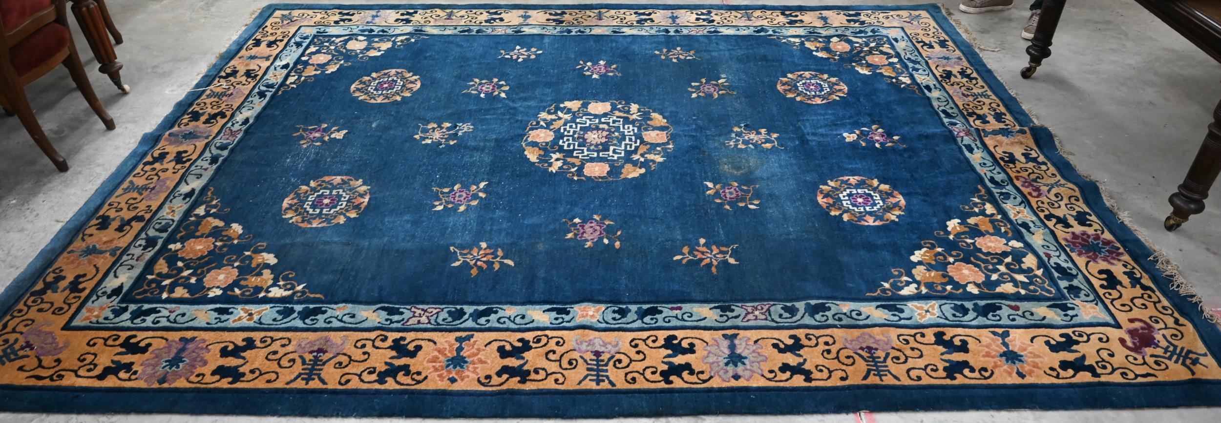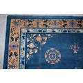 A Mid-Century Chinese Peking carpet, scattered design with floral sprays and roundels on blue ground, beige border with bats, lotus and Shou symbols, 360 x 270 cm