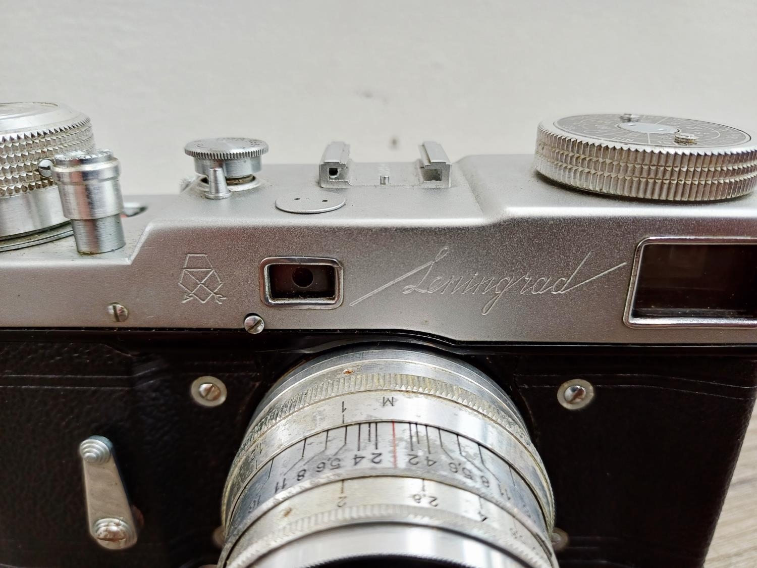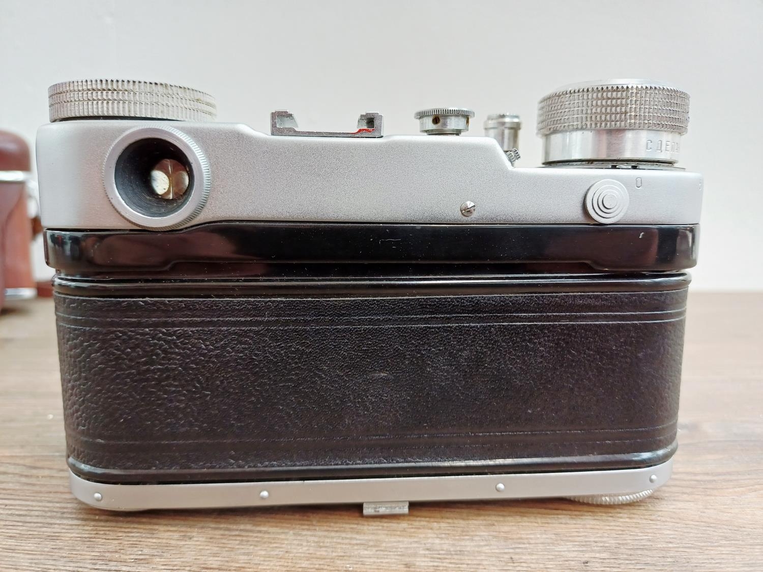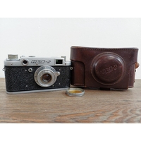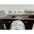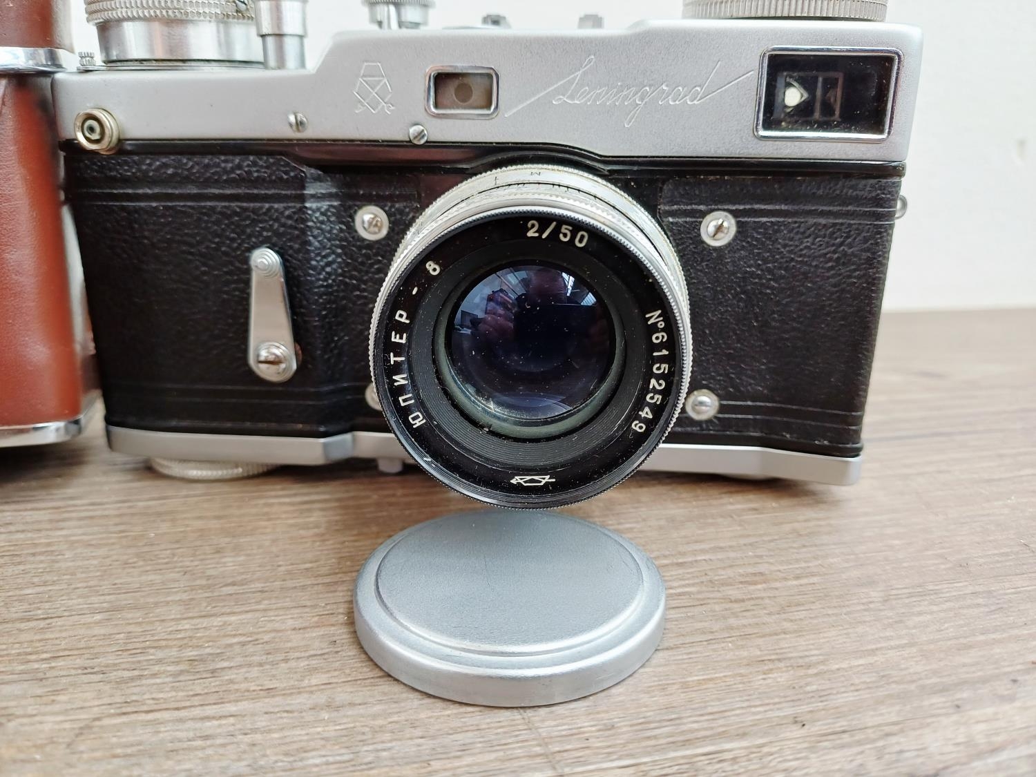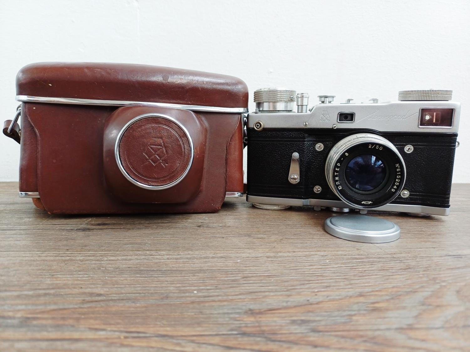 A cased GOMZ Leningrad interchangeable-lens 35mm rangefinder camera fitted with KMZ Jupiter-8 1:2 50mm lens