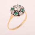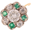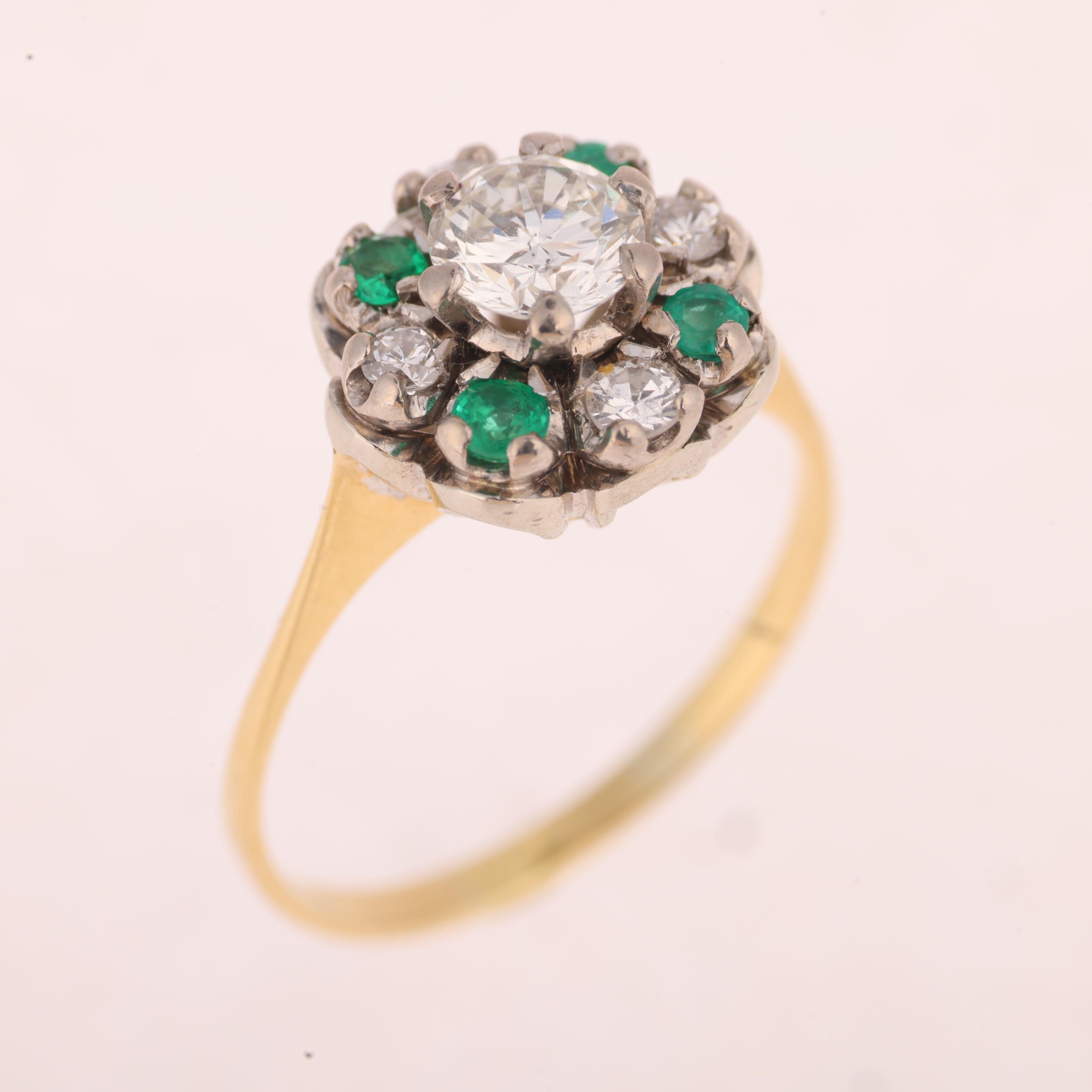 An 18ct gold emerald and diamond flowerhead cluster ring, set with round-cut emeralds and modern round brilliant-cut diamonds, principal diamond approx 0.65ct, total diamond content approx 0.85ct, setting height 11.2mm, size P, 3.8g, with GLS Jewellery report