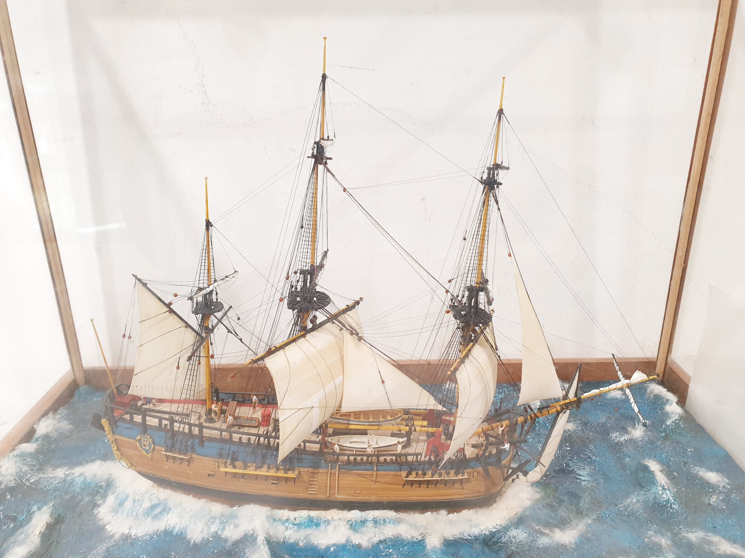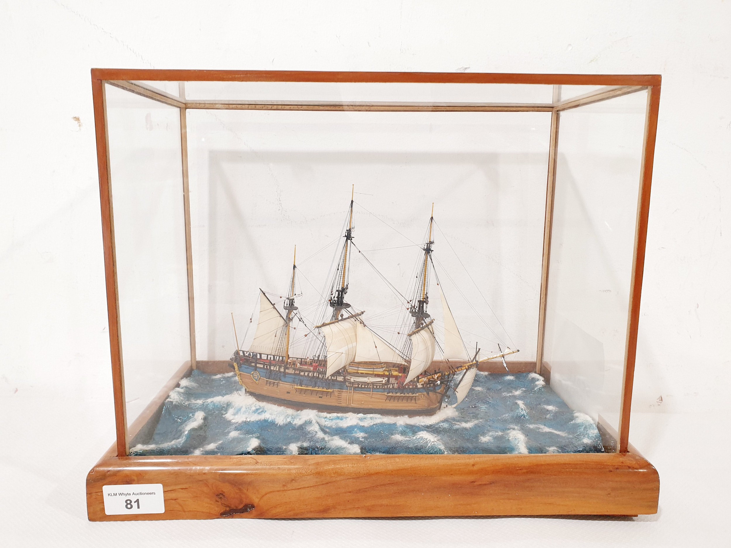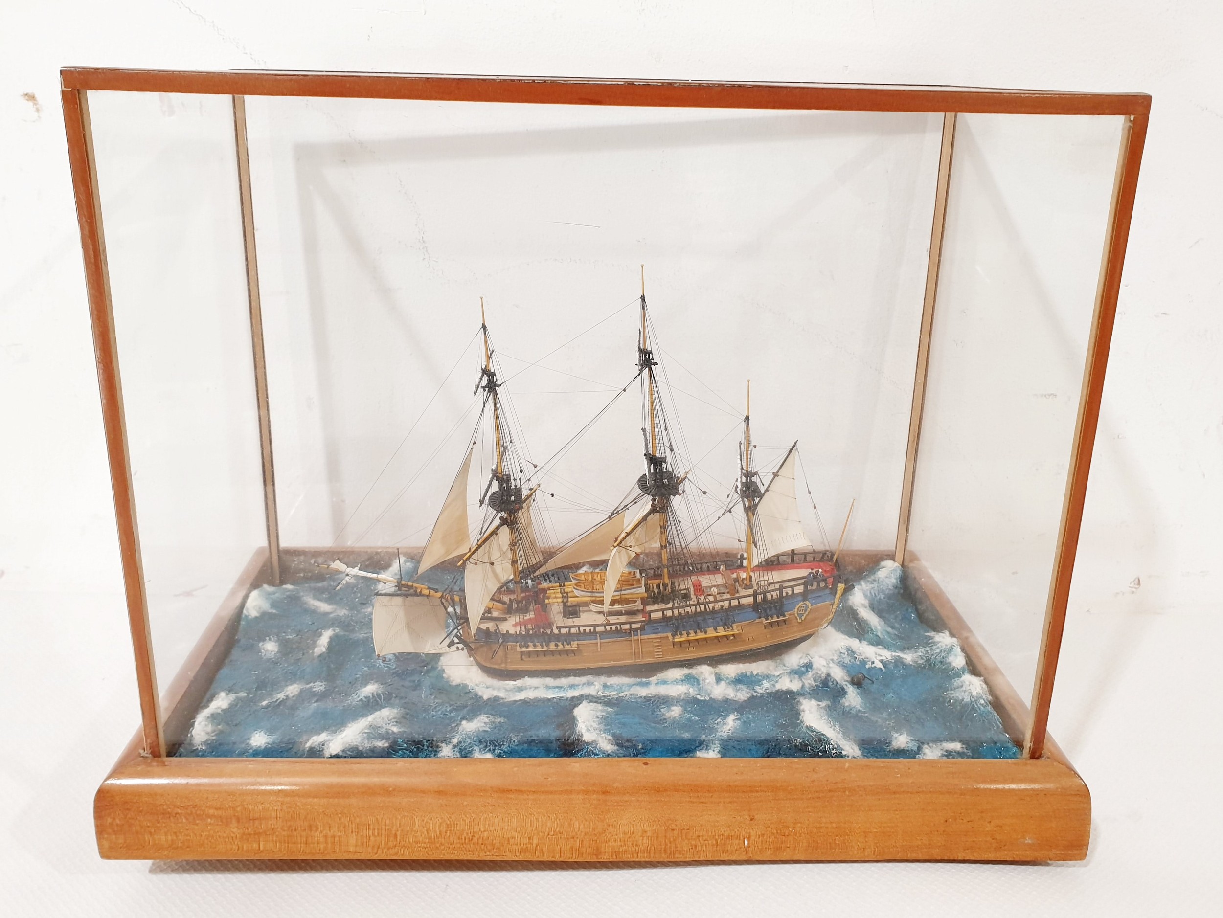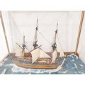 A hand built scale model diorama of HMS Endeavour in a glass and wood case 37.5x21x29.5cm. No Shipping. Arrange collection or your own packer and shipper, please.