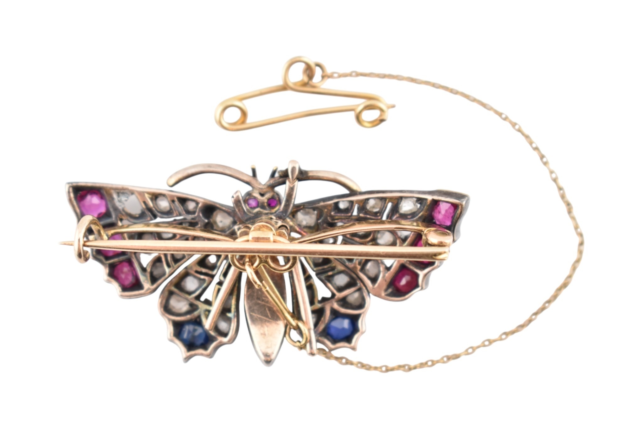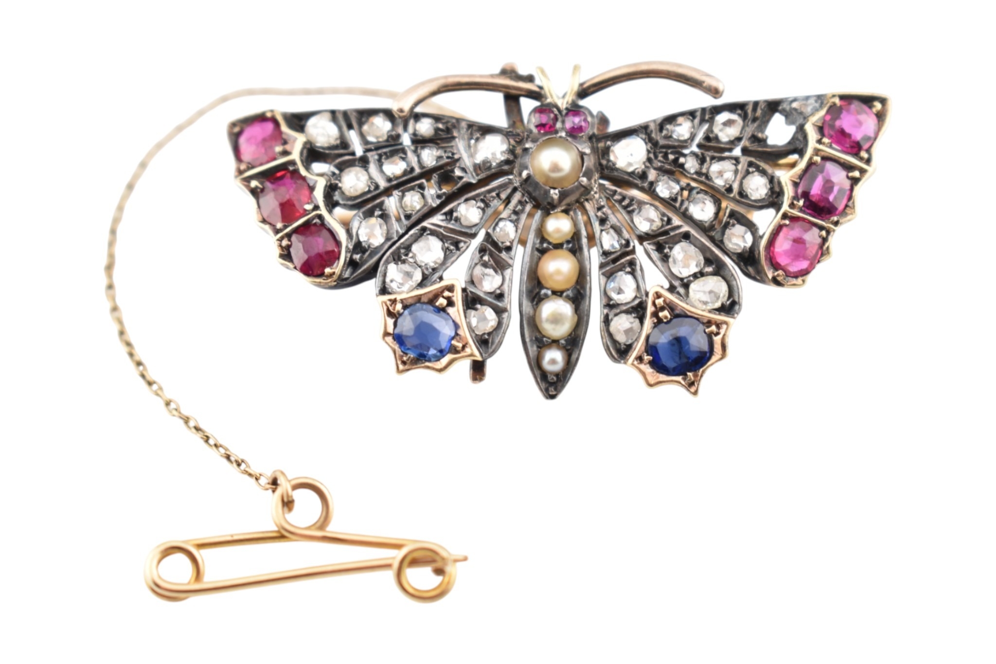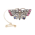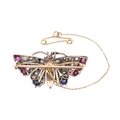 A Victorian 19th century gold, ruby, sapphire, split pearl and diamond cluster set butterfly brooch. Complete with safety chain. Weight 8.8g. Measures 4cm (af)