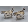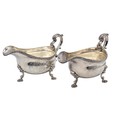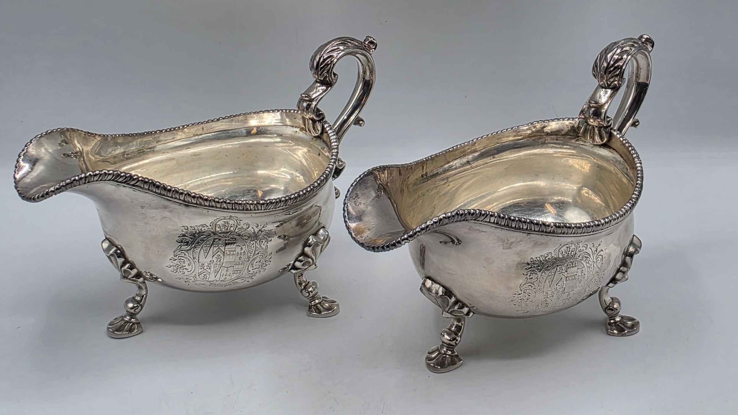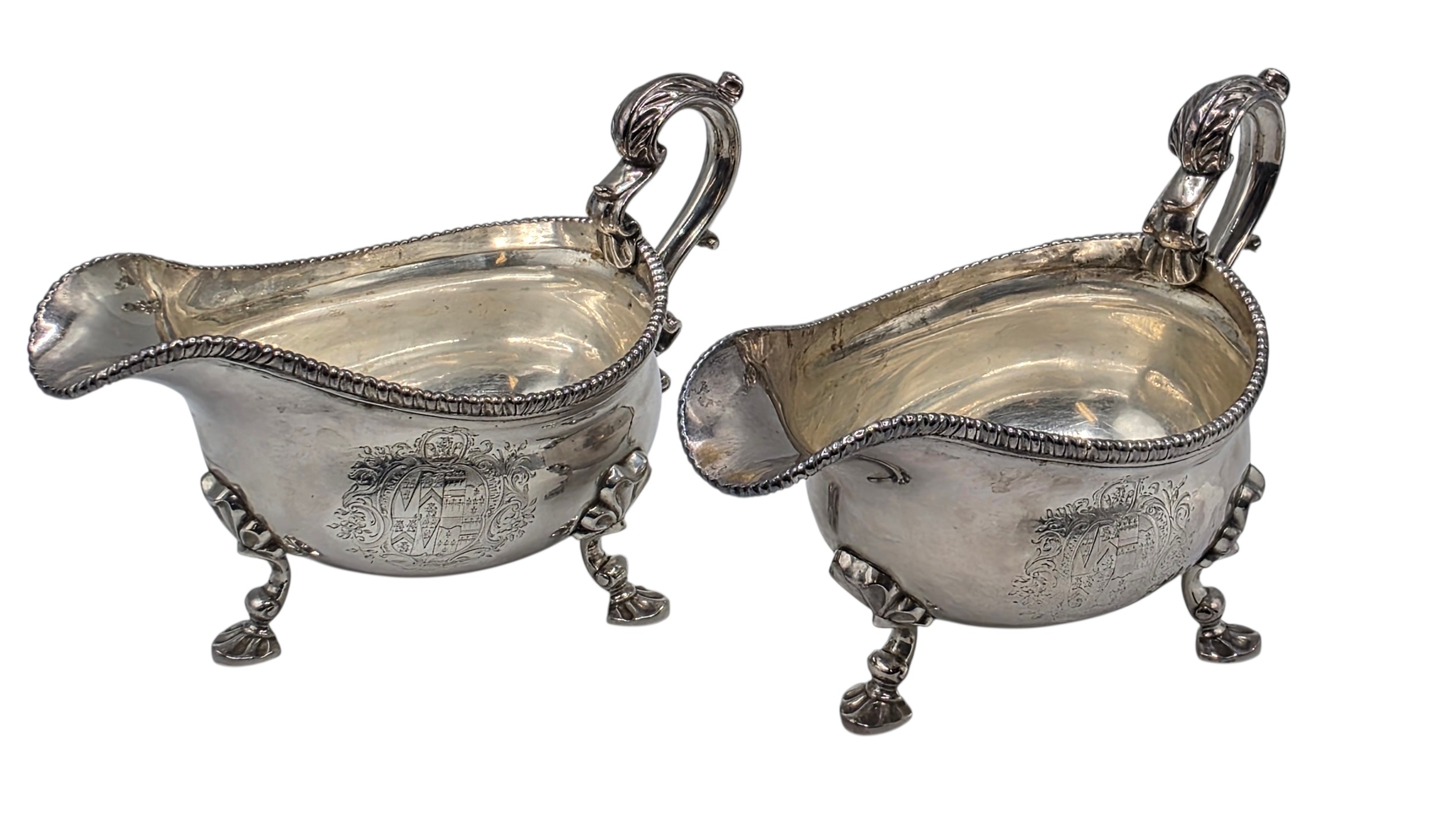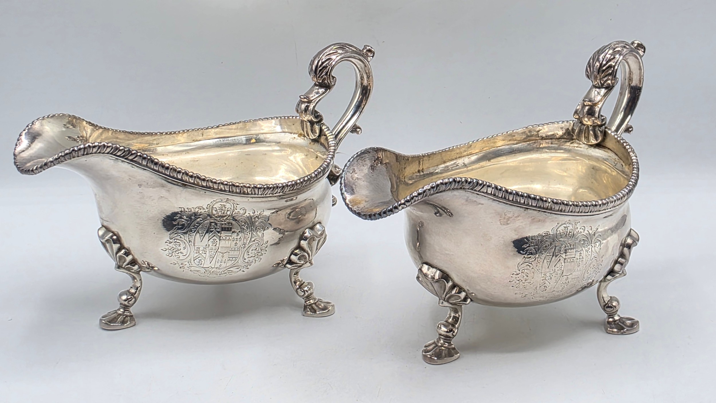 A pair of sterling silver sauceboats with cast beaded rim and scroll handles. With chased armorial of quartered shield topped by coronet. By Samuel Courtauld, London. 1007g.