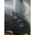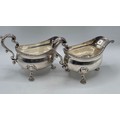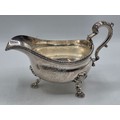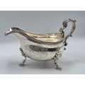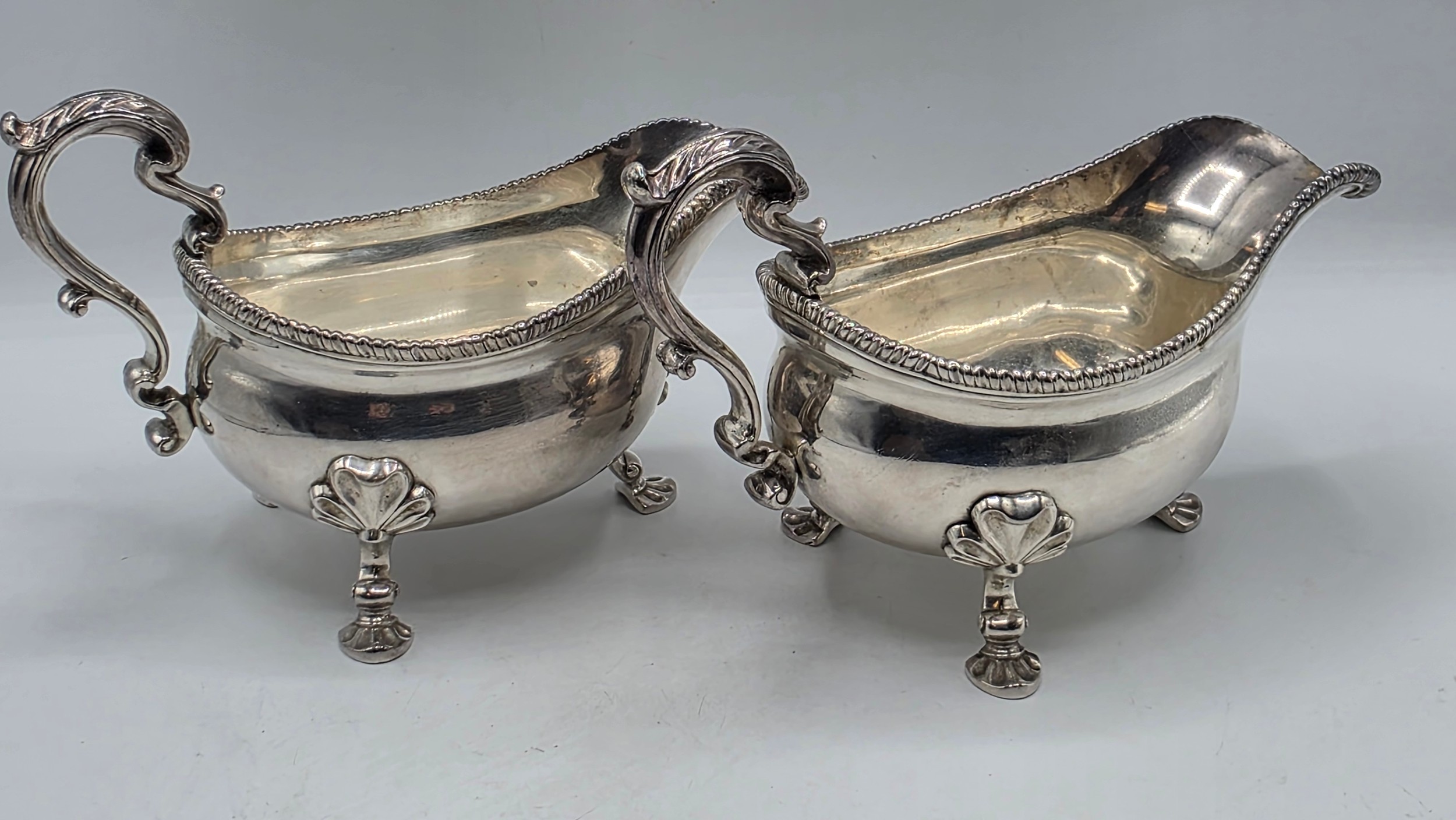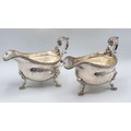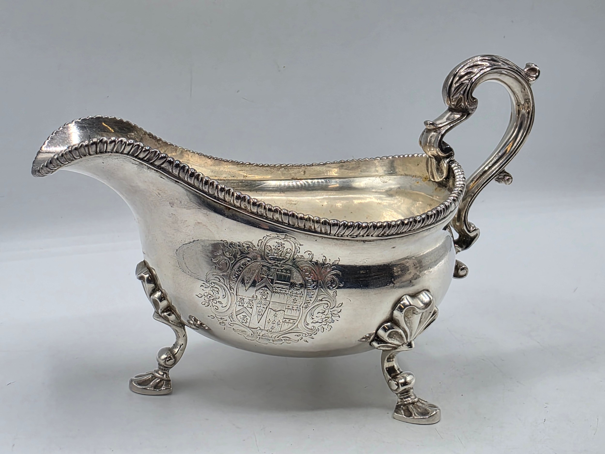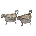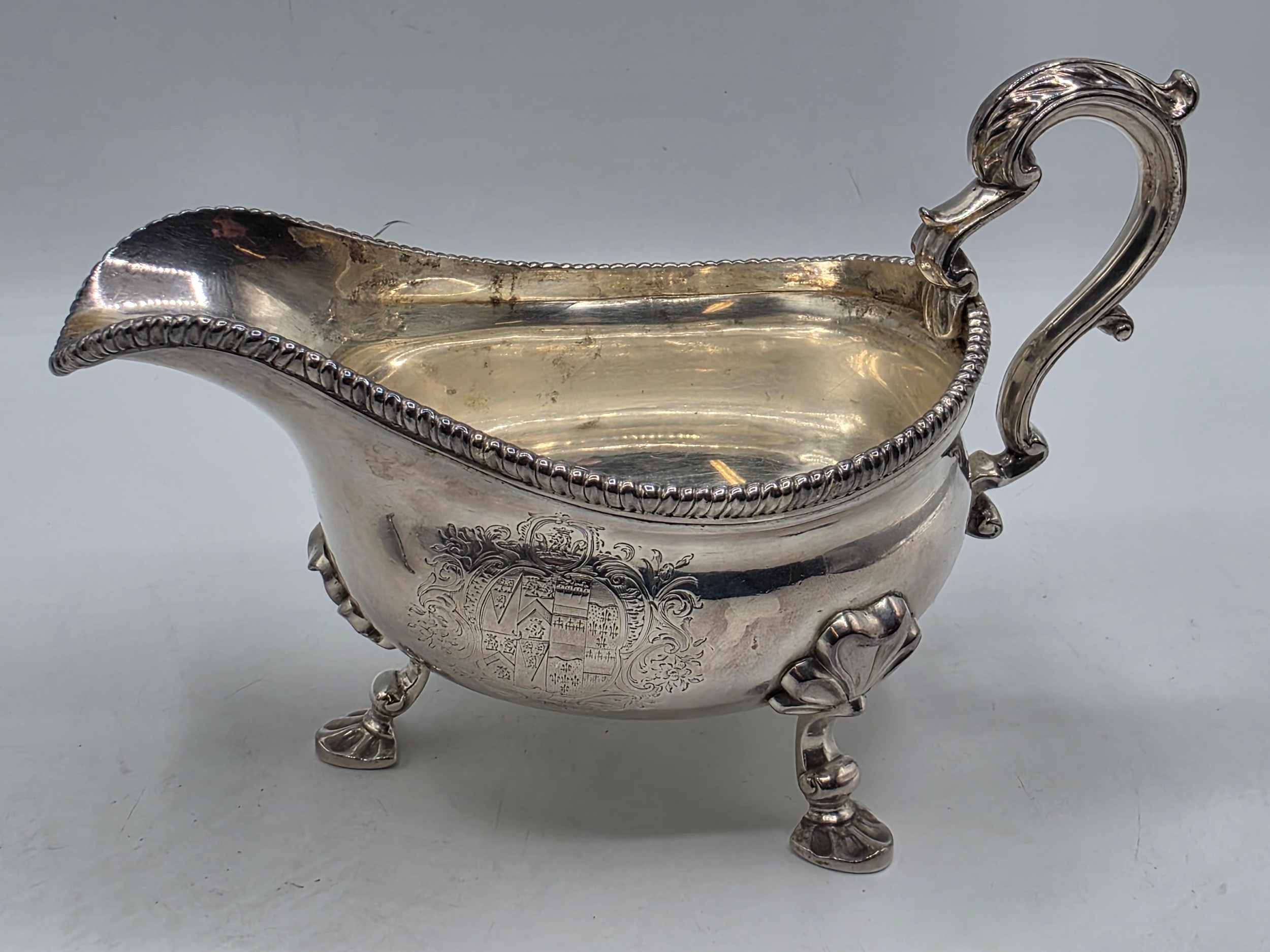 A pair of sterling silver sauceboats with cast beaded rim and scroll handles. With chased armorial of quartered shield topped by coronet. By Samuel Courtauld, London. 1007g.