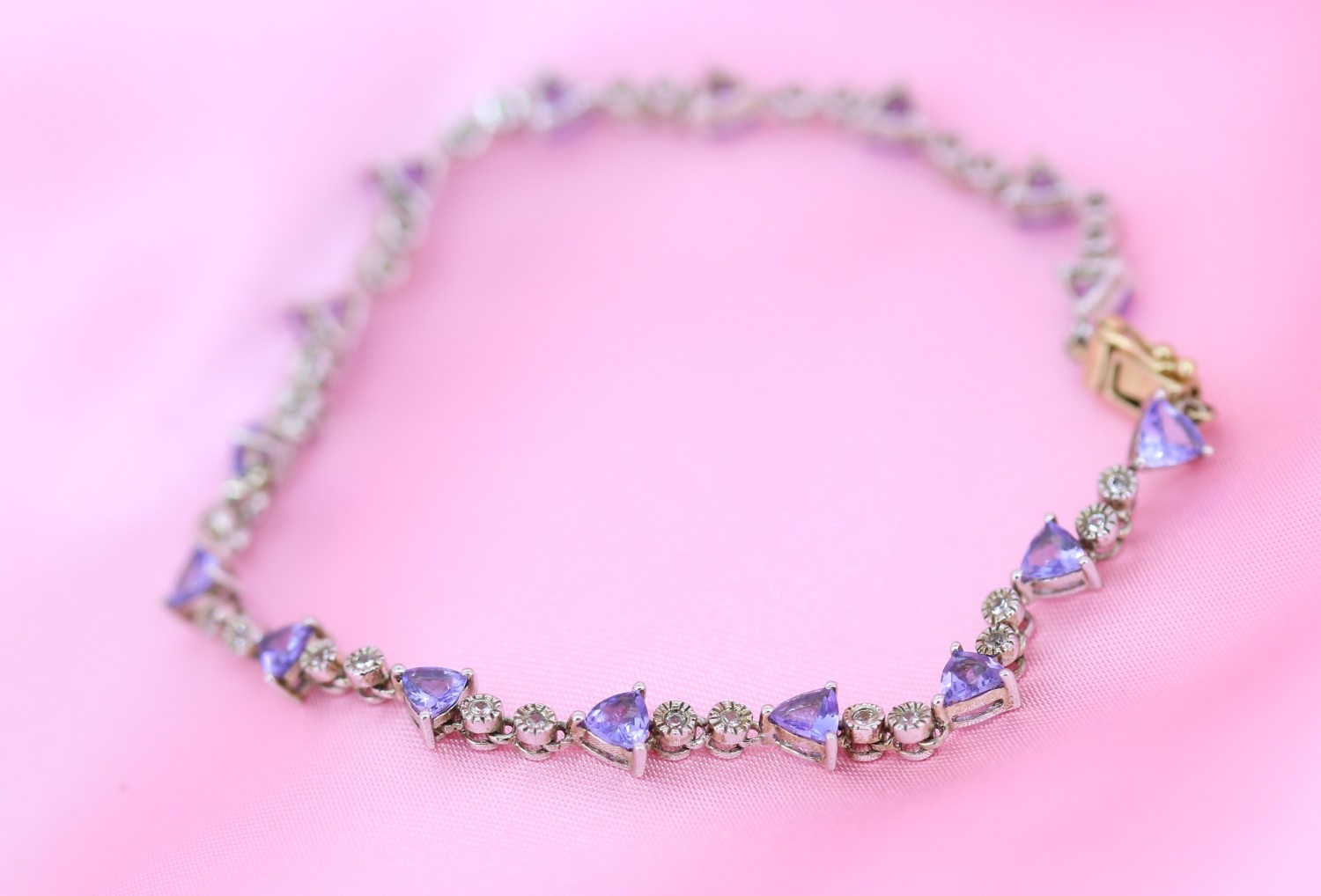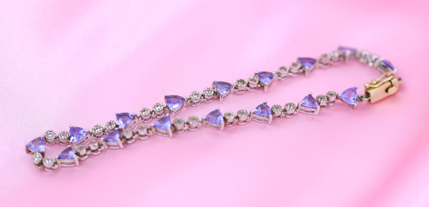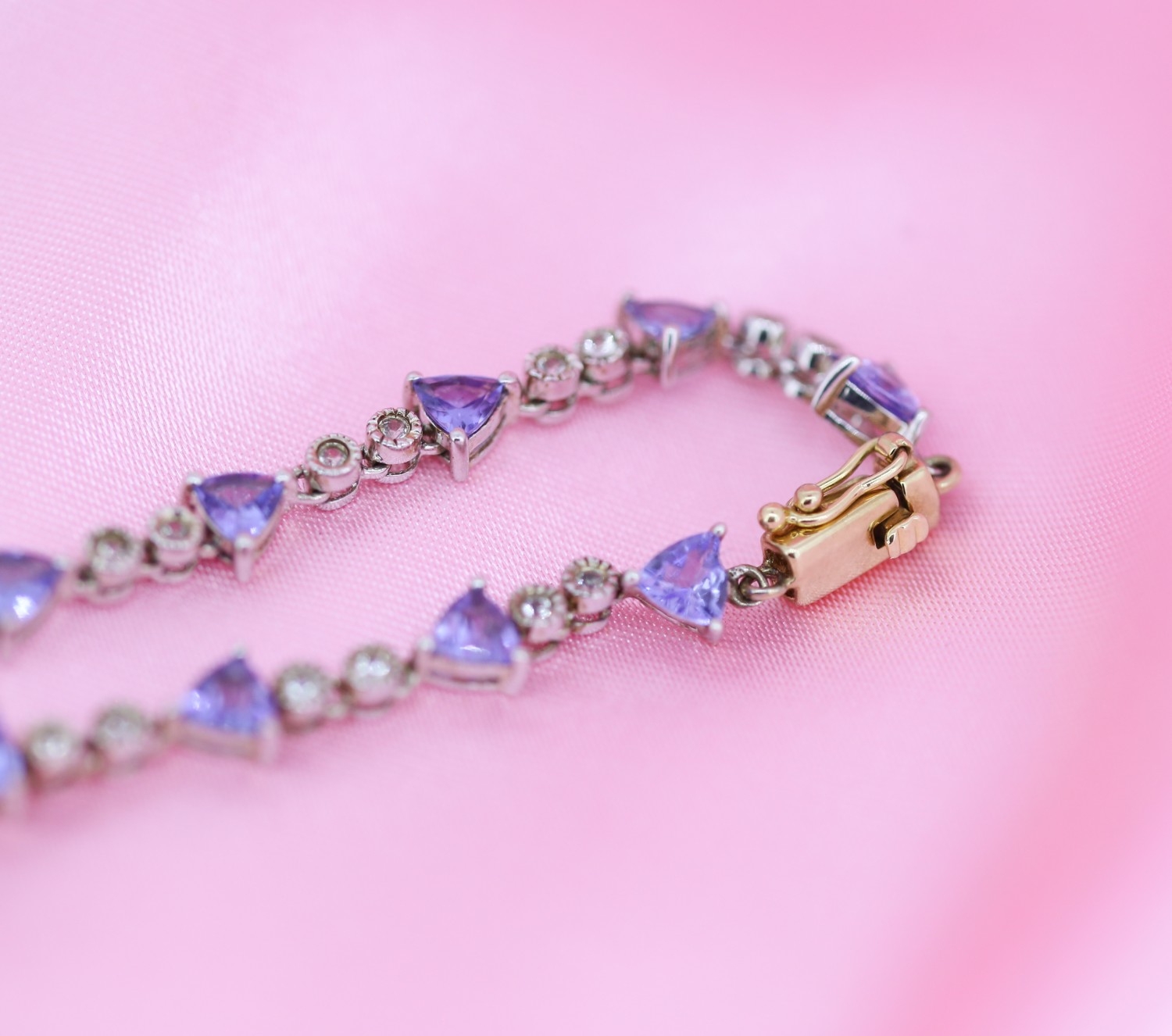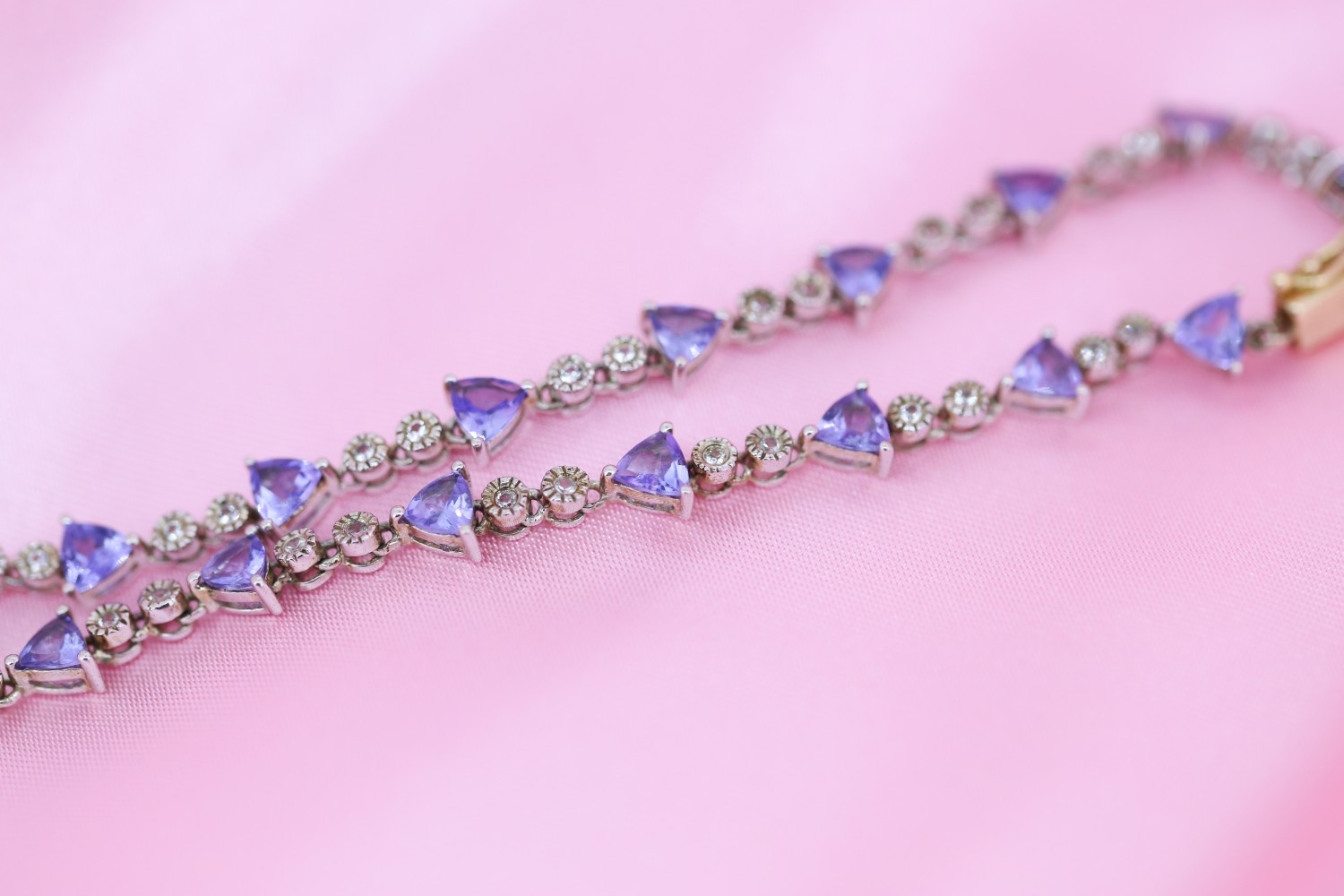 Finely Detailed Triangle Cut Tanzanite and Diamond Set Ladies Bracelet Mounted in 14 Carat White and Yellow Gold 18.5cm Long