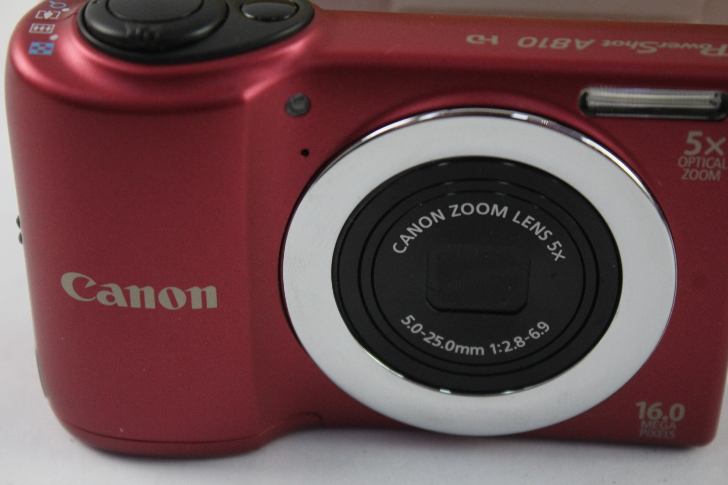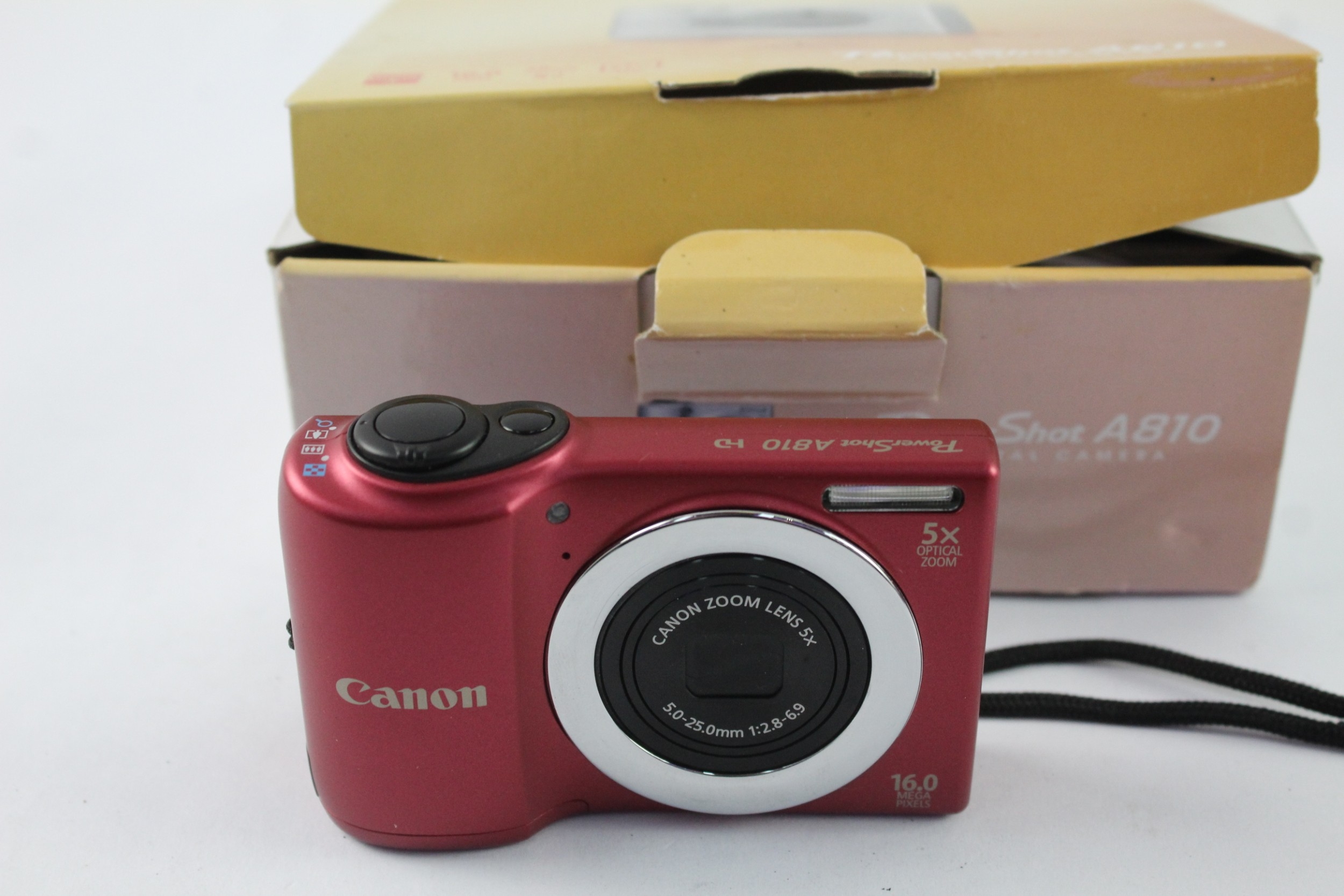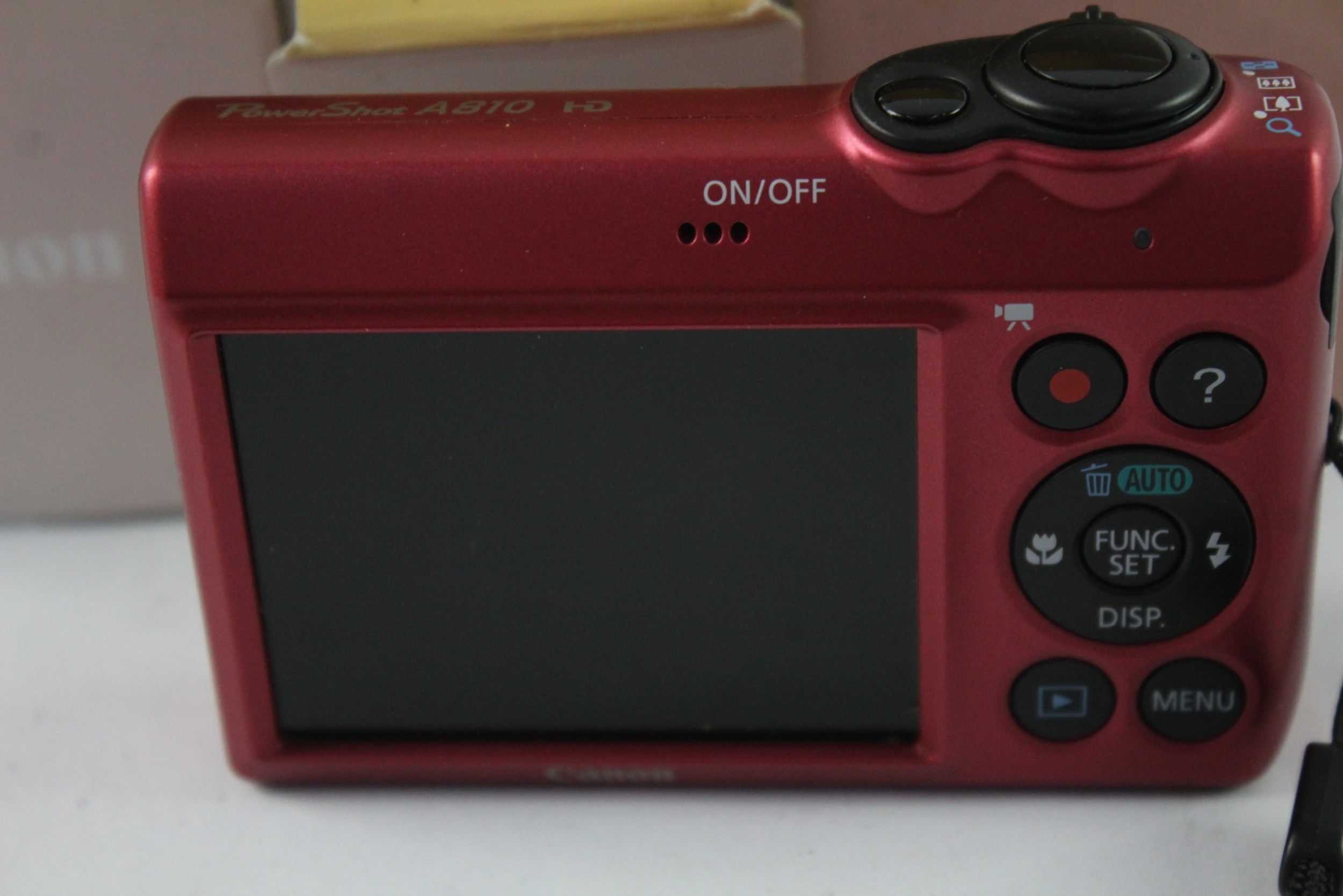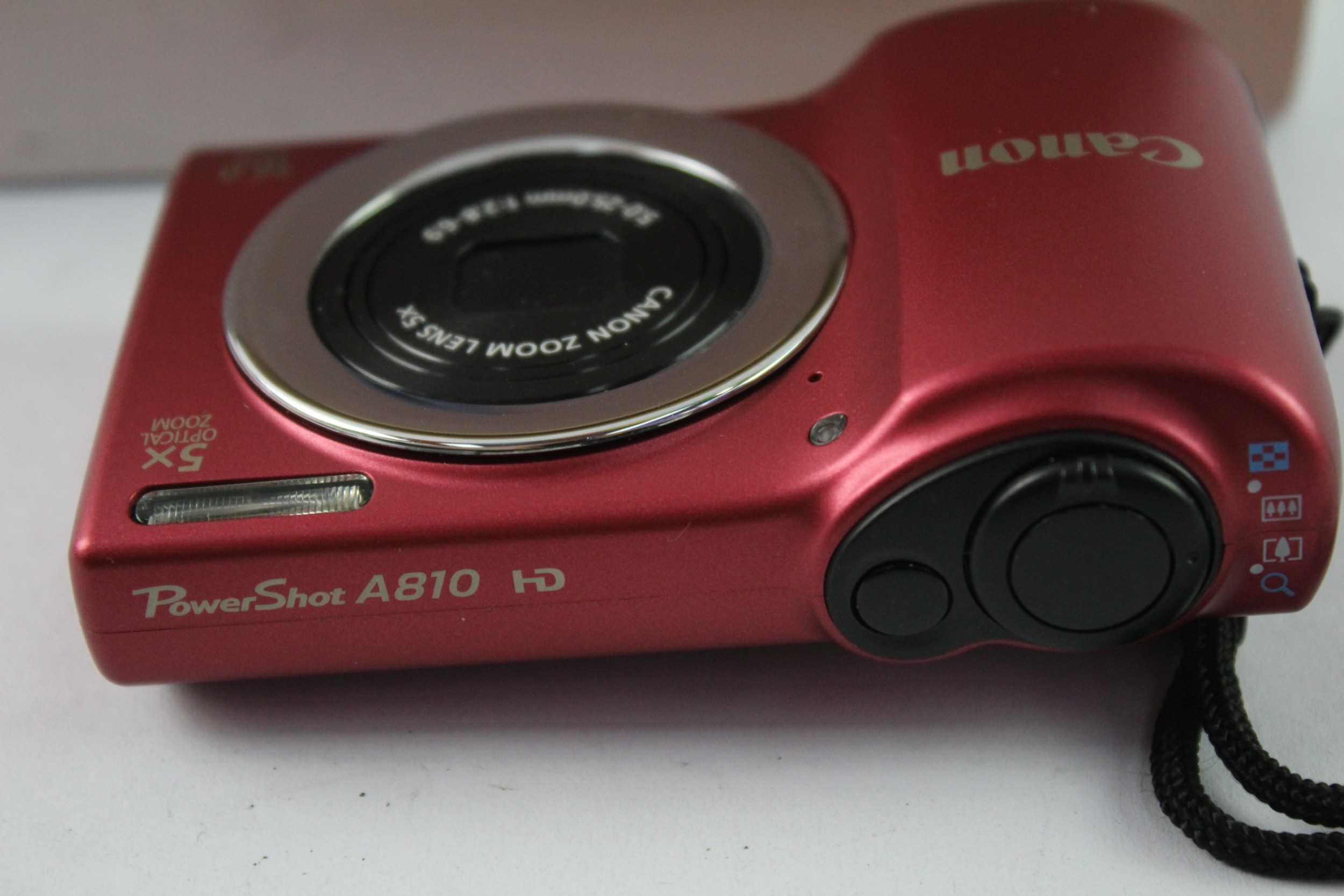 A boxed Canon PowerShot A810 16mp CCD sensor compact digital camera with case, software discs, cable and instruction manual