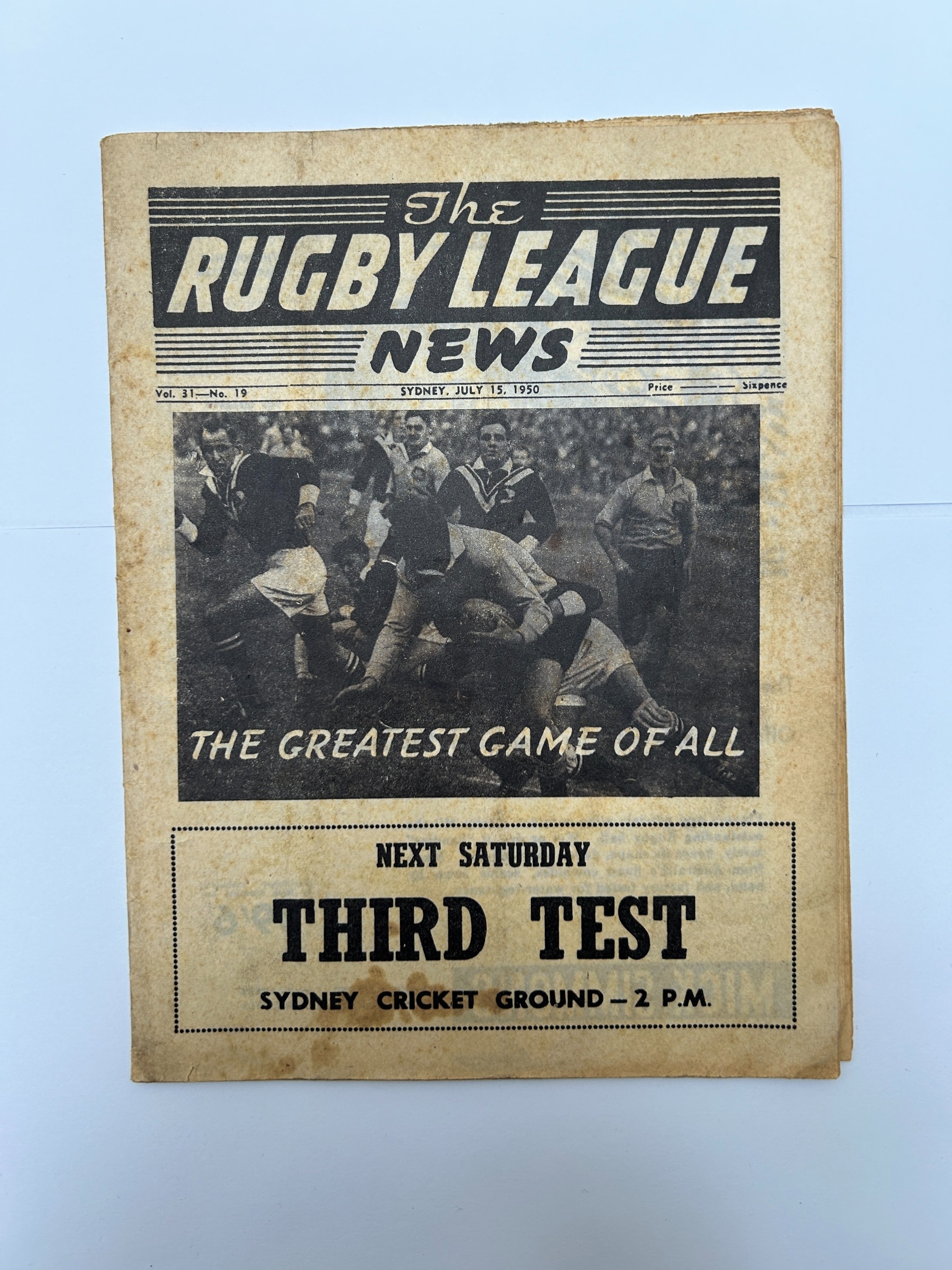 1950 NEW SOUTH WALES VERSUS GREAT BRITAIN RUGBY LEAGUE PROGRAMME, BRITISH LIONS TOUR, 15/7/1950. STAINING SEEN TO COVER, FOXING THROUGHOUT.