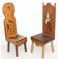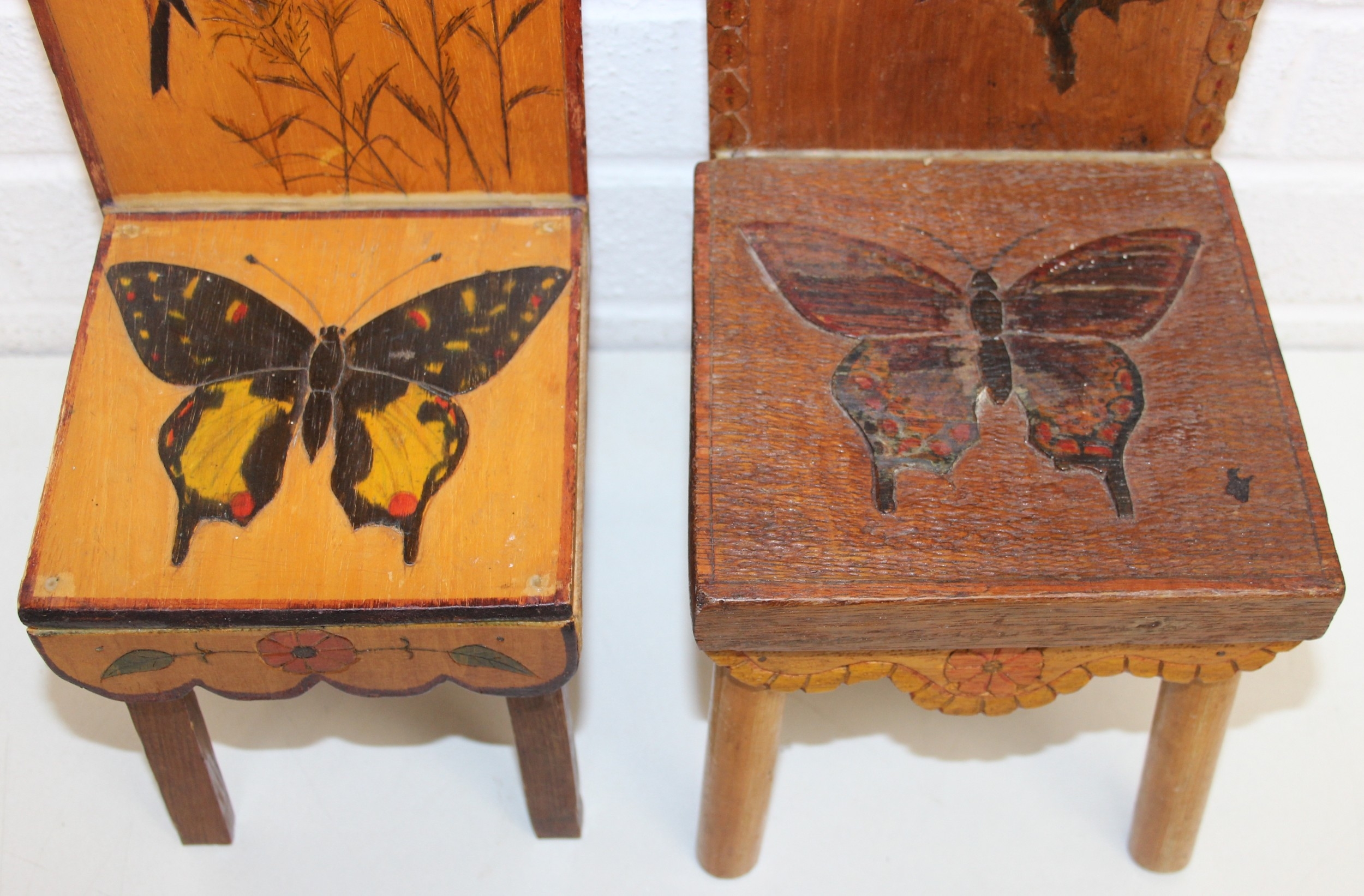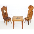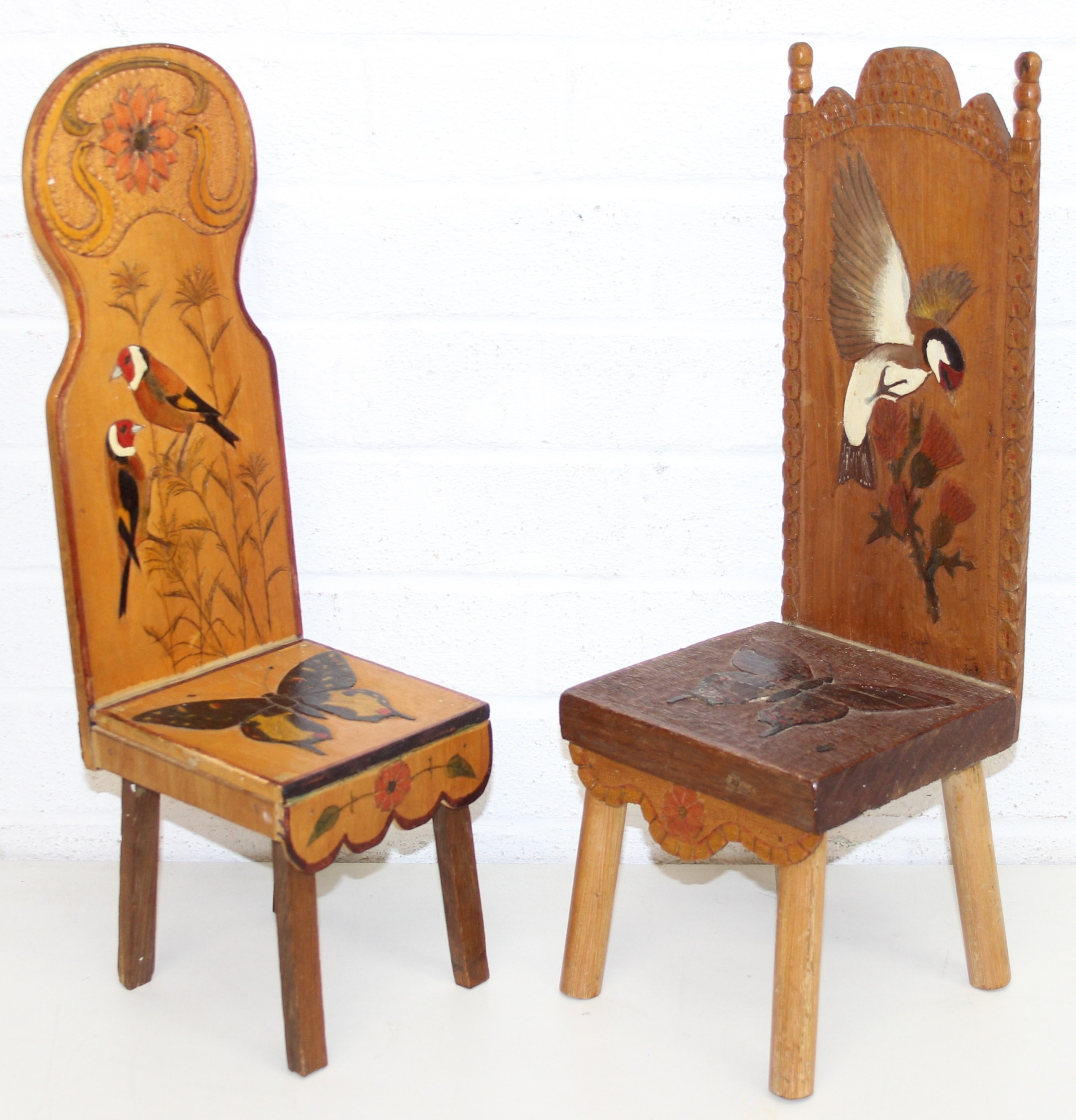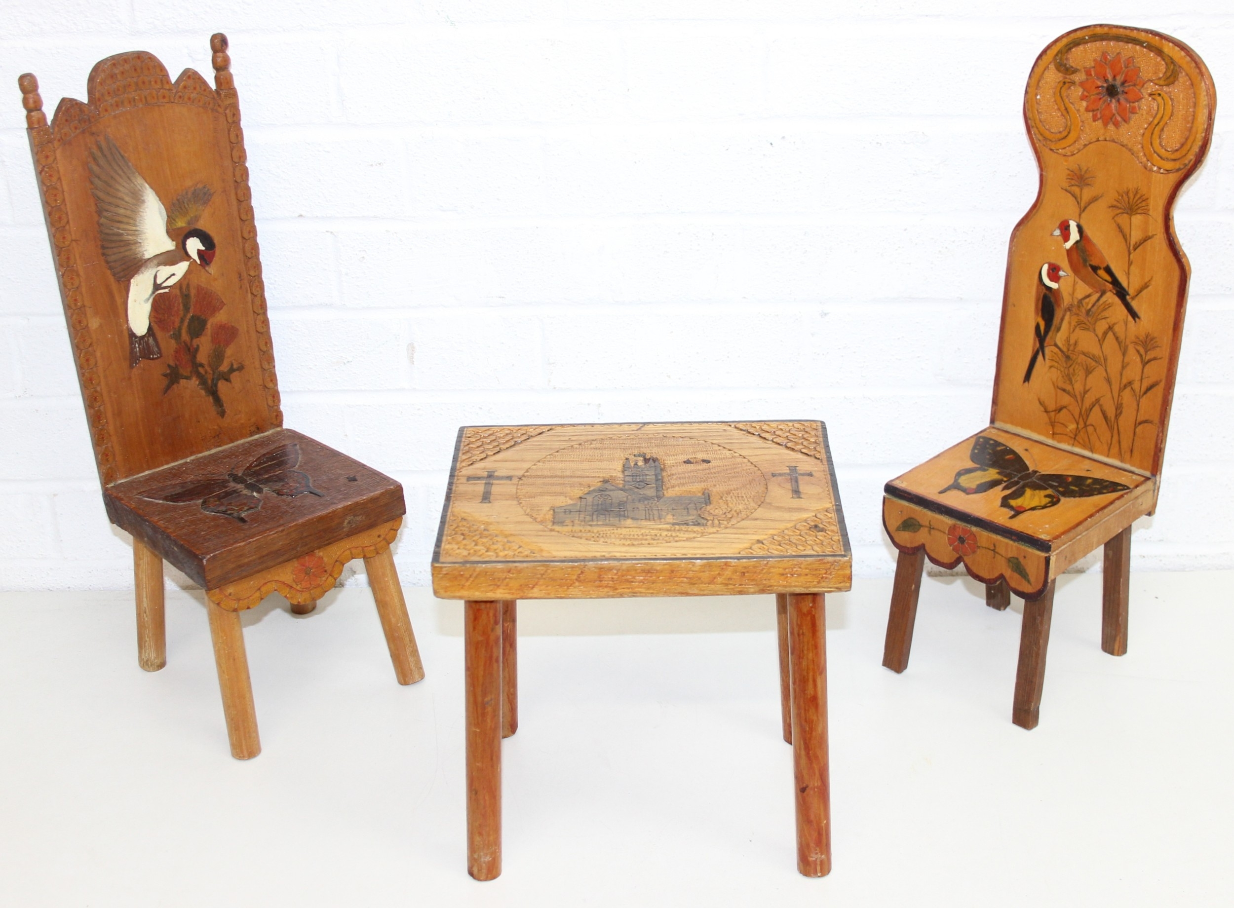 Three vintage pieces of highly decorated scratch-built small furniture or apprentice pieces, to incl two high-backed chairs and a table, the chairs both painted and carved with Goldfinches and butterflies, tallest 50cm [3]