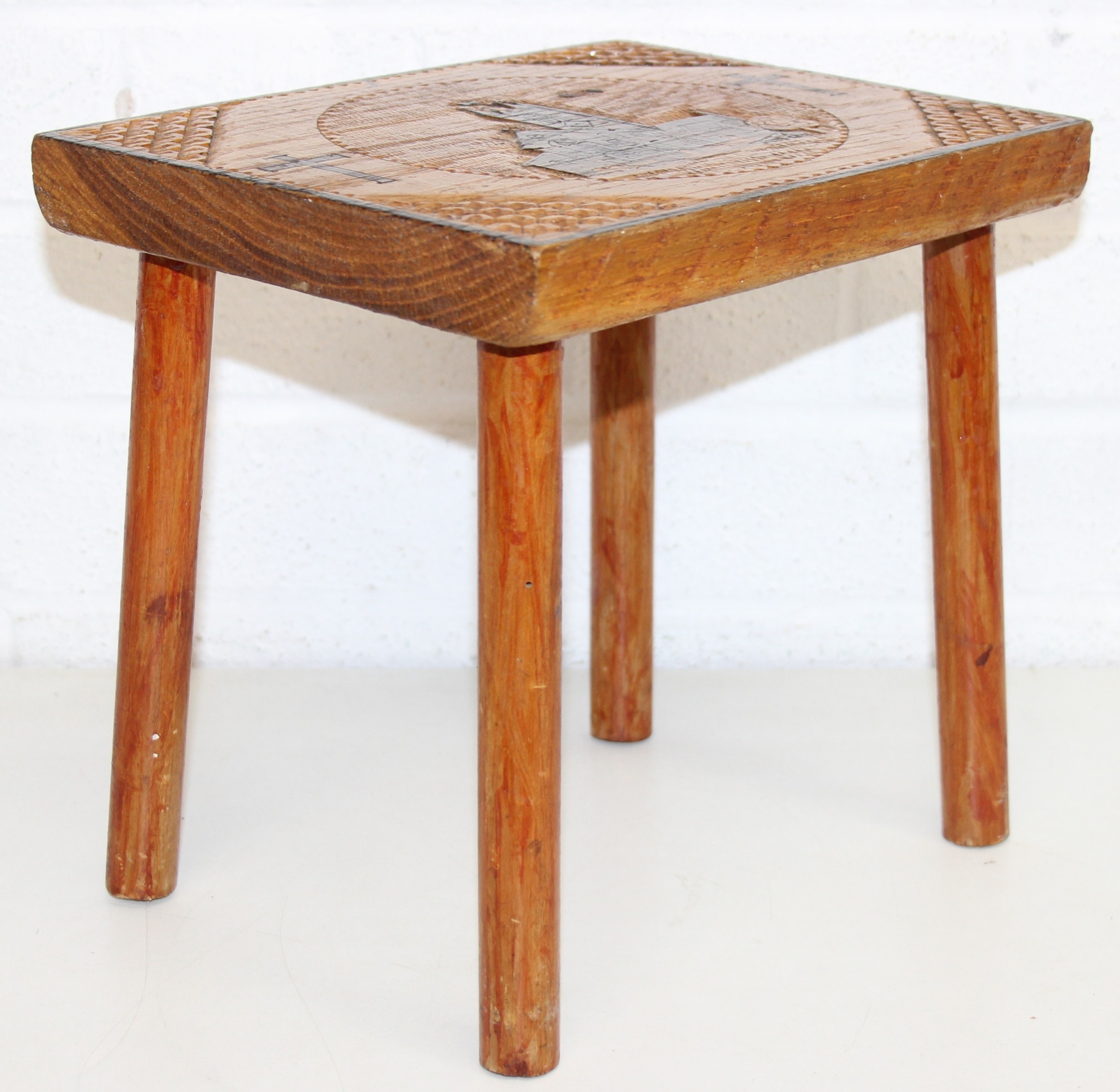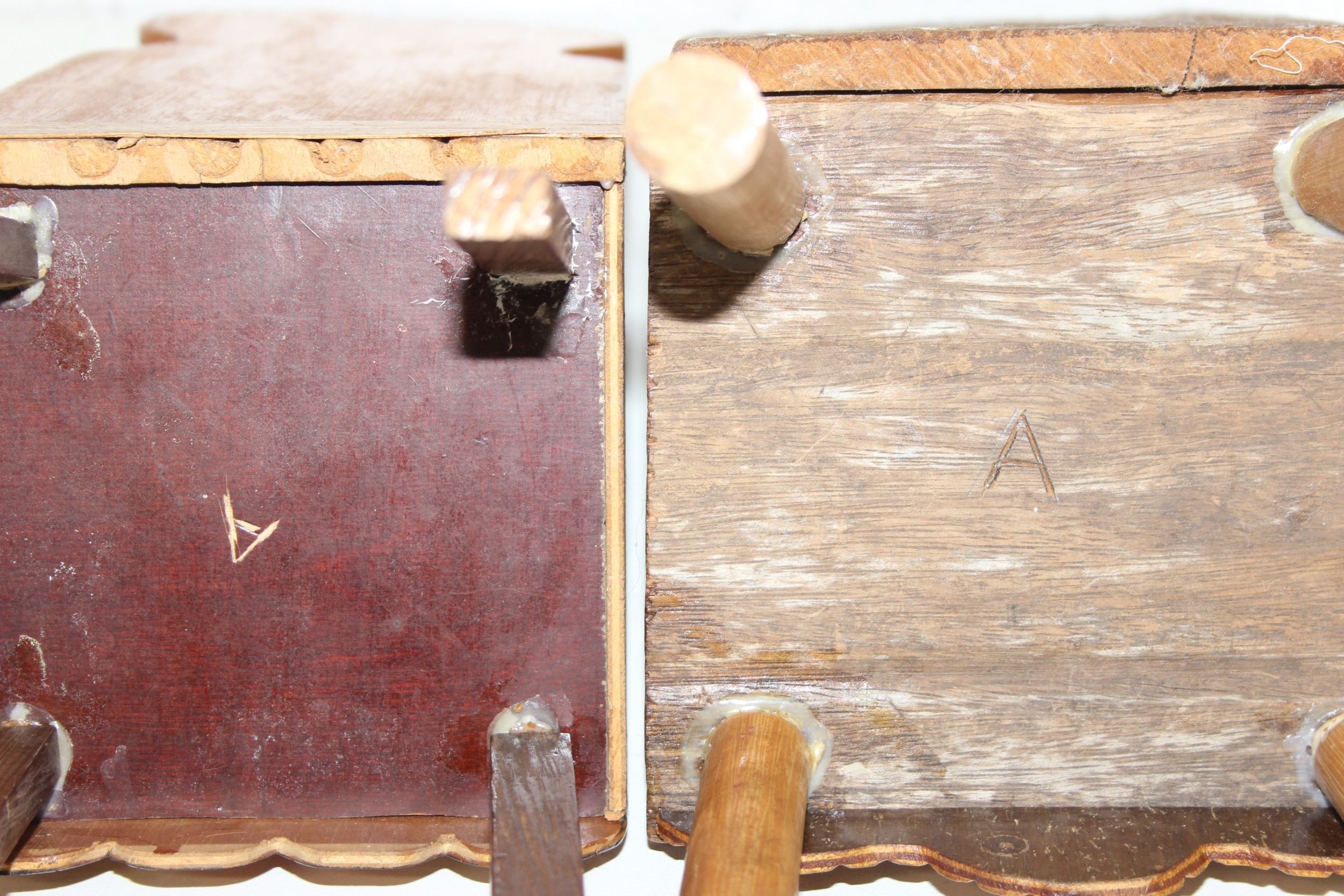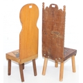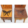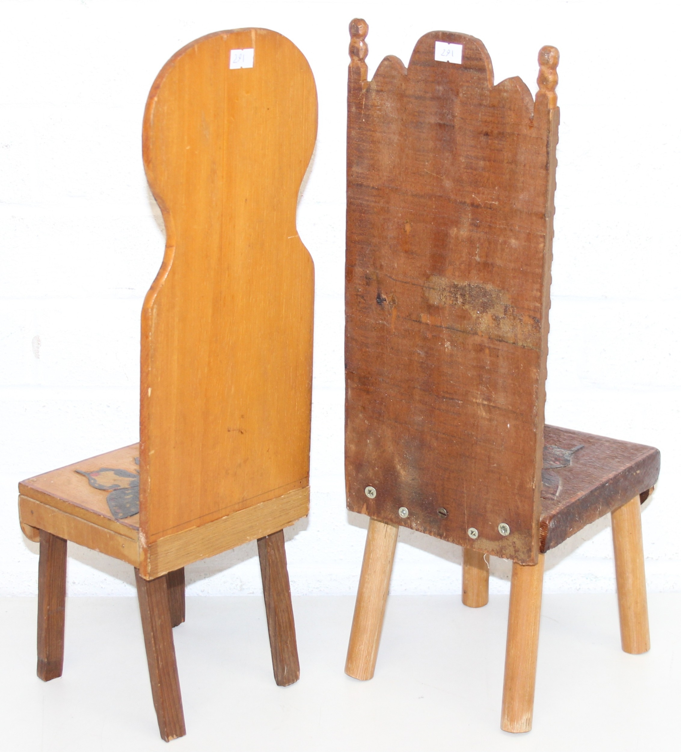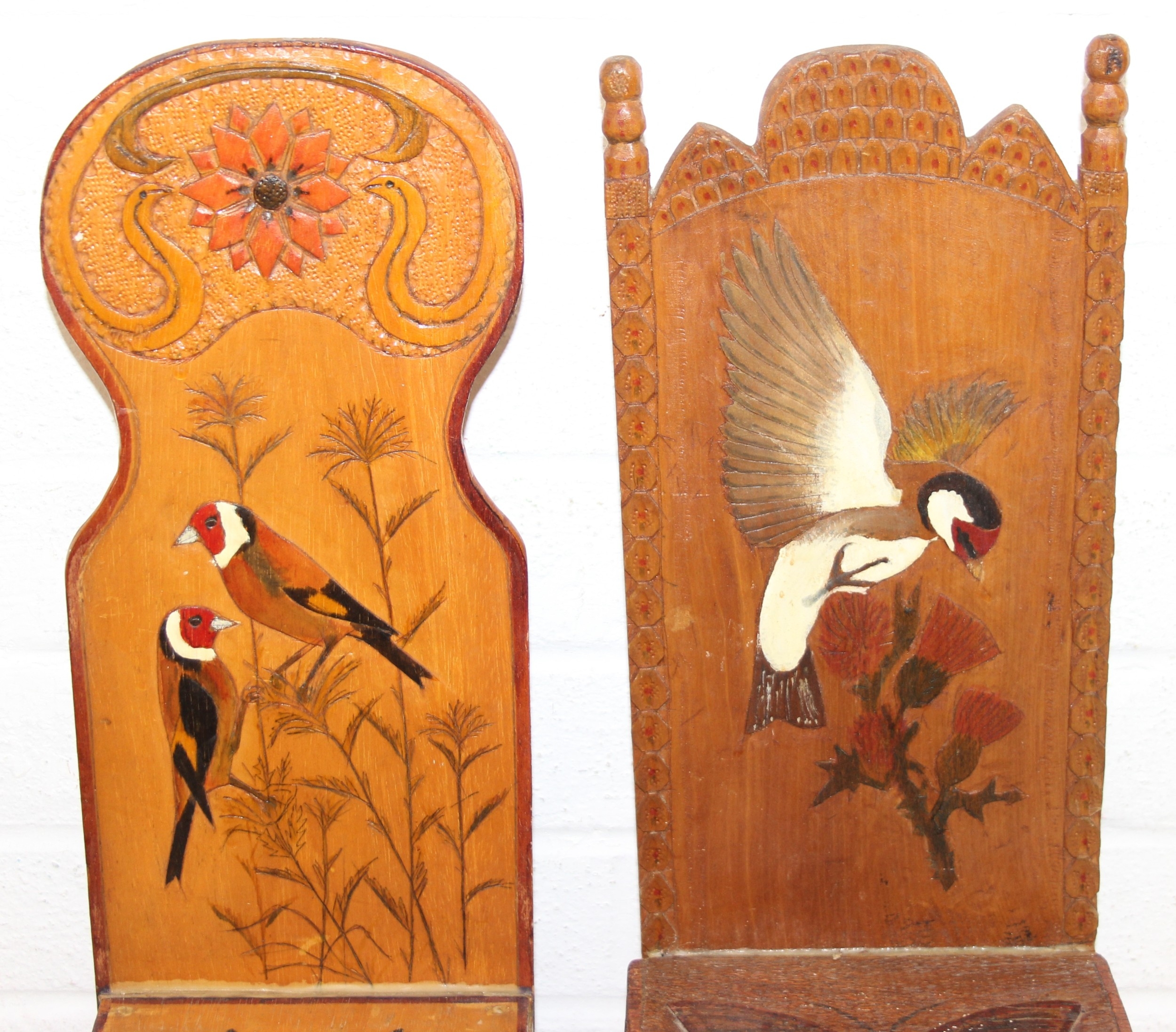Three vintage pieces of highly decorated scratch-built small furniture or apprentice pieces, to incl two high-backed chairs and a table, the chairs both painted and carved with Goldfinches and butterflies, tallest 50cm [3]