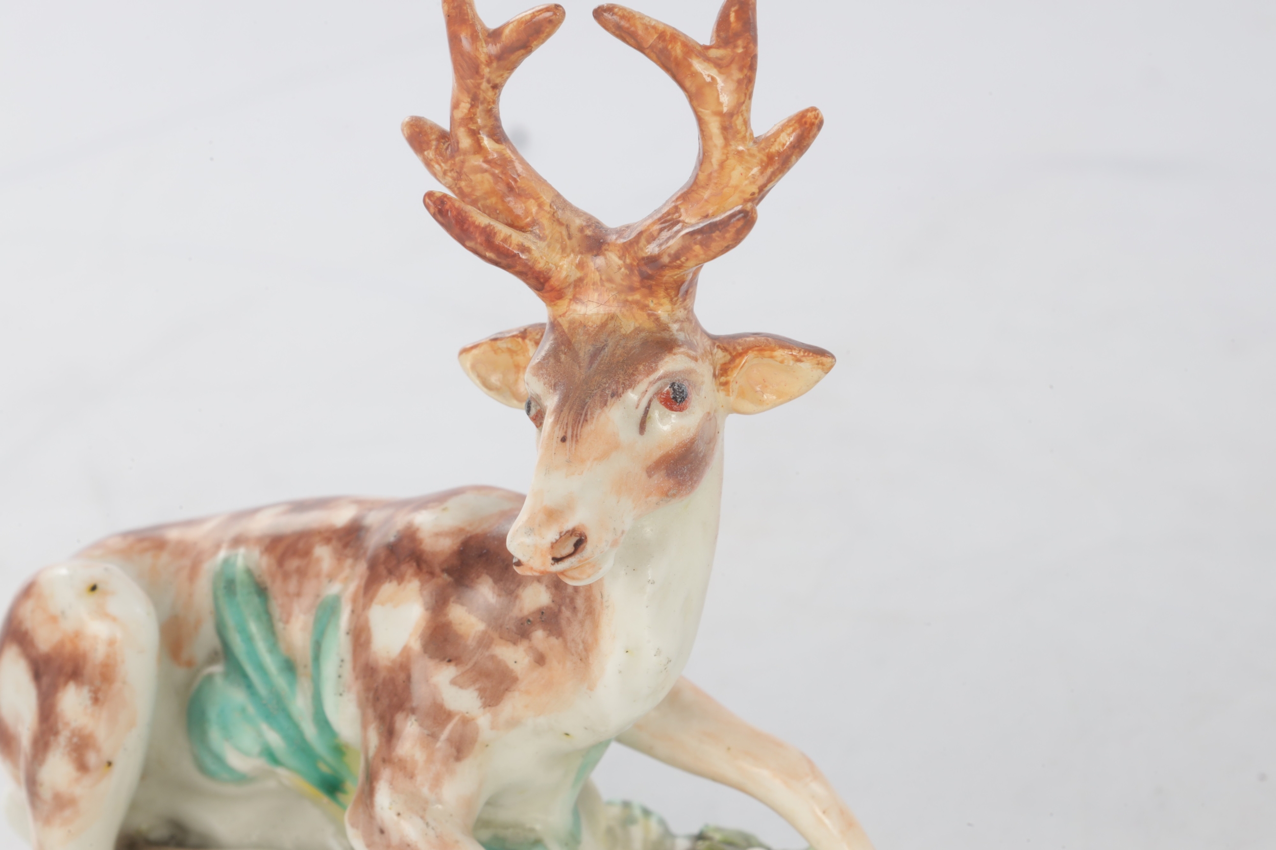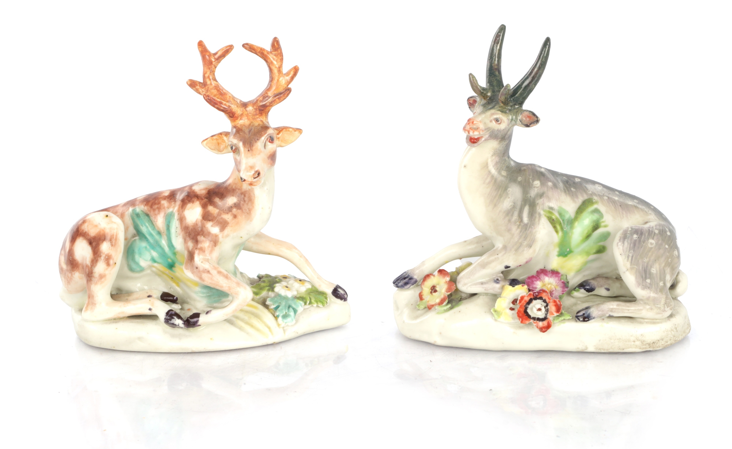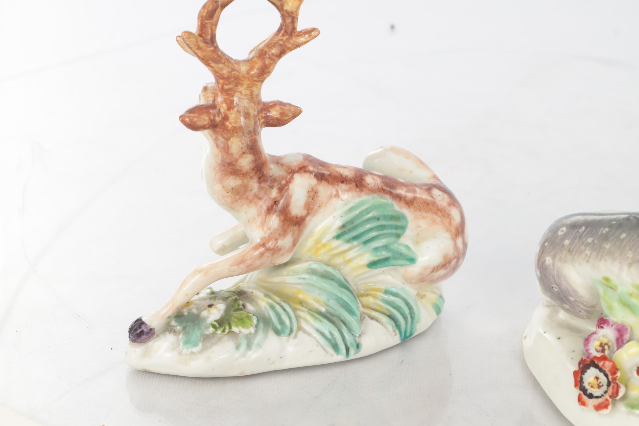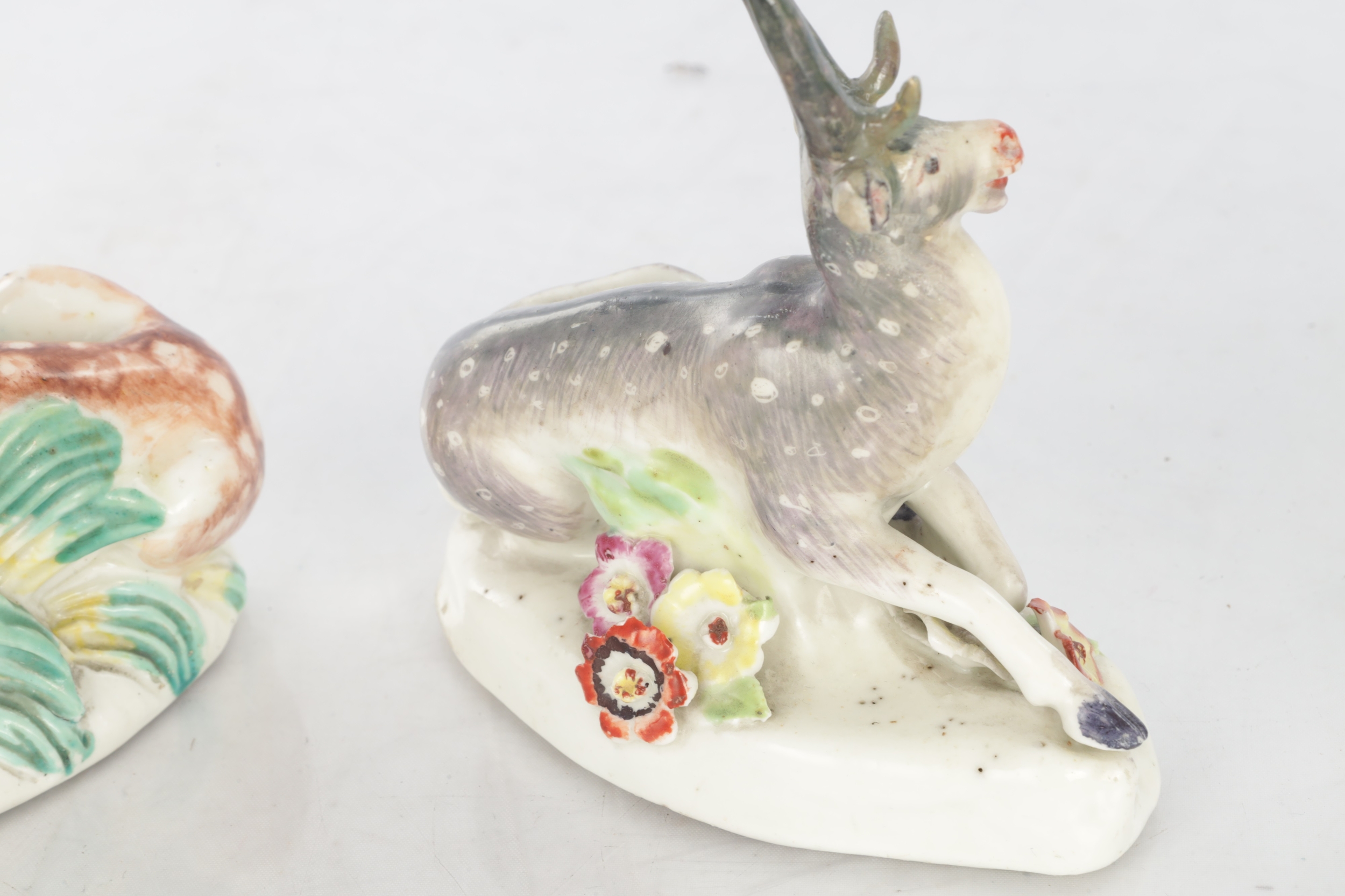 TWO 18TH CENTURY DERBY STAG FIGURES decorated in polychrome colours (10cm high )