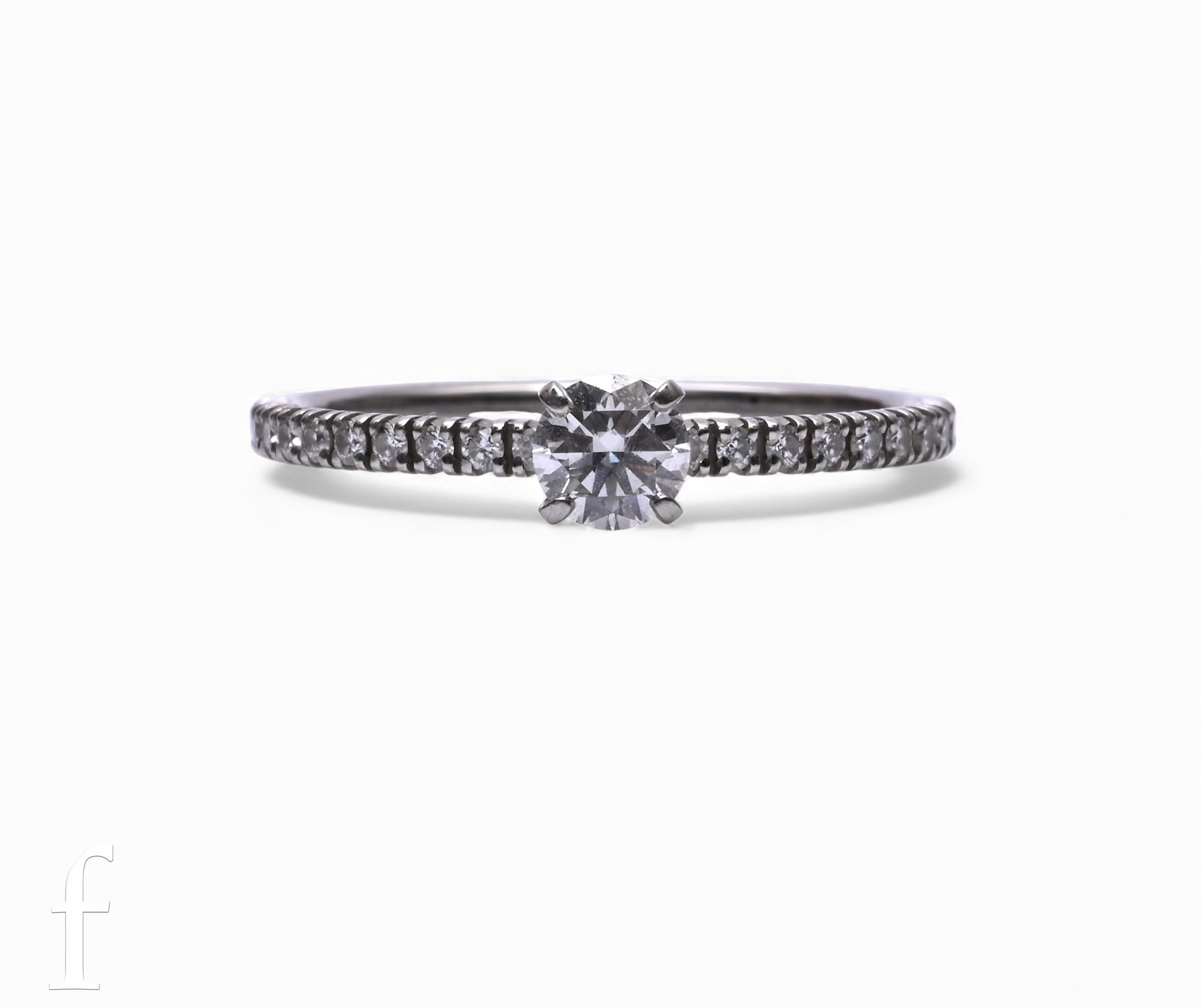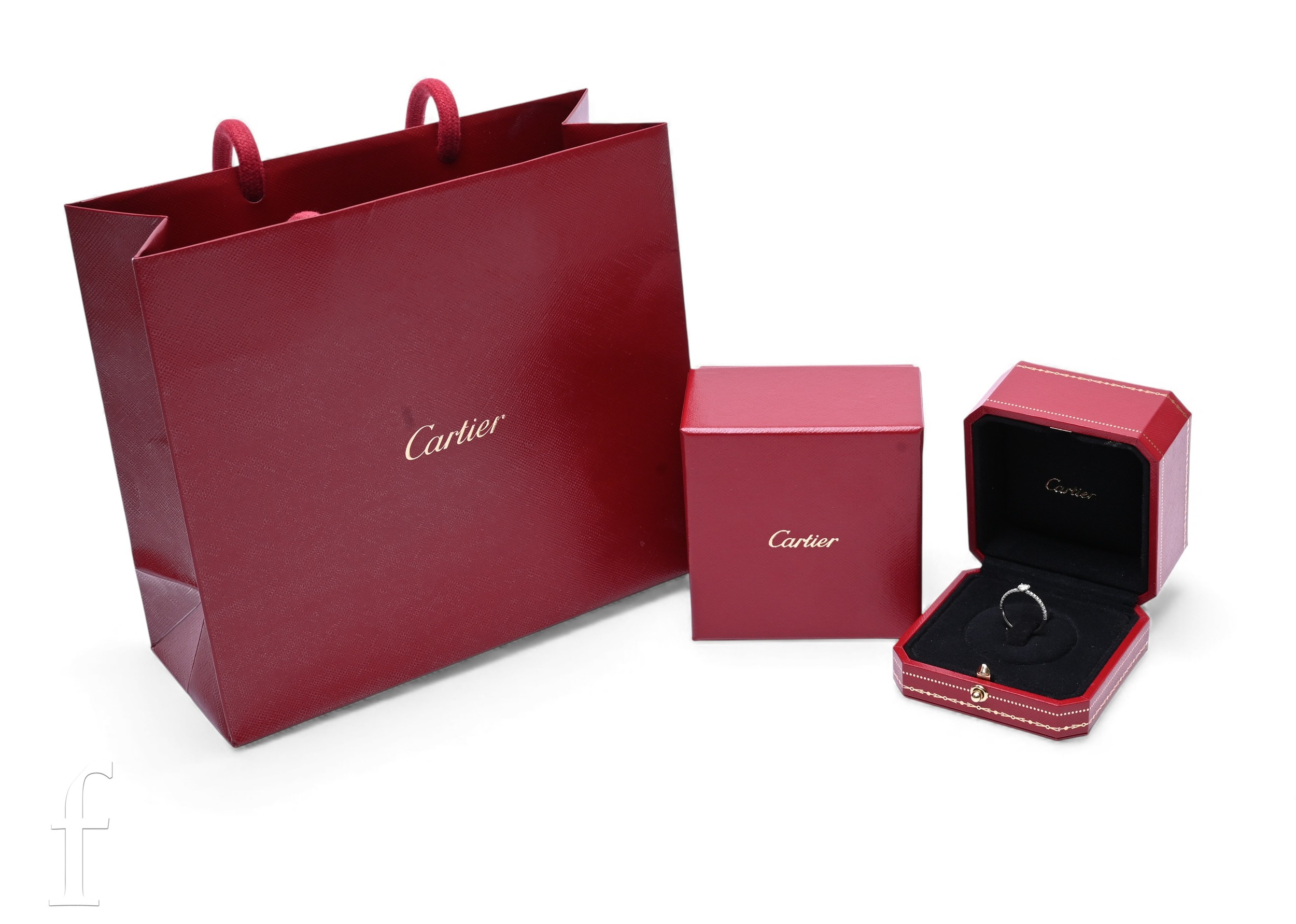 Cartier; A diamond ring, the brilliant-cut diamond weighing 0.23 carats and of D colour between diamond set shoulders, mounted on platinum, marked 'Cartier 0.23 Ct 49 QF D 632 Pt950', total weight 1.7g, ring size J1/2, with box, papers and bag.