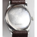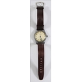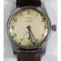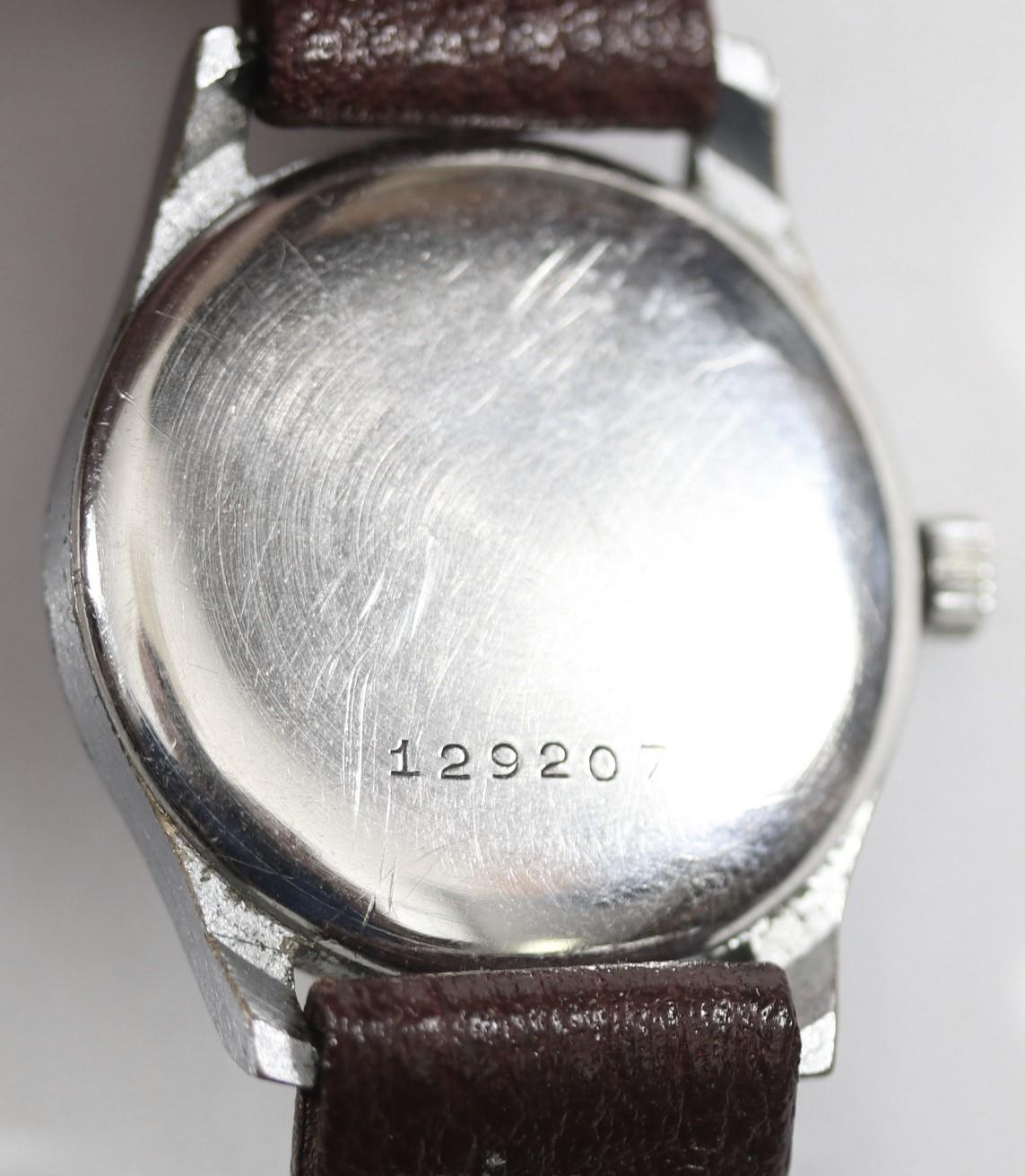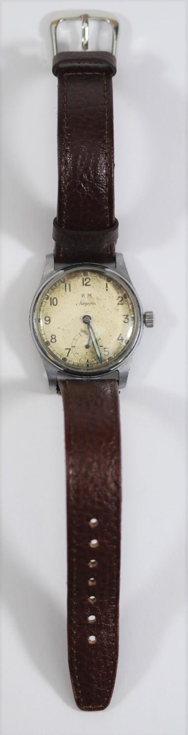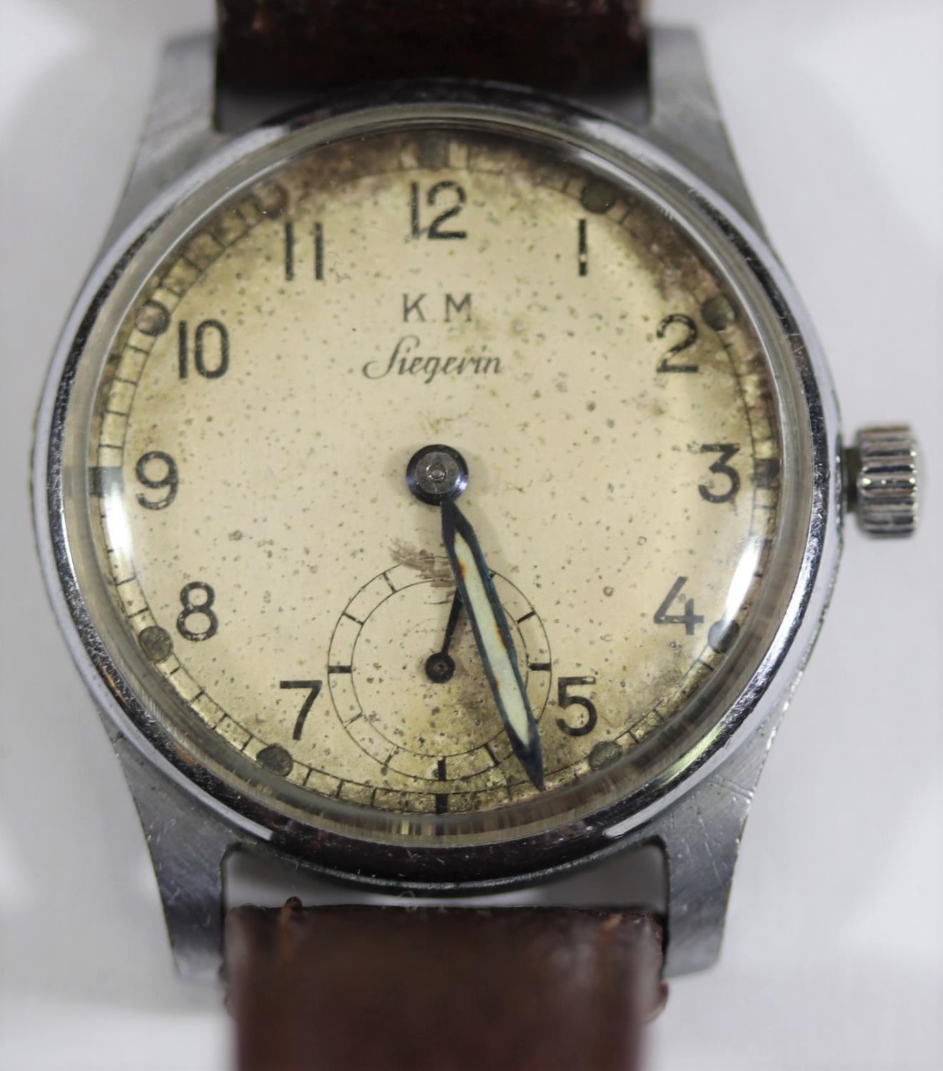 KM marked Siegerin wristwatch. Serial 129207. Plated case, brushed finish, minimal plating wear, 30mm without crown. Fixed bars. Snap caseback, blank except serial externally, marked edelstahlboden on inside. Silvered dial with significant spotting and stains, luminous material on dial markers appears original, hands have been refinished. Marked KM, Siegerin. Alpina 595 (Universal Geneve cal.262) movement, with shock protected balance, generally clean, some marking to movement plates, running condition. Movement retaining ring present. GC