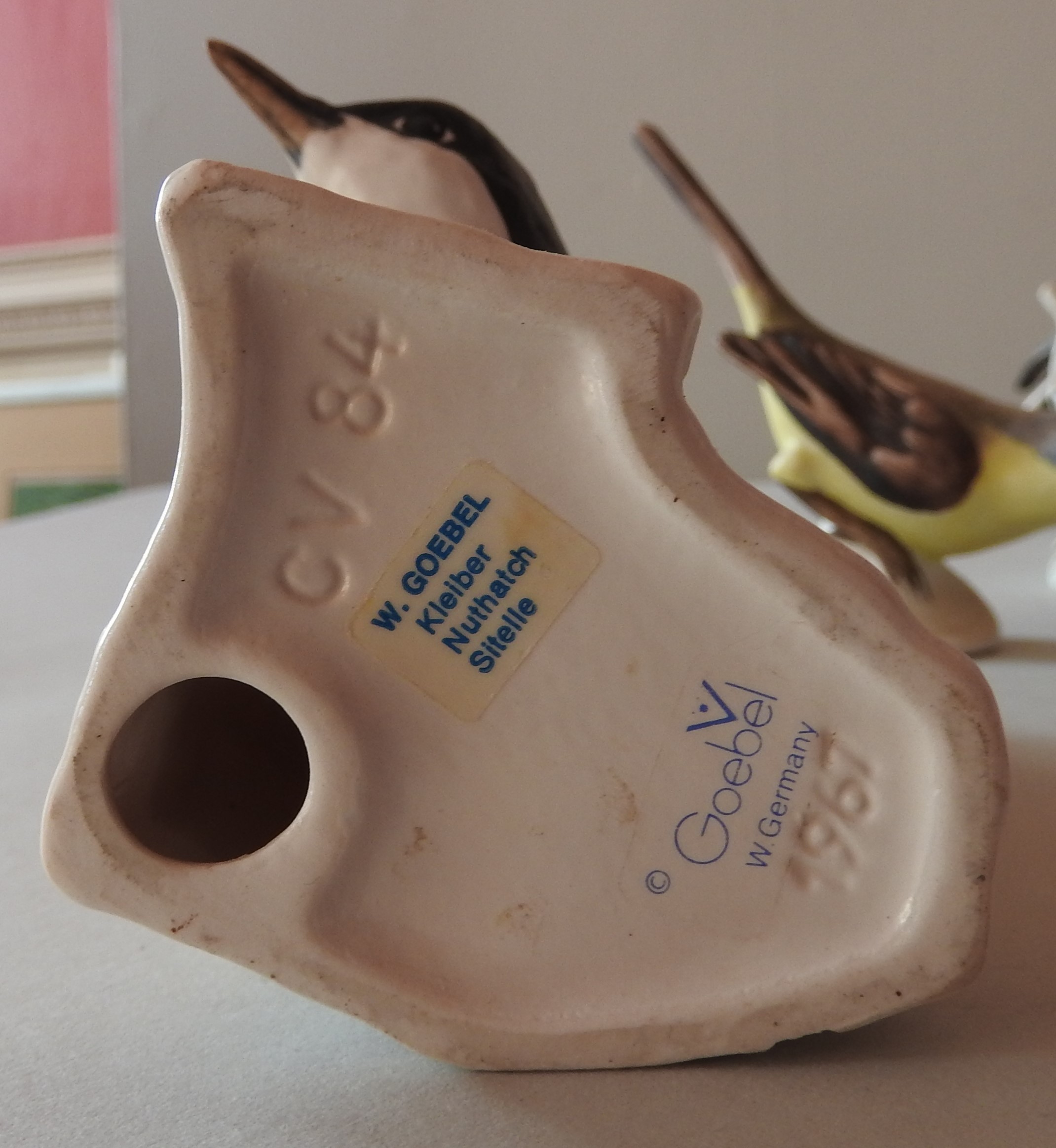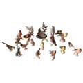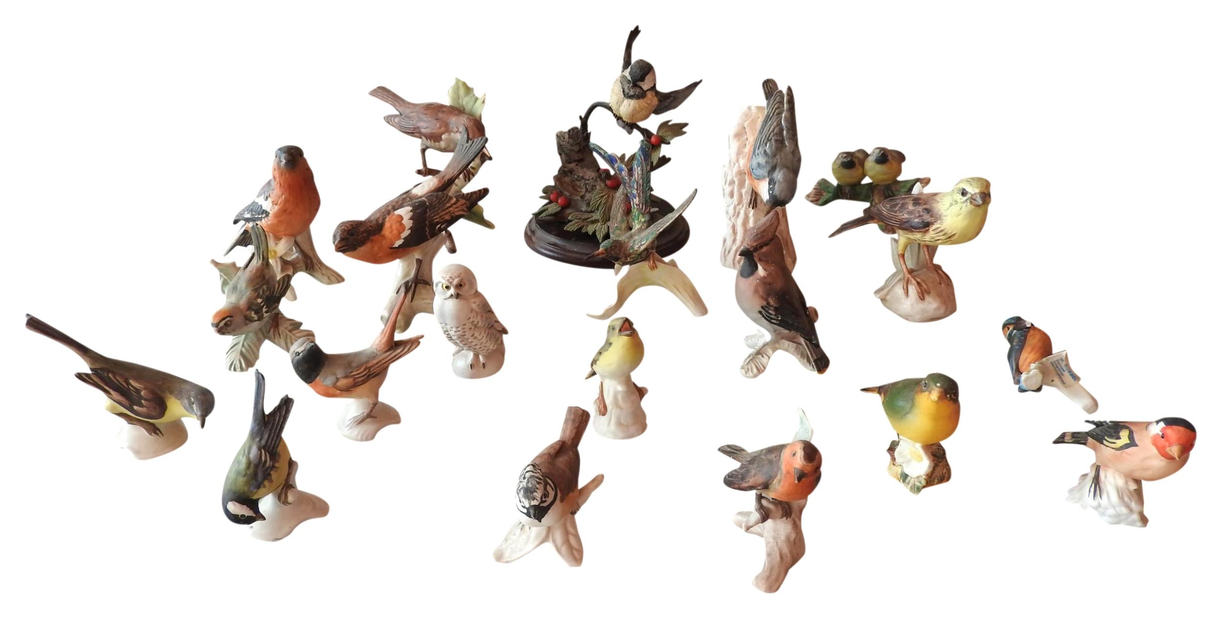 A GROUP OF SEVENTEEN VINTAGE GOEBEL PORCELAIN BIRD MODELS, CIRCA 1960, various species naturalistically modelled perched on branches, along with a Beswick Greenfinch model, an unmarked biscuit porcelain model and a resin model of a blue tit
